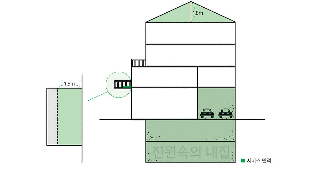 이런 ‘서비스 면적’은 건축법 시행령에 의해 자세히 정의되고 있습니다. 그중 단독주택에 주로 포함되는 부분을 꼽자면 발코니(건물 외벽에서 1.5m 튀어나온 부분까지), 다락(평지붕 높이 1.5m, 경사지붕 높이 1.8m 이하), 필로티 공간, 지상 주차장, 지하층 등을 꼽을 수 있습니다. 바닥면적 차원에서는 단열재까지 포함한 벽 두께의 중간선 안까지 용적률 산정에 포함됩니다.