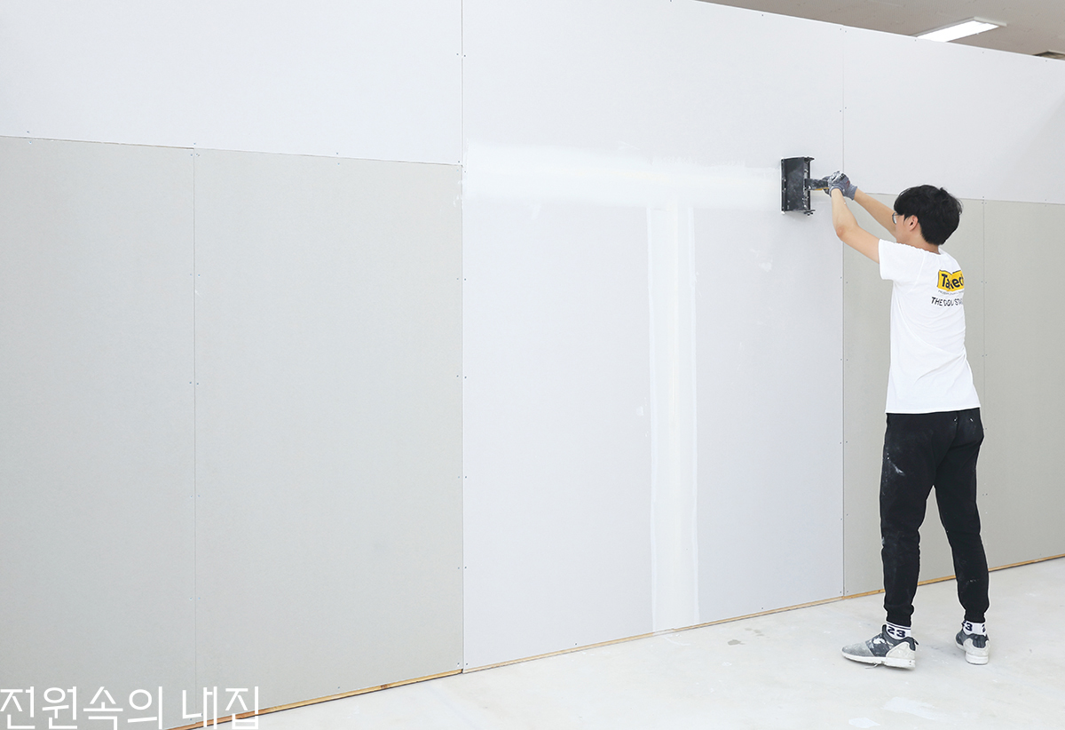 3 - 이음매 주변에 원퍼티 작업을 했다면 볼록해진 부분을 완화시켜주고자 투퍼티, 쓰리퍼티 작업을 한다. 완성도를 높이려면 벽면 전체에 작업하는 올(All)퍼티를 한다.