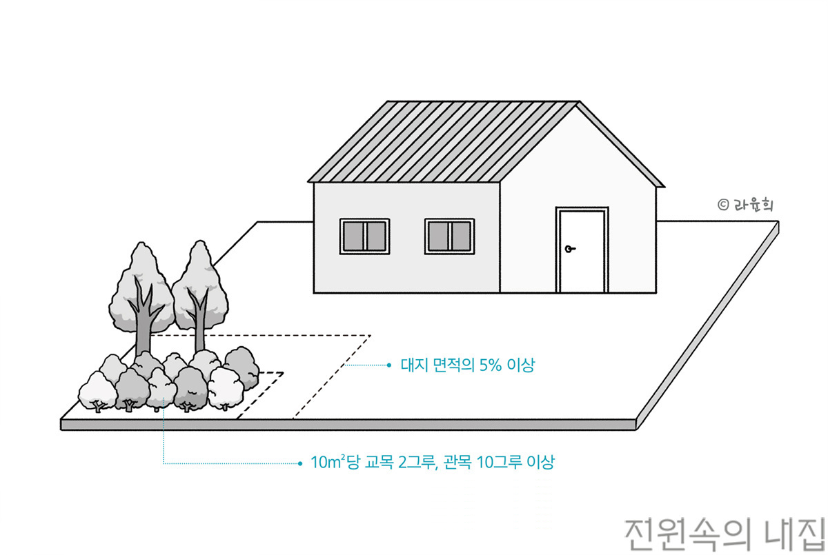 조경은 비슷한 기준을 갖지만, 지역마다 항목이 다릅니다. 따라서 조경면적을 빠듯하게 채워야 하는 상황이라면 해당 지자체의 검토와 전문가의 도움을 받는 것을 권합니다.