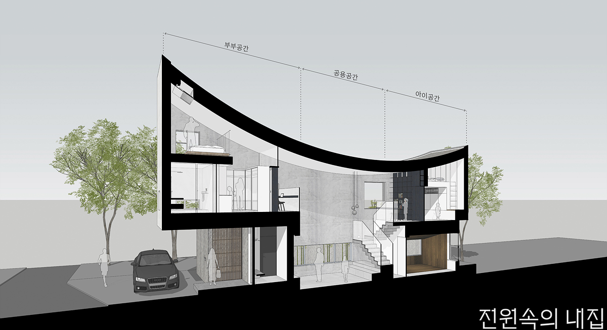 줄곧 아파트에서만 살던 젊은 부부가 갓 돌이 지난 아이와 함께 지내기 위해 설계를 의뢰한 집으로, 내외부 어디서든 세 식구가 편하게 머물 수 있길 원했다.