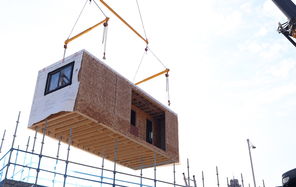 자이가이스트가 밸런스빔을 활용한 ‘상부인양방식’으로 모듈러 주택을 설치하고 있다. 이 방식은 GS건설과 자이가이스트가 공동으로 개발했다. (사진_ 자이가이스트 제공)