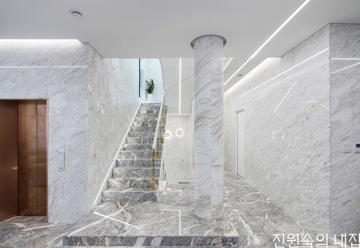 벽과 바닥, 계단 전체를 천연 대리석으로 마감해 화려함의 끝을 보여주는 집. 바닥은 상대적으로 어두운 톤의 대리석으로, 벽은 밝은 톤의 대리석으로 마감해 공간감을 형성했다. 특히 기둥도 벽과 같은 종류의 대리석으로 마감한 것이 특징이다. 기둥 마감은 커브된 대리석을 기둥에 맞게 시공해야 하기 때문에 고난도 작업으로 꼽힌다. ㈜순디자인랩