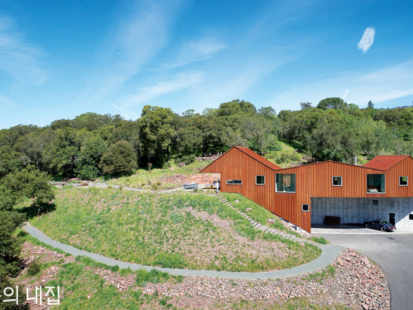 나라마다 집은 다를 수밖에 없다. 기후·문화·제도적 기반과 습관에 차이가 있는데 집이라고 똑같을까. 하지만, 아침에 밥을 먹고 저녁에 가족들과 시간을 보낸 뒤 함께 잠자리에 드는 일상과 소중한 공간을 갖고 싶다는 소망은 어디든 같다. 보편과 개성 사이, 서로 비슷하면서도 다른 환경에서 나오는 특별하고 재밌는 아이디어를 만나보자.Location CA. USA Architect Mork-Ulnet Architects AVERAGE TEMPERATURE 8.2℃(1월) ~ 20.7℃(8월)경사지를 활용해, 두 층 모두 지상으로의 접근이 용이하다. 텃밭에서 딴 작물을 바로 주방으로 가져올 수 있다. 농장 콘셉트의 형태와 요리 실험실로서의 주방미국 뉴욕과 샌프란시스코 등 대도시에서 10년 이상 거주한 부부가 새로운 방식의 삶을 찾고자 캘리포니아 소노마라는 전원지역에 특별한 농가 주택을 지었다. 외딴곳이면서도 넓은 채소밭이 있는 대지에 개인과 지역 사회, 풍경 간의 유기적인 관계를 맺고자 했고, 이 집은 그에 대한 결과물이다.형태적으로는 시골 헛간의 전형적인 건축 양식에서 영감을 받아 세 개의 박공지붕을 나열한 배치를 꾀했으며, 붉은 토양을 연상시키는 녹슨 금속을 지붕과 벽에 적용, 농장의 느낌을 극대화했다.지역 고유의 붉은 토양에서 영감을 받아 외장재는 시간이 지날수록 매력을 더하는 코르텐 강판을 사용했다. 큰 캔틸레버 처마는 야외로 확장되어 더운 소노마 태양으로부터 그늘과 휴식을 만들어준다. Site & Plansiteplan1. 주차장 2. 현관 3. 사무실 4. 다목적실 5. 주방/식당 6. 데크 7. 거실 8. 침실 9. 욕실 10. 드레스룸역동적으로 구부러진 흰색 난간이 인상적인 계단실 마스터베드룸은 유리문을 달았다.현관부와 주차장, 사무실 등 외부적인 성격의 공간이 1층에 위치한다면, 경계 없이 물 흐르듯 자연스럽게 이어지는 2층은 주방, 거실, 침실 영역으로 나눠 세 개의 지붕을 하나씩 맡고 있다. 계단실을 통해 2층으로 올라오면 집의 중앙인 거실이 나오는데, 완만한 언덕과 숲, 농장의 전망을 감상하는 최고의 뷰포인트다.외부와 대조적인 내부. 전체적으로 단순하면서도 밝은 소재로 꾸미되, 따뜻함과 촉감을 더하기 위해 파스텔톤 가구와 원목마루를 적용했다. 침대에 누우면 인접한 라운지 풍경까지 감상할 수 있다.부부만의 휴식 공간이자 마을 커뮤니티 성격의 요리 실험실이 공존하는 널찍한 주방과 다이닝룸은 실내에서 단연 압권이다. 내부공간이 확장된 듯 지붕이 이어지는 외부 데크는 비 오는 날에도 분위기 있는 시간을 가질 수 있게 하며, 텃밭까지 산책로를 연결해 다양한 쓰임새로서의 역할을 도모한다. 여기에 접근성 좋은 맞춤형 가구와 다이닝룸을 바라보는 아일랜드, 수납력 좋은 팬트리까지 갖추어 친구들과의 단란한 식사는 물론, 쿠킹 클래스도 기대할 수 있게 되었다.부부의 꿈이 실현된 주방. 수년간 수집한 접시와 도구들, 유리 제품을 저장하는 팬트리와 호두나무 우드슬랩, 두 개의 야외 테이블 등을 갖추었다. Section & ElevationSectionElevation1. 주차장 2. 현관 3. 사무실 4. 다목적실 5. 주방/식당 6. 데크 7. 거실 8. 침실구성_ 조성일 | 사진_ Bruce Damonte취재협조_ Mork-Ulnet Architects [www.morkulnes.com]ⓒ월간 전원속의 내집 / Vol.253 www.uujj.co.kr