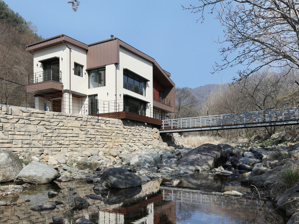 자연에 안긴듯한 경기도 양평 어느 시골 마을. 시냇가 옆, 여유롭지만 꼼꼼하게 지은 집이다.‘나의 살던 고향은 꽃피는 산골’양평 시내에서 제법 들어가 닿은 골짜기에서 누구든 한 번쯤 되뇌어 봤을 가사를 그대로 옮겨놓은 듯한 주택을 만났다. 맑은 시냇가와 흐드러지게 핀 벚꽃이 어우러진 이민형, 양정아 씨 부부의 전원주택이다.“부모님이 25년 차 베테랑 전원생활자예요. 그래서 주말마다 양평을 오갔죠.” 계기라기보다는 언제부턴가 자연스럽게 주택을 지어야겠다는 생각했다는 정아 씨. 피곤한 도시에서 벗어나 시간 날 때마다 아버지 집을 찾아 쉬는 일이 일상이었고, 남편과 아이들도 아버지 집에서 전원생활에 대한 로망을 키워갔다. 그러던 어느 날 건설업을 오랫동안 해온 엔지니어인 아버지는 본인 주택의 건너편 부지에 집짓기를 권유했고, 필연처럼 가족은 집짓기에 발을 내디뎠다.현관문 위로 길게 뻗은 포치가 비오는 날 등 출입 편의를 더한다.단정하게 정리된 주택 후면. 담장으로 큐블록을 적용해 단조로움을 피했다.PLAN1F – 109.02㎡ / 2F – 84.96㎡ / ATTIC – 46㎡ // ①현관 ②거실 ③주방 ④식당 ⑤복도 ⑥침실 ⑦욕실 ⑧다락 ⑨다용도실 ⑩보일러실 ⑪테라스HOUSE PLAN대지위치 ▶ 경기도 양평군 대지면적 ▶ 549㎡(166.36평) | 건물규모 ▶ 지상 2층 | 거주인원 ▶ 4명(부부 + 자녀 2) 건축면적 ▶ 130.16㎡(39.44평) | 연면적 ▶ 193.98㎡(58.78평) 건폐율 ▶ 23.84% | 용적률 ▶ 35.53% 주차대수 ▶ 2대 | 최고높이 ▶ 9.3m 구조 ▶ 기초 – 철근콘크리트 매트기초 / 지상 – 철근콘크리트구조 단열재 ▶ 경질우레탄보드, 비드법보온판, 열반사단열재 외부마감재 ▶ 외벽 – 동국세라믹 점토벽돌 앙고라 화이트, 고밀 목재패널 / 지붕 – 포스맥 레드 징크늄 S140 담장재 ▶ 두라스택 Q블록 창호재 ▶ 이건창호 삼중 로이 복층유리 시스템창호 조경석 ▶ 현무암 판석 전기·기계 ▶ 일진전기 설비 ▶ 유진설비 설계 ▶ 아원건축사사무소 감리 ▶ 강신관 건축사 시공 ▶ 에그로건축디자인 010-6377-6255뒷마당으로 통하는 문은 매스를 크게 파고 그 안을 붉은 빛에 가까운 브라운톤 고밀도목재패널을 적용해 강한 인상을 남긴다.개방감이 느껴지는 주택의 거실. 콘크리트 구조로 계획되었던 계단은, 바깥 풍광을 방해없이 조망하기 위해 선이 얇은 금속과 강화유리로 변경했다. 시공을 맡은 에그로건축디자인 이정빈 대표는 “건축주는 공정을 꼼꼼히 확인하면서도, 전적으로 믿어줬다”며 “오히려 기초 토목공사 등 경험에서 나오는 조언에 많은 것을 배우기도 했다”고 지난 과정을 소회했다. 양평의 기후를 반영해 주택은 내·외단열 모두 신경 썼고, 내·외관뿐만 아니라 보일러, 지하수펌프, 스테인리스 스틸 물탱크 등 변수 많은 전원생활에 대비해 기간 설비에 적잖은 투자를 했다. 설계 시작하는 날부터 매주 토요일 아침마다 모였다는 건축주와 시공사. 10여 개월간 이어진 모임은 지난 4월에 막 끝이 났다.시공 POINTPOINT 1. 데크 방충망데크 아래는 어둡고 습해 벌레들의 온상이 되기 십상이다. 데크재 아래 방충망을 깔아두면 벌레 상당수를 차단할 수 있다.POINT 2. 다락 계단2층 복도 초입에는 가족 독서실로 쓰이는 다락 계단이 놓였다. 부족한 계단 면적을 극복하기 위해 계단판을 엇갈리게 가공했다.물이 귀한 봄에도 집 앞 시냇가는 풍부한 수량의 풍광을 자랑한다.주택은 남북으로 긴 대지에 직사각형 형태로 앉혀졌다. 아이보리 컬러의 벽돌과 브라운톤의 컬러강판이 화사하면서도 단정한 외관 분위기를 연출한다. 매스를 밀어 넣어 형성된 면에 선명한 톤의 고밀도목재패널은 단정한 외관의 포인트다. 마당으로 들어오면 규모를 여유롭게 잡은 2층 테라스와 포치를 볼 수 있고, 주택 동측면의 넓은 데크와 친정으로 이어지는 다리를 놓았다.현관문을 열고 실내로 들어서면 가장 먼저 긴 수납장으로 형성된 복도 형태의 주방을 만나게 된다. 수납장 벽을 넘어 거실에서 가장 먼저 눈에 띄는 것은 큰 창을 통해 보이는 풍경과 오브제처럼 중앙에 자리 잡은 계단. 계단 옆에 형성된 벽을 돌아 안쪽에는 현관과 거실의 북적함에서 살짝 벗어나 식당과 주방이 아늑하게 놓였다.SECTION①현관 ②거실 ③주방 ④식당 ⑤복도 ⑥침실 ⑦욕실 ⑧다락 ⑨다용도실 ⑩보일러실 ⑪테라스INTERIOR SOURCE내부마감재 ▶ 벽 - 던에드워드 친환경 페인트도장, 자작나무 합판 / 바닥 – 강마루 리네 터치라이트 그레이, 인조대리석 스타론 아스펜스노우 욕실 및 주방 타일 ▶ 인조대리석 스타론, 백색 유광타일 수전 등 욕실기기 ▶ 대림바스 양변기, 세면기, 수전 / 바스코리아 프리스탠딩 욕조 주방 가구 및 붙박이장 ▶ 제작 조명 ▶ 종합전기㈜, 리움조명 | 버티컬 ▶ 더좋은창 계단재·난간 ▶ 철과나무이야기(티크 집성목 + 평철 난간 + 강화유리) 현관문 ▶ 코렐도어 독일식 현관문 | 중문 ▶ ㈜이노핸즈 방문 ▶ 자작나무 합판 + 도무스 도어핸들 데크재 ▶ 방부목 위 씨라데코 오일스테인주방 옆 복도는 별도의 창고를 두기보다 가벽으로 활용하면서 수납을 확보하려는 의도였다. 중간에 턱을 둬 현관에서 주방이 바로 보이지 않게 했다.현관문을 열