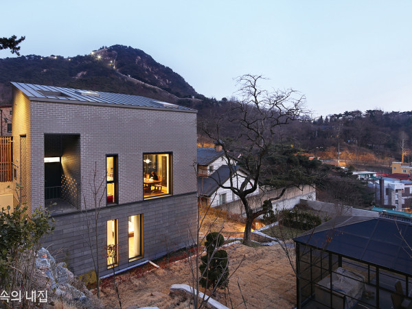 갑갑했던 도심 생활에서 근사한 자연과 마주할 수 있는 집을 갖는다는 것. 그렇게 집은 가족에게 더없이 편안한 안식처가 되어준다.도로 쪽 입면에는 유동 인구로부터 사생활을 보호받을 수 있는 장치를 계획해야 했다. 따라서 목재 루버를 통해 시선을 어느 정도 가릴 수 있는 대문 및 담장을 설치했다. 건축주에게는 오래전 부모님으로부터 물려받은 풍경 좋은 대지가 있었다. 늘 이곳에 마당 있는 주택을 지어 살길 원했지만, 집을 건축할 용기를 내는 것조차 쉬운 일은 아니었다고.“오팔(OPAL) 세대답게 신중년에 인생의 제2막을 새롭게 시작해보려고 어렵게 결단을 내렸어요. 아파트 생활을 선호하는 아내를 설득하기도 만만치 않았죠(웃음). 하지만, 바쁘게 앞만 보고 살아온 지난 시간을 뒤로 하고, 우리 부부의 삶에 온전히 집중하는 그런 집을 갖고 싶었습니다.”문화 분야에서 일하고 있는 그는 평소 잘 알고 지내던 디자이너를 통해 mlnp architects 이명호 소장을 소개받았다. 건축주의 이야기를 경청해주고 원하는 바를 반영하기 위해 노력하는 모습은 ‘내가 원하는 집을 훌륭하게 구현해 줄 건축가’란 확신이 들기 충분했다.PLAN①현관 ②거실 ③침실 ④욕실 ⑤창고 ⑥미디어룸 ⑦보일러실 ⑧발코니 ⑨드레스룸 ⑩세탁실 ⑪야외 미디어가든 ⑫수공간 ⑬마당 ⑭테라스 ⑮주방/식당 ⑯다용도실 ⑰주차장 ⑱서재HOUSE PLAN대지위치 ▶ 서울시 종로구 대지면적 | ▶ 420.30㎡(127.14평) | 건물규모 ▶ 지상 2층 | 거주인원 ▶ 2명(부부) 건축면적 ▶ 207.83m2(62.86평) | 연면적 ▶ 297.34㎡(89.94평) 건폐율 ▶ 49.45% | 용적률 ▶ 70.74% 주차대수 ▶ 2대 | 최고높이 ▶ 8.72m구조 ▶ 기초 – 철근콘크리트 매트기초 / 지상 – 철근콘크리트(벽), 콘크리트 슬래브(지붕) 단열재 ▶ 벽 – THK120 압출법보온판(외단열), THK30 열반사단열재(내단열) / 지붕 – THK220 압출법보온판외부마감재 ▶ 외벽 – 치장벽돌쌓기, 지정석재 마감 / 지붕 – THK0.5 컬러강판 담장재 ▶ THK40 적삼목루버 | 에너지원 ▶ 도시가스창호재 ▶ 이플러스 시스템창호 + 갈바후레싱조경석 ▶ 화강석 전기·기계·설비 ▶정연엔지니어링 | 토목 ▶보강엔지니어링 구조설계(내진) ▶드림구조 시공 ▶ 동아A&C https://dongaanc.com 설계 ▶ ㈜엠엘앤피아키텍트 건축사사무소(mlnp architects)환기와 채광을 중요하게 생각하는 건축주 요구에 따라 남측에는 큰 창을 배치하고, 북측 후면 옹벽 쪽에서는 집을 3m 이격해 혹시 모를 습기와 환기 문제를 해결하였다. / 사진 ⓒ박영채2층 테라스에서는 주변의 멋진 풍경을 볼 수 있다. 그 아래 1.5층에는 가족을 위한 수공간을 두고, 1층 정원에는 다양한 수종의 나무와 잔디를 심었다. 특히 정원은 부부 침실에서 바로 진입 가능하다.사진 ⓒ박영채집이 놓일 대지는 북악산, 한양도성 등 아름다운 풍광을 바탕으로 남쪽으로 열린 좋은 입지 조건을 갖추고 있었다. 일단 북측의 인접도로보다 낮은 경사지를 이용하여 도로에서 2층으로 바로 진입하는 방식을 택하였고, 이로 인해 마당에서 보면 2층이지만 도로에서 보면 단층건물처럼 보이는, 위치에 따라 다양한 모습을 보여주는 집을 설계하게 되었다. 이는 인접도로가 넓지 않은 상황에서 보행자의 시선에 위압감을 주는 건물이 아니라 골목에서 조금은 친근한 집으로 보이고 싶었던 건축가의 의도에도 잘 부합했다.2층 거실. 큰 목재 문 뒤로 서재와 다락을 배치했다. SPACE POINT 3POINT 1 - 채광 좋은 서재경사 지붕 아래 서재와 다락을 배치하여 공간 활용성을 높였다. 다락의 천창을 통한 빛이 계단을 따라 1층까지 내려온다.POINT 2 - 2.5개 층 높이의 책장스킵플로어로 연결되는 계단 부분 벽면을 책장으로 구성하여 계단실과 일체화하고, 층별 연결공간의 통일성을 만들었다.POINT 3 - 용도에 따라 분리된 욕실부부 침실 내 욕실 공간. 매일 사용만큼 보다 쾌적하게 사용하기 위해 세면대와 욕조, 화장실을 분리하고 사용의 편의를 높였다.거실에서 반 층 내려와 만나게 되는 주방 겸 식당 공간. 창을 통해 가제보가 있는 너른 마당과 감나무, 그리고 돌담을 바라보면 마음이 더할 나위 없이 평온해진다고. 사진 ⓒ박영채주택의 형태는 약간의 리듬감을 주어 매스를 나누고, 두 개의 경사 지붕으로 구성하였다. 특히 외부마감재를 층별로 나눠 땅에 견고하게 자리 잡은 1층은 석재로 구성해 안정적인 기단의 느낌을 주었고, 2층은 시간이 지나도 질리지 않는 벽돌로 마감하여 주변과 잘 어우러질 수 있도록 했다.전통적인 가족 관계를 넘어 새로운 사회적 관계를 만들어갈 수 있는 집. 이러한 건축주의 바람에 따라, 이곳은 공용의 공간이 주가 된다.부부가 원하는 라이프스타일에 따라 내부는 퍼블릭(거실, 서재)·세미퍼블릭(주방, 식당)·프라이빗(미디어룸, 침실) 공간 등 크게 셋으로 나뉘고, 이는 스킵플로어로 단 차이를 만들어 분리했다. 사진 ⓒ박영채서재 위 다락에서 본 주방 쪽 모습사진 ⓒ박영채우선 주택은 물리적으로 2층이지만, 스킵플로어 방식을 채택하여 4개 층과 같은 다양한 단면의 공간 구성을 꾀하였다. 자녀는 독립하고 부부만 거주하는 주택이라 진입도로와 이어진 2층 공간은 부부의 취미생활과 손