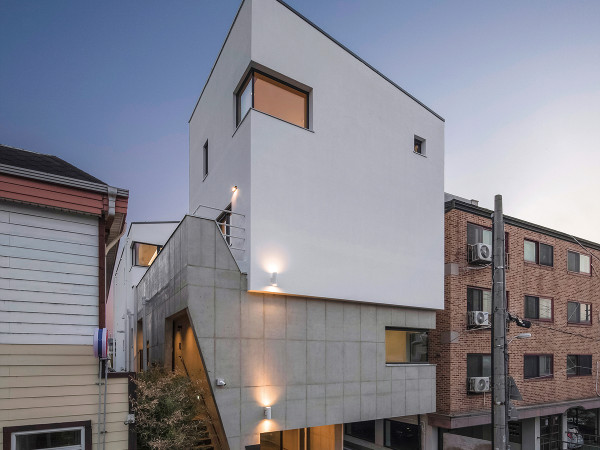 구도심에 자리한 호젓한 마을. 지금의 재미부터 미래까지 담은 똑똑한 상가주택을 만났다.1,2층과 3,4층의 다른 마감재료가 길가에서의 시인성을 높여준다. 스킵플로어, 4층 계단, 다락 등은 어느 곳에 시선을 둬도 지루할 틈이 없는 유쾌한 분위기를 만든다.동명동은 광주광역시에서는 주요 구도심 중 하나로 꼽히는 동네이다. 옛 전남도청인 국립아시아문화전당이 멀리 보이지만, 아직 오래된 주택과 낮은 건물들이 도란도란 모여있다. 그래서인지 근래 젊은 상인들을 중심으로 조금씩 상권이 형성되면서도 고즈넉한 분위기가 여전히 동네를 채우고 있다.건축주는 4년 전, 처음에는 리모델링을 계획하고 이 동네의 구옥을 매입했다.“그때까지는 집짓기도 막연하다 싶었어요. 그러다 2년쯤 지났을까, 조한준 소장의 설계를 인터넷에서 우연히 봤어요. 그때 내 집 그림이 머리에 그려지면서 설레더군요.”사실 건축주에게도 집에 대한 생각이 꾸준히 있었다. 두 아이 포함 네 가족이 머물기에는 아파트라는 공간은 늘 아쉬웠다. 한옥에서도 지내봤지만, 너무 좁고 추웠다. 영감과 계기가 생기니 결심도 빨라졌다. 계획도 신축으로 바꿨다. 작년 5월 중순, 건축주는 이런 계기를 만들어준 ‘건축사사무소 더함’의 문을 두드렸다.PLAN①상가 ②현관 ③거실 ④주방 겸 식당 ⑤욕실 ⑥침실 ⑦드레스룸 ⑧서재 ⑨평상 ⑩다락 ⑪테라스 ⑫보조주방 ⑬다용도실 HOUSE PLAN대지위치 ▶ 광주광역시 동구 대지면적▶ 258.00㎡(78.18평) |건물규모▶ 지상 4층(1~2층 상가, 2~4층 주택)거주인원 ▶ 4명(부부 + 자녀 2)건축면적 ▶ 154.44㎡(47.8평) | 연면적 ▶ 435.10㎡(131.84평)건폐율 ▶ 59.86% | 용적률 ▶ 159.74%주차대수 ▶ 3대 | 최고높이 ▶ 13.2m구조 ▶ 기초 - 철근콘크리트 매트기초 / 지상 - 철근콘크리트단열재 ▶ 외벽 - 비드법단열재 2종3호 110mm, 200mm (6주 숙성 네오폴 정양sg) / 지붕 – 140mm 가등급 그라스울 2겹외부마감재 ▶ STO 외단열시스템, 콘크리트 노출면처리창호재 ▶ 독일레하우 88mm PVC창호 삼중유리 47mm 로이 양면코팅 단열간봉열회수환기장치 ▶ ZEHNDER ComfoairQ 450(0.27회/h @n50)에너지원 ▶ 도시가스 조경 ▶ 천우조경 | 전기·기계 ▶ ㈜지엠이엠씨 | 설비 ▶ ㈜지엠엔지니어링구조설계 ▶ 한길구조엔지니어링시공 ▶ ㈜이에코건설설계 ▶ ㈜건축사사무소 더함 02-733-3824 http://the-plus.net총공사비 ▶ 약 6억8천5백만원(설계·감리, 가전, 가구, 환기장치, 기타 지급 자재 제외) 주거 부분을 정면에서 바라본 모습. 도로변이다 보니 창문은 대체로 절제했다.(위, 아래) 사선이 들어간 주택 입구는 독특한 분위기를 내면서 출입시 프라이버시까지 고려한 디자인이다.동명동 콕은 상권과 주택가가 사이사이 어우러지는 동네 가운데 서 있다. 설계를 맡은 조한준 소장은 “상권과 주택가 사이 빈칸을 메운다는 의미로 나무마개라는 뜻의 ‘콕(Coak)’을 연상했다”며 “동네 가운데 존재감을 드러내는 주택은 그 이름 뜻대로 ‘콕’ 박혀있는 형상이라 재밌었다”고 설명했다.건물은 도로가 있는 북측으로 당겨 상가와 주택 모두가 여유로운 뒷마당 공간을 누릴 수 있게 대지에 앉혀졌다. 외관은 아래에 노출콘크리트, 위로는 외단열 미장 마감을 적용했지만, 다른 상가주택과 달리 상가와 주택의 디자인을 용도별로 뚜렷이 구분하지는 않았다. 상가와 주택이 함께 쓰는 2층은 상가를 도로변에 둬 시인성을 높이고, 주택은 안쪽으로 밀어 프라이버시를 확보하며 창 배치에도 신경 썼다. 4층 테라스가 보이는 주택의 후면DIAGRAM2층 현관을 지나면 만날 수 있는 주방과 거실. 추후 상황에 따라선 다른 세대로 분리도 가능하도록 대비했다. 3층의 가장 끝에 배치된 서재실. 오픈 수전 자리 옆으로는 테라스와 연결되었다.강렬한 사선 입면 아래 놓인 계단을 오르면 주방과 거실이 놓인 2층 주택으로 진입하게 된다. 전반적으로 화이트톤 마감된 실내는 3층으로부터 본격적으로 우드톤과 어울리며 내추럴함을 더한다. 2층에 상가와 주택이 층고를 달리해 함께 놓여있기 때문에 3층은 자연스럽게 스킵플로어 형태를 갖게 되었다. 실내 계단을 통해 3층으로 들어서게 되면 좌측으로는 욕실과 테라스가, 우측으로는 가족실과 주요 침실들이 놓였다. 그 가운데를 구분하는 반 층 높이 계단은 도서관처럼 아이들이 앉아 책을 읽을 수 있도록 계단참을 넓게 구성했다.4층 테라스에도 창을 둬 시각적인 연결감을 주고자 했다. 어디 구석이 아니라 생활공간의 중심으로 끌어낸 욕조 욕실. 덕분에 아이들도 목욕을 놀이처럼 즐긴다.SECTION①상가 ②현관 ③거실 ④주방 겸 식당 ⑤욕실 ⑥침실 ⑦드레스룸 ⑧서재 ⑨평상 ⑩다락 ⑪테라스 ⑫보조주방 ⑬다용도실INTERIOR SOURCE내부마감재 ▶ 벽 – 아우로 월페인트 321 / 바닥 – 장림우드, 성신세라믹 포세린타일 | 욕실 및 주방 타일 ▶ 성신세라믹 수전 등 욕실기기 ▶ 계림요업㈜, ㈜인터쿠아, ㈜더존데크, 슈티에, 릭실코리아 주방 가구 및 붙박이장 ▶ 엉클조 제작가구 조명 ▶ 바이오 조명계단재·난간 ▶ 오크집성목 + 원형파이프 제작 현관문 ▶ 레하우 현관문 | 방문 ▶ 자작나무 자체 제작 데크재 ▶ 국산 낙엽송 탄화목다락에서 바
