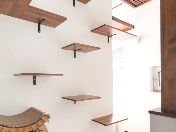 결혼 7년 차 동갑내기 부부와 두 마리의 반려묘. 서로에게 너무나 소중한 그들만의 작은 행성 속으로 들어가 본다.콩이와 율이가 사는 집. 1층과 옥상의 반은 부부만이, 2층과 3층, 옥상의 나머지 반은 고양이들과 함께 지내는 데 특화된 공간으로 분리해 설계되었다.건너편 건물에서 바라본 집의 모습. 오래된 주변 건물과 어우러질 수 있도록 최소의 재료로 깔끔하게 마감했다.3년 전, 길냥이였던 율이, 콩이의 집사가 된 후 윤여울, 이윤희 씨 부부에게 가장 중요한 건 두 고양이와 오랫동안 행복하게 사는 것이었다. 지금까지 아파트에 살며 고양이들이 편히 지낼 수 있도록 캣타워 등 여러 관련 가구를 장만하고 시행착오를 겪으며 집 안 구조도 바꿔 보았지만, 아무래도 아파트란 평면에서는 한계가 있었다.집 짓고 살고 싶단 부부의 오랜 꿈을 본격적으로 실행에 옮기게 된 이유도 바로 이 때문이었다. “지금의 터는 제가 유년 시절을 보냈던 한옥이 있던 곳이에요. 저희 가족이 이사를 나가고 세를 준 지 몇 해 지나지 않아 화재사고로 집이 전소된 아픈 기억이 있는 곳이죠. 시간이 흐르고 때마침 땅의 활용을 고심하고 계시던 부모님께 아내와 이곳에 집을 짓고 싶다 말씀드렸고 감사하게도 흔쾌히 허락해주셨어요.” 이후 일은 일사천리로 진행되었다.PLAN①현관 ②거실 ③주방 ④복도 ⑤하부창고 ⑥화장실 ⑦방 ⑧가족실 ⑨욕실 ⑩보조주방 ⑪부부침실 ⑫홀 ⑬드레스룸 ⑭세탁실 ⑮옥상HOUSE PLAN대지위치 ▶ 서울시 성북구 대지면적 ▶ 95.9㎡(29.01평) | 건물규모 ▶ 지상 3층 | 거주인원 ▶ 2명(부부) + 반려묘 2마리 건축면적 ▶ 42.75㎡(12.93평) | 연면적 ▶ 99.79㎡(30.18평) 건폐율 ▶ 44.58% | 용적률 ▶ 104.06% 주차대수 ▶ 1대 | 최고높이 ▶ 12.05m 구조 ▶ 기초 –철근콘크리트 줄기초 / 지상 – 철근콘크리트 단열재 ▶ 비드법단열재 2종1호 외부마감재 ▶ 벽 – 파벽타일, 스터코 / 지붕 – 컬러강판 창호재 ▶ KCC 시스템창호(이지스) 열회수환기장치 ▶ 독일 mfh systems社 AIR UNIT 에너지원 ▶ 도시가스 설계·시공 ▶ ㈜AAPA건축사사무소 02-557-2011 www.aapa.co.kr출입구로 가는 좁은 통로. 문 앞, 택배 기사분들을 위해 놓아둔 음료에서 부부의 따뜻한 마음 씀씀이가 전해진다.(위, 아래) 1층은 오로지 사람을 위한 공간으로 꾸며졌다. 전면의 큰 슬라이딩도어는 언제든 필요에 따라 여닫을 수 있다.건축에 문외한이었던 두 사람은 일단 주택에 관한 여러 책을 사서 읽으며 그곳에 소개된 업체들을 우선적으로 찾아가 상담하였고, 오랜 고민 끝에 부부의 이야기를 진지하게 들어준 AAPA 건축사사무소와 계약을 했다.한옥과 낮은 상가 건물로 가득한 오래된 동네 속 깃발 모양의 작은 땅. 부부만의 활동을 담고, 고양이들이 더욱 즐거워할 수 있는 네 식구를 위한 집짓기가 시작되었다.“두 분이 원하는 내용은 간단했어요. 고양이를 위한 집, 그러면서도 친구들을 초대할 때는 고양이의 동선에서 분리될 것. 크지 않은 집 안에 부부의 필요 요소를 그대로 담아내고자 고양이의 습성에 관해 공부하며 꼼꼼히 도면을 그려나갔습니다.”두 마리 반려묘에게 최적화되어 있는 2층현관에 들어서자마자 보이는 계단과 쇄석 위 디딤석은 일반적이지 않은 주택의 내부 마감으로 색다른 분위기를 자아낸다.건축가의 수고와 노력이 더해져 무사히 공사를 마치고, 입주한 지 한 달. 현관문을 열면 외부와는 또 다른 느낌의 아늑한 공간이 펼쳐진다. 먼저 1층은 거실과 주방이 자리한다.이곳은 친구들과의 모임 장소이자 두 사람이 수집한 피규어와 만화책 등을 둔 취미 공간이다. 벽면 한쪽을 가득 채운목재 루버 도어를 통해 고양이들이 있는 위층과의 분리를 꾀했으며, 2층으로 올라가는 계단 사이에 디딤석을 둔 길을 마련하여 손님 화장실과 수납을 위한 창고를 배치하고 공간 확장의 느낌을 더하였다.계단에서 고개를 들어 2층을 바라보면 목재 창들로 이뤄진 벽이 있다. 내부를 잇는 창은 그 너머 공간까지 시선이 닿아 고양이들과 눈 마주침이 가능하다. 평면뿐 아니라 단면 역시 고양이와의 교감에 중점을 두고 설계한 건축가의 배려가 돋보이는 부분이다.SPACE POINT 3POINT 1 - 2층 바닥 창주 활동이 2, 3층인 고양이들의 시야를 확장시켜 집에 누군가 들어오면 확인할 수 있는, 고양이의 눈높이에서 만들어진 창이다.POINT 2 - 물 마시는 장소언더 싱크 정수기와 세면대를 이용해 고양이들이 물 마시는 공간을 2층 한쪽에 따로 배치했다POINT 3 – 2,3층이 통하는 공간2층에서 3층으로 이어지는 고양이 공간. 아이들의 신체 크기와 점프력을 일일이 체크해 선반 높이와 너비 등을 정하였다.3층 모습. 욕실 옆으로 세탁실을 놓아 동선의 효율성을 높였다.SECTION①현관 ②거실 ③주방 ④복도 ⑤하부창고 ⑥화장실 ⑦방 ⑧가족실 ⑨욕실 ⑩보조주방 ⑪부부침실 ⑫홀 ⑬드레스룸 ⑭세탁실 ⑮옥상INTERIOR SOURCE내부마감재 ▶ 벽 – 삼화페인트 도장 / 바닥 – 구정마루 강마루 욕실 및 주방 타일 ▶ 이공세라믹 |수전 등 욕실기기 ▶ 세비앙, 아메리칸 스탠다드 외 주방 가구 ▶ 성실싱크, LG하우시스 대리석 계단재·난간 ▶ 멀바우 + 목재 루버 난간 방문 ▶ 영림도어(ABS + 필름)벽