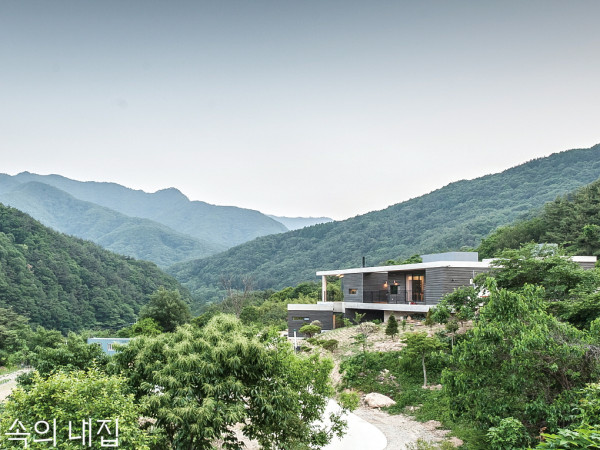 경사지를 최대한 훼손하지 않고 무심한 듯 중첩된 매스가 풍경 속에 자연스럽게 녹아든다.DIAGRAM겨울 산이 특히 아름답기로 소문난 전라북도 무주. 고향으로 귀촌한 건축주 부부는 2년 전 한 번 상담한 적 있는 건축가를 다시 찾아간다. 그 사이 구입한 산골 중턱의 경사가 꽤 있는 대지와 함께. 땅은 동쪽으로 흐르는 경사면에 대지 내부의 높이 차가 6m 정도일 정도로 조건이 까다로웠지만, 남쪽과 동북쪽에 전망과 향이 좋아 장점을 살리는 방향으로 잡는다면 충분히 매력 있는 집이 되리라고 건축가는 생각했고, 이 프로젝트에 동참한다.눈이 내린 어느 날, 고요한 풍경과 어울리는 주택의 전경깔끔하고 군더더기 없이 꾸민 게스트하우스 내부두 살 터울의 아들 둘을 둔 부부는 이 좋은 전망을 많은 사람과 함께 나누고자 거주 공간과 분리된 게스트하우스를 요청했다. 다만, 추후 생활의 변화가 있을 때를 대비해 내부적으로 연결할 수 있길 원했다. 때문에 진입하는 외부 동선은 서로 분리하되, 내부에서는 서로 통해야 한다는 만만치 않은 숙제가 생겼다.SECTION ①현관 ②거실 ③주방 ④방 ⑤화장실 ⑥드레스룸 ⑦다용도실 ⑧데크경사지라는 대지의 조건을 각기 다른 레벨의 마당을 가진 중첩된 매스로 풀어냈다. 1층 게스트하우스 코너 창 자리, 툇마루에서 바라본 풍경. 정면에 있는 나무는 집을 짓기 전부터 대지의 경계를 지키던 고목이다. HOUSE PLAN대지위치 ▶ 전라북도 무주군 | 대지면적 ▶ 999.57㎡(302.9평) 건물규모 ▶ 지상 2층 | 거주인원 ▶ 4명(부부 + 자녀 2) 건축면적 ▶ 173.68㎡(52.63평) | 연면적 ▶ 190.75㎡(57.80평) 건폐율 ▶ 17.37% | 용적률 ▶ 19.08% 주차대수 ▶ 2대 | 최고높이 ▶ 7.2m 구조 ▶ 기초 - 철근콘크리트 매트기초 / 지상 – 철근콘크리트(벽) + 무근콘크리트(지붕) 외부마감재 ▶ 외벽 – 외단열시스템 + 세라믹 와이드롱타일 블랙 / 지붕 – 노출콘크리트 위 우레탄도막방수 창호재 ▶ 공간 창호 알루미늄 시스템창호 3중유리 | 토목 ▶ 강산건축토목 구조설계(내진) ▶ ㈜이든구조 시공 ▶ 건축주 직영 | 총공사비 ▶ 5억원(인테리어, 조경 포함) 설계담당 ▶ 김종서, 이연진, 조은서, 이혜빈, 엄윤하 설계 ▶ ㈜제로리미츠건축사사무소 02-714-3006 www.ZLarchitecture.co.kr벽난로가 훈훈한 분위기를 더하는 2층 거실. 조망을 위해 모든 코너 창은 프레임 없이 시공했다. 외부 데크까지 확장된 듯한 거실 한편, 다도(茶道)가 취미인 건축주를 위한 자리 8 - 매스를 분리하면서 현관에서 진입할 때 탁 트인 시선을 선사하는 프라이빗한 데크 공간 경사지, 두 개의 영역을 따로 또 같이 쓰는 조건 속에서 건축가는 배치와 공간 구성에 주목했다. 설계를 맡은 제로리미츠 건축사사무소 김종서 소장은 “지형을 거스르지 않고 자연스럽게 어우러질 것, 사계절 다른 모습을 보여주는 덕유산의 산세를 최대한 누릴 수 있는 것”을 바탕으로 각기 다른 레벨의 마당을 가진 매스를 제안했다고 설명한다.덕유산 전망의 남향을 따라 배치한 1층과 정동향의 축을 유지한 2층이 서로 중첩되어마치 경사지에 살포시 얹어진 것 같은 품세는 그렇게 탄생되었다. 평지가 아닌 경사지 땅이라 가능한 건축적 대안을 고민하면서 자연에 순응하는 구성을 갖추고, 공간의 용도와 성격에 최대한 맞춰 반영한 결과다.INTERIOR SOURCE내부마감재 ▶ 벽 - 한화 수성 페인트 / 바닥 – 온돌마루, 포세린 타일 등 욕실 및 주방 타일 ▶ JS타일 수입 포세린 타일 | 수전 등 욕실기기 ▶ 계림도기 등 주방 가구 ▶ 스크랩우드 901 | 조명 ▶ LED T5, 75㎜ 매립등 계단재, 난간 ▶ 미송 현관문 ▶ 신진도어 | 중문 및 방문 ▶ 영림도어 붙박이장 ▶ 자작나무 합판 현장 제작 | 데크재 ▶ 19㎜ 방부목 오일스테인매스를 분리하면서 현관에서 진입할 때 탁 트인 시선을 선사하는 프라이빗한 데크 공간 / 주방에서 침실로 이어지는 미니 계단실을 외부에서 본 모습. 마름모꼴 창이 재미있다.드레스룸과 욕실을 갖춘 메인 침실 1층은 손님을 위한 게스트하우스로 거실과 주방, 침실로 간소하게 구성되었다. 실내에서는 코너 창을 통해 탁 트인 전망을 누릴 수 있는 동시에 욕실과 연결된 프라이빗한 뒷마당도 경험할 수 있다. 1층과 2층 사이에는 평소 닫아두지만, 필요 시 내부를 통해 이동할 수 있도록 계단실을 배치했다.건축주가 거주하는 2층은 중정을 품은 긴 매스와 약간의 단차가 있는 작은 매스가 ‘ㄱ’자로 배치되었다. 건물 중앙으로 진입하면 오른쪽에는 풍경이 창문 가득 들어오는 거실을, 왼쪽에는 콤팩트한 주방과 다용도실을 두었고, 주방을 지나 뜻밖의 위치에 놓인 계단을 따라 오르면 부부의 침실이 별채처럼 자리한다.매스가 분리되고 산지에 있는 집이라 외단열 시스템을 통해 단열 성능을 높이고, 노출되는 바닥 부분에도 내부 기준 이상의 단열재로 채우는 등 단순히 형태뿐만 아닌 내실까지 챙기고자 시공에 만전을 기했다.1F – 61.12㎡ 2F – 129.63㎡①현관 ②거실 ③주방 ④방 ⑤화장실 ⑥드레스룸 ⑦다용도실 ⑧데크여름에는 청량한 초록과 어우러져 그에 맞는 경쾌한 분위기를 내는 주택김 소장은 이러한 배치와 공간 구성이 극대화될 수 있도록 재료 역시 디테