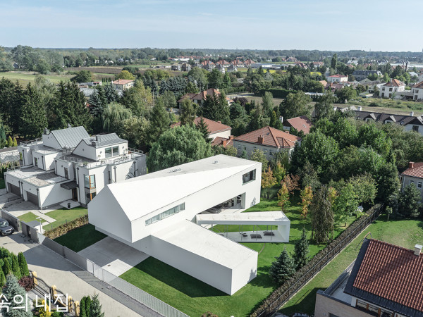 나라마다 집은 다를 수밖에 없다. 기후·문화·제도적 기반과 습관에 차이가 있는데 집이라고 똑같을까. 하지만, 아침에 밥을 먹고 저녁에 가족들과 시간을 보낸 뒤 함께 잠자리에 드는 일상과 소중한 공간을 갖고 싶다는 소망은 어디든 같다. 여기, 미국과 베트남, 폴란드에서 건너 온 세 채의 주택이 있다. 보편과 개성 사이, 서로 비슷하면서도 다른 환경에서 나오는 특별하고 재밌는 아이디어를 만나보자.©Jaroslaw Syrek Location Poland Architect KWK PROMES AVERAGE TEMPERATURE -0.5℃(12월) ~ 18℃(7월)도로에서 바라보는 시선에서는 딱 떨어지는 박공이 눈에 띈다. ©Olo Studio아이디어와 기술로 누리는 따뜻한 햇살폴란드 한적한 주택가에 지어진 이 독특한 주택은 심플한 외형과 프라이버시에 대한 주문으로 대지 위에 놓이는 것부터 시작한다. 먼저 도로와 수직 방향으로 긴 직사각형 형태로 매스가 배치됐고, 도로로부터의 시선을 막기 위해 도로와 수평 방향에 긴 두 번째 매스를 뽑았다. 처음 매스의 빈 곳에는 주방과 식당, 거실이, 2층에는 침실과 가족실이 배치됐고, 도로 쪽 매스에는 스파가 놓였다. 여기에 건축주가 원한 평지붕과 지역 규제인 박공지붕을 절충하면서 독특한 지붕선을 이끌어냈다.두 매스를 분리하면서 생긴 캔틸레버는 차고 입구와 현관 앞에서 비를 피하는 등 포치의 역할도 한다. ©Olo Studio 테라스의 이동 속도는 항상 일정하게 조절되고 있어 마당 잔디 생육 영향을 최소화한다. 건축주는 어느 순간이든 집 안에 해를 들이기를 원했다. 이 부분에서 주택의 모티브인 ‘사분의(Quadrant)’가 소환된다. 과거 바다를 누비던 이들이 별과 태양의 위치를 파악하던 도구로, 태양의 높이에 따라 각도가 변화하는 감각을 주택에 적용했다. 도개교 등의 시스템을 다뤘던 메커니즘으로, 테라스는 햇빛의 방향에 맞춰 레일을 따라 일정한 속도로 거실과 스파를 오간다.계단을 오르면 정면엔 침실이 있다. / 침실 맞은 편으로는 2층 가족실이 내다보인다.6연동 슬라이딩 도어로 프레임 없이 시원한 개방감을 주는 거실Plan1.차고 2.현관 3.주방 4.식당 5.테라스 6.욕실 7.스파/운동실 8.거실 9.미디어룸 10.침실 11.복도 12.창고 스파나 거실 어느 쪽으로도 공간의 확장이라는 역할을 수행한다.주방과 식당, 거실이 한 공간에 들어있고, 벽 너머로 TV 등을 즐기는 미디어실을 두었다. ©Olo Studio Diagram & Shift©Olo Studio따스한 빛과 탁 트인 풍광을 들이는 데는 창문의 역할도 컸다. 거대한 6연동 슬라이딩 유리도어 두 세트를 사용해 거실 양쪽에서 여닫을 수 있게 했다. ‘바꿀 수 없는 것은 받아들이고, 바꿀 수 있는 건 도전하는 용기’를 갈구하던 기도문처럼 이 주택은 제도의 한계와 기술의 가능성 사이에서 가장 멋진 결과물을 도출해냈다.©Jaroslaw Syrek구성 _ 신기영 | 사진 _ Juliusz Sokołowski (별도표기 외)취재협조_ KWK PROMES [www.kwkpromes.pl]ⓒ 월간 전원속의 내집 / Vol.253 www.uujj.co.kr