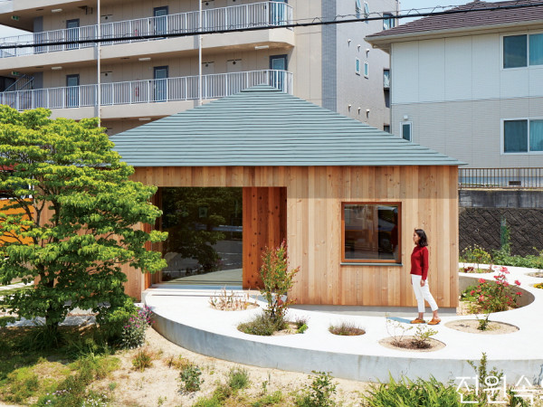 고요한 골목길을 걷다 주변의 건물들에 가려져 보이지 않던 집을 마주한 순간. 자연스레 길을 멈추고 한참을 들여다보게 만드는 ‘하우스 인 무카이나다’의 매력을 찾아서.(위, 아래) 대지를 빙 둘러 집안까지 연결되는 산책로바다를 향해 흐르는 하천, 그 옆에 위치한 일본의 조그만 도시 아오사키미나미. 그중에서도 무카이나다 지하철역 근처, 한적한 동네 가운데 비행접시 위에 앉은 목조주택이 있다. 건축주는 평소 원예를 즐기는 부모님이 살기에 적합한 집을 꿈꿨다. 또한, 무료한 일상을 타파할 수 있도록 작은 상점을 운영하거나 갤러리, 워크숍을 오픈하는 등 다양한 활용 가능성이 있는 넓은 공간을 원했다.SKETCHHOUSE PLAN대지위치 ▶ 일본, 히로시마시(Hiroshima-city) 대지면적 ▶ 329.14m2(99.56평) 건축면적 ▶ 82.81m2(25.05평) |연면적 ▶ 76.04m2(23.00평) 책임 건축가 ▶ Shintaro Fujiwara, Yoshio Muro 설계▶ Fujiwaramuro Architects www.aplan.jp통유리와 대문이 불필요한 이음새 없이 결합되어 더욱 단정한 외관이 완성되었다.집으로 들어가는 길. 왼편 정원은 주차장으로도 쓰인다.설계를 맡은 ‘후지와라무로 아키텍츠’의 책임 건축가, 후지와라 신타로와 무로 요시오는 공간을 넓게 사용할 수 있도록 거실, 주방, 작업실을 모두 연결해 디자인했으며 방은 침실 하나만 두었다. 마당을 산책할 수 있도록 기단을 살짝 높인 둥근 형태의 도마(土間)도 만들었다.도마란 일본의 전통 민가에서 보이던 건축 양식으로, 실내에 나무 판재를 깔아 마루를 만든 부분이 아닌, 지면 그대로 두어 신발을 신고 다닐 수 있도록 한 공간을 말한다. 한옥의 봉당(封堂)과 비슷한 곳으로, 이 집에서는 대청 앞이나 방 앞의 기단 부분처럼 대지보다 약간 올라와 다져진 형태로 나타난다.정문으로 들어오면 보이는 작업실의 모습. 한 계단 낮은 곳에 자리 잡아 더욱 안락한 느낌을 준다.집 안에는 마루와 다른 컬러의 목재로 도마와의 연결성을 유지했다.바닷가 근처라 더욱 지면에서 유입되는 습기가 많았으며, 살짝 기울어진 컨디션을 가지고 있어 기단은 콘크리트로 깔고 그 위에 목조로 주택을 지었다. 덕분에 살짝 높이 올라와 있는 집을 한 바퀴 둘러 산책할 수 있도록 동그란 비행접시 형태의 도마를 설치한 것.정원에는 식물을 심을 수 있도록 동그란 구멍을 사이사이에 내어 세상에 하나뿐인 개인 정원을 완성했다. 또한, 집이 시공되기 전부터 땅을 지키고 있던 자귀나무를 활용, 도로 측면에 보이는 산의 조망과 남향을 고려하여 주택은 부지를 대각선으로 가르며 배치되었다. 추후 사용 용도를 고려, 정문에는 대문의 2배 가까이 되는 통유리를 결합하여 외부인의 시선을 끌고, 언제든 바닷마을의 풍경도 들여올 수 있다.끝없이 이어지는 도마와의 유기성을 놓치지 않기 위해 천장도 곡선으로 형태를 잡아 디자인했다.거실 겸 다이닝룸. 넓은 테이블 덕분에 많은 손님이 와도 무리 없다.완공 후 집은 건축주의 부모님을 비롯해 이웃들의 모임 장소로까지 활용도가 높다. 목마른 이에게 건넨 물 위에 나뭇잎을 띄우듯, 천천히 오래 보아야 아름다운 집의 정원은 이제 막 새싹을 틔우는 중이다.쪽빛 어둠 속 따스한 빛을 내뿜는 집의 전경 PLAN1. 거실/다이닝룸 2. 작업실/게스트룸 3. 침실 4. 드레스룸 5. 주방 6. 화장실 7. 세면실 8. 욕실 9. 일본 산딸나무구성_ 편집부 | 사진_ Toshiyuki Yanoⓒ 월간 전원속의 내집 / Vol.252 www.uujj.co.kr