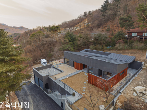 치열했던 현역 활동을 마감하고 새롭게 시작될 또 다른 인생과 나만이 누리는 소소한 행복이 담긴 집.묵직하고 정적인 단층 매스에 목재로 경쾌하게 포인트를 준 단아한 외관(위, 아래) 정면에서 보는 것과는 또 다른 역동적인 느낌을 내는 주택의 모습. 거실과 침실 각각에서 바로 연결되는 외부 공간까지 사전에 계획한 흔적이 엿보인다.땅에서, 집에서 찾고자 한 행복파일럿으로서 하늘에서 긴 시간을 보낸 건축주. 퇴직 후 시작될 두 번째 인생은 땅에 두 발을 딛고 살고자 마당 있는 집을 짓기로 했다. 그의 단독주택행을 앞당긴 건 퇴직 전 다녀온 부부 동반 북유럽 여행이었다. 그곳에서 아름다운 자연 풍광을 배경 삼아 아담한 집을 짓고 여유롭게 캠핑을 다니는 삶을 본 뒤, 더 이상 행복을 유예할 수 없겠다 판단했고, 건축박람회에서 만난 하눌주택 박우범 대표와 인연을 맺었다.마치 연어가 자기가 태어난 곳으로 회귀하듯 자유롭게 세상을 유영한 뒤 다시 고향인 양평으로 돌아가기로 한 건축주. 지금 집이 지어진 자리는 10여 년 전, 집을 짓기 위해 마련해 놓은 땅이었다. 겨울이 되면 남향 빛을 오래 받긴 조금 힘들지만, 그 단점도 잊을 만큼 장애물 없이 유명산까지 내다보이는 풍경은 선택을 이끌었다.앞마당에 비해 사적이면서 다용도의 활동이 가능한 뒷마당앞마당-거실-외부 데크-중정-복도로 이어지는 회유 동선은 자유롭고 풍부한 생활을 가능케한다.PLAN①현관 ②거실 ③주방 ④다용도실 ⑤침실 ⑥욕실 ⑦드레스룸 ⑧데크 ⑨온돌방 ⑩장작창고 ⑪보일러실&창고HOUSE PLAN대지위치 ▶ 경기도 양평군 대지면적 ▶ 780㎡(235.95평) | 건물규모 ▶ 지상 1층 거주인원 ▶ 2명(부부) 건축면적 ▶ 153.39㎡(46.40평) | 연면적 ▶ 129.8㎡(39.2평) 건폐율 ▶ 19.67%(법정 40% 이하) | 용적률 ▶ 16.64%(법정 100% 이하) 주차대수 ▶ 2대 | 최고높이 ▶ 5.08m 구조 ▶ 기초 - 철근콘크리트 매트기초 / 지상 – 경량목구조 2×6 구조목 J-grade(벽) + 2×10 구조목 J-grade(지붕) 단열재 ▶ 벽 - R23 인슐레이션 + 네오폴 THK50 / 지붕 - R37 인슐레이션 외부마감재 ▶ 외벽 – 벽돌 타일, 방킬라이 / 지붕 – 알루징크(0.7T) 창호재 ▶ 이건 알루미늄 3중 시스템창호 철물하드웨어 ▶ 심슨스트롱타이(홀다운, 허리케인 타이, 조이스트 행거 등) 에너지원 ▶ 지열보일러 설계담당 ▶ 권정열, 조병호 설계 및 시공 ▶ ㈜하눌주택 총공사비 ▶ 3억1천만원(설계 및 부대공사비 제외)POINT 1 - 숨어 있는 현관보안과 프라이버시 등을 위해 진입로에서 보이지 않도록 은밀하게 구성한 현관부POINT 2 - 장작으로 데우는 온돌방메인 열원은 지열 보일러를 사용하지만, 온돌방은 직접 팬 장작으로 공간을 데운다.작지만, 작지 않은 집의 비밀오랜 기간 자신만의 영역을 지켜 온 전문가답게 건축주는 소박한 규모의 단층일 것, 디자인은 심플할 것, 풍경을 감상할 수 있을 것 등 세 가지 요청사항을 전하고, 나머지는 건축을 전공하고 업으로 삼는 하눌주택에 믿고 맡기기로 했다. 아내와 둘이 살 집, 나이는 들었고 식구는 줄었고 자식들이 온대도 하루 남짓일 터. 시간이 지나면 2층은 안 올라갈 테고, 현실적으로 집 안팎 관리도 무시 못 할 노동이라 여겼다.하눌주택 정주영 공동대표는 “소형 평수지만, 넓어 보이도록 실내·외가 자연스럽게 연결되는 경계부 구성과 중정을 계획하고, 침실로 향하는 복도 양쪽으로 창을 내어 시야를 확장했다”며 “작은 집을 선호하는 요즘 추세에 맞춰 제한된 면적을 충분히 누릴 아이디어가 반영됐다”라고 집짓기 소회를 밝혔다.거실에서 바라보는 유명산의 절경. 폴딩도어를 열면 그림과 같은 산세가 집으로 들어오는 듯하다. ⓒ변종석주방과 거실을 앞뒤로 배치한 덕분에 불필요한 동선은 줄고 소통은 원활하다는 후문이다. ⓒ변종석DIAGRAMINTERIOR SOURCE내부마감재 ▶ 벽 - 에덴바이오 벽지 / 바닥 - 구정마루 원목마루(거실, 주방, 복도), 구정마루 강마루(방), 포세린 타일 욕실 및 주방 타일 ▶ 수입 타일 수전 등 욕실기기 ▶ 아메리칸스탠다드(세면대, 수전, 샤워수전), 보보코퍼레이션(비데 일체형 양변기) 주방 가구·붙박이장 ▶ 맞춤 제작 |조명 ▶ 조명나라 현관문 ▶ 성우스타게이트 LSFD 모네스티 다크 |중문 ▶ 예림도어 방문 ▶ 예다지 ABS디럭스 도어 평판 데크재 ▶ 방킬라이집 안 어디서든 마주하는 자연지붕은 배면의 외부 공간 지붕과 대구를 이루는 역경사지붕을 적용, 반듯한 인상과 실용성을 모두 확보했다. 소박한 구성답게 불필요한 동선도 최소화했다. 디딤석을 따라 집 전체를 바라보며 걷다 숨겨진 현관으로 들어서면 왼쪽에는 공용 공간인 거실 및 주방이, 오른쪽은 복도를 따라 사적인 침실이 배치되어 있다. 집을 이 땅 위에 지은 이유인 저 멀리 유명산이 코너 양쪽의 큰 창을 통해 파노라마처럼 펼쳐진다. 여기에 주방과 가까운 쪽에 완전히 다 접히는 폴딩도어를 두어 따뜻한 계절에는 자연을 더욱 가까이서 즐길 수 있다.한편, 침실에는 전용 데크로 바로 나갈 수 있는 통로를 두었는데, 방 안에서도 프라이버시는 지키면서 시야의 답답함은 해소할 수 있는 가벽을 설치해 풍경과 사생활을 모두 챙겼다.앞마당에서 뒷마당으