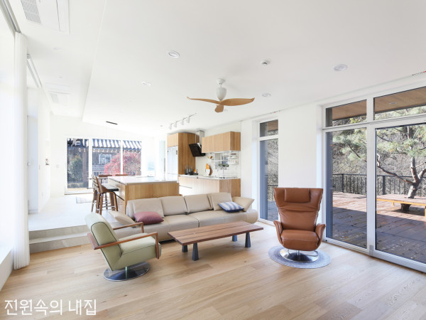 계단을 오르기 전엔 알 수 없었던 가족만의 정원. 패시브하우스로서 임무에도 충실한 열린 주택을 만났다.정원에서 보내는 시간이 많아진 건축주 박성준, 김윤정 씨 부부SECTION ①주차장 ②운동실 ③현관 ④창고 ⑤화장실 ⑥보일러실 ⑦거실 ⑧주방/식당 ⑨보조주방 ⑩마당 ⑪침실 ⑫안방 ⑬욕실 ⑭드레스룸 ⑮서재 늦어도 나이 육십에는 제주에 집을 짓고, 그전엔 한옥에서 살아 보는 것도 좋겠다. 얼마 전까지만 해도 막연히 꿈꿔왔던 박성준 씨의 바람이다. 그저 인터넷만 검색하며 대리만족하고 있던 어느 날, 사는 데와 멀지 않은 곳에 한옥 택지가 있음을 알았고, 가서 구경만 해보자며 석연치 않아 하던 아내 손을 이끌었다. 한옥 지붕과 산새가 어우러진 마을. 같은 서울 하늘 아래였지만, 공기부터 달랐다. 근처에 개울도 있고 계곡도 있다니 마치 4시간 거리의 설악산에 와있는 듯한 착각마저 들었다고. “다녀온 이후 눈에 밟혀 도통 잠을 이룰 수가 없었어요. 너무 살고 싶은데, 이미 늦어 한옥 택지는 남아 있질 않았죠.” 수소문 끝에 마을 내 단독주택지를 찾았고, 주택은 추울 것 같아 싫다던 아내를 겨우 설득한 만큼 무조건 따뜻한 집, 그래서 패시브하우스를 선택하게 되었다.길에서 본 주택 외관. 다양한 마감재가 어우러져 단조롭지 않은 입면을 완성했다.거실과 주방 쪽 모습. 내부는 아내의 감각이 더해져 최소의 재료로 깔끔하게 마감했다. 도심에서는 쉽게 경험할 수 없는 아름다운 창 밖 경관은 가족의 마음까지 편안하게 해준다. 건축주가 잘 알고 있어야 제대로 시공되고 있는 지도 가늠할 수 있다는 판단에 패시브하우스 관련 책도 많이 구매해 공부했다는 그는, 한국패시브건축협회에 등록되어있는 건축가 중 목금토건축사사무소 권재희 소장과 의기투합하기로 결정하고 함께 집이 놓일 대지를 찾았다. “건축주 마음이 이해될 정도로 주변 풍광은 손색없었어요. 하지만 진입로가 북쪽인데, 남쪽과 서쪽이 더 높은 경사라 이웃집들로 인해 그림자에 갇히는, 사실상 패시브하우스로는 불리한 대지 조건이었죠.” 이런 단점에 관한 권 소장의 대안은 ‘중정’이었다. 중정을 열어 방마다 빛을 들이고, 가족의 프라이버시를 보호하면서도 시야가 동네까지 연장되는 열린 마당을 구현하고자 건물 일부를 들어 올렸다.필로티 하부는 내·외부가 혼재된 공간이다. 이동 동선의 경로에 따라 다채로운 풍경이 펼쳐지는 정원 / 집 입구로 향하는 계단HOUSE PLAN대지위치 ▶ 서울시 은평구 | 대지면적 ▶ 330㎡(99.82평) 건물규모 ▶ 지하 1층, 지상 2층 | 거주인원 ▶ 4명(부부 + 자녀 2) 건축면적 ▶ 153.11㎡(46.31평) | 연면적 ▶ 339.18㎡(102.60평) 건폐율 ▶ 46.4% | 용적률 ▶ 72.77% 주차대수 ▶ 2대 | 최고높이 ▶ 8.22m 구조 ▶ 기초 – 철근콘크리트 매트기초 / 지상 – 철근콘크리트 단열재 ▶ 비드법단열재 2종3호 200~250mm 외부마감재 ▶ 큐블록 벽돌, 럭스틸 창호재 ▶ 엔썸 PVC 삼중창호 (에너지등급 1등급) 열회수환기장치 ▶ Zehnder Comfoair Q600 에너지원 ▶ 도시가스, 태양광 | 조경석 ▶ 이끼석, 보령석 |조경 ▶ 안마당 더 랩 담장재 ▶ 에머랄드 그린, 화살·자작나무 전기·기계 ▶ 수호엔지니어링 구조설계(내진) ▶ SDM구조기술사사무소 인테리어 ▶ 2L디자인 김지수(기본설계) / 홈데이 목동점 정재현(실시 및 시공) 시공 ▶ ㈜선이건설 유부열 설계 ▶ ㈜목금토 건축사사무소 070-8277-4464 www.mokgeumto.co.kr집주인과 이웃이 만나는 소통의 장소가 된다.여기에 1층 주진입부는 필로티 구조로 답답함을 없앴다. 구조적 안전성을 위해 내진 설계로 성능을 높였고, 필로티 공간의 열적 손실은 패시브건축협회와의 논의로 해결점을 찾았다. 지난해 봄, 공사를 시작해 집을 만나기까지 13개월이 걸렸다. 적지 않은 시간이 소요된 이유는 건축주만의 철칙 때문. “무에서 유를 만들어내는 분들께 ‘언제까지 결과물을 보여주세요’라고 재촉하는 건 말도 안 된다 생각했어요. 시간에 쫓기다 보면 실수가 생기죠. 작업자가 인지하고 수정해서 진행해도 되지만, 그렇지 않고 넘어가는 경우도 많을 거예요. 특히 마감재로 덮어 버리면 알 수 없는 건 더욱 그럴 수 있겠다 싶어 건축가, 시공자가 여유를 가지고 작업할 수 있도록 나름 노력했답니다.” 그러한 건축주의 배려 덕분일까. 가족은 완성도 높은 패시브하우스를 선물 받았다. 먼저 대문을 열고 계단을 올라 마주하게 되는 중정. 곳곳에 자리한 작은 습지와 소담스러운 꽃밭은 도심 주택에선 보기 힘든 아름다운 풍경을 선사한다. “보는 곳이 어디냐에 따라 달라요. 주방에서 요리하며 보는 정원, 식사할 때 보는 정원, 거실 소파에 앉아 보는 정원. 계절과 날씨가 바뀔 때도 그 모습이 전부 달리 보이니 매일 눈이 즐거울 수밖에요.”POINT 1 - 건식 욕실 욕실은 사용자의 편의를 배려해 샤워실과 화장실, 세면실을 모두 분리했다. POINT 2 – 주출입구 계단 벽에는 센서등이 설치되어 있어 주변이 어두울 때도 이동 시 걱정 없다. POINT 3 - 주차장 옆 운동실 주차장 옆 작은 공간에 운동을 좋아하는 가족을 위한 피트니스룸을 마련했다.마치 집이 숲속의 일부인 듯 잘 꾸민 정원과 자연스러운 모습으