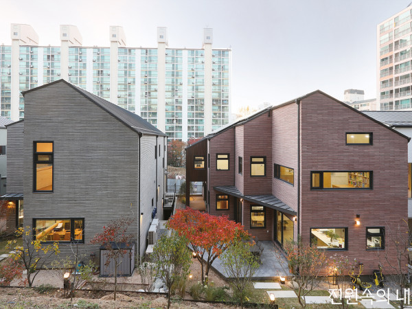 어릴 적 즐거웠던 추억이 어른이 되어서도 가슴 깊은 곳에 머물러 있던 삼 남매. 우애 깊은 그들이 건축가와 머리를 맞대고 함께 지은 벽돌집을 찾았다.새벽녘 북한산과 어우러진 주택 전경서울 성동구 성수동 ‘향나무집네’라면 동네에서 모르는 사람이 없었다고 한다. 어린 시절 큰오빠와 두 여동생은 이웃들이 다 볼 수 있을 만큼 큰 향나무가 있는 집에 살면서 얻은 추억들이 너무 소중하고 좋았다. 어른이 된 후 각자의 자녀들에게도 그런 좋은 기억을 만들어줄 수 있는 새로운 집을 짓고 함께 살면 어떨까. 그렇게 그들은 우리를 찾아왔다. 3가구 합쳐 연면적 430㎡, 2층 규모에 침실 8개, 화장실 6개, 주방 3개가 놓여야 했다. 또한, 가족들은 세대마다 적절한 남향 채광과 북한산 조망을 확보하고 공용계단실과 별도 출입구를 만들고 싶어 했다. 이를 다 채운다면 다소 협소한 공간이 필연적으로 발생할 수밖에 없는 조건임을 어렴풋이 느끼면서 계획설계를 진행하였다. 각 세대 배치는 서로 간의 배려에서 시작됐다. 가족의 기둥과도 같은 첫째 오빠네는 앞마당과 같은 외부공간을 포기하는 대신 전 가족을 아우르며 소통할 수 있는 2층을, 총무 역할을 하면서 집안 대소사를 챙기는 둘째네는 새집 여기저기를 관리할 수 있는 1층을, 그리고 싱글인 막내는 자유롭게 드나들 수 있도록 앞마당과 출입구가 있는 별동의 건물이 필요했다.PLAN①공용홀 ②현관 ③침실 ④거실 ⑤주방 ⑥중정마당 ⑦앞마당 ⑧공용계단 ⑨팬트리 ⑩테라스 ⑪다락HOUSE PLAN대지위치 ▶ 서울시 은평구 대지면적 ▶ 330㎡(99.82평) |건물규모 ▶ 지상 2층 거주인원 ▶ 3가구, 총 7명 건축면적 ▶ 164㎡(49.61평) |연면적 ▶ 430㎡(130.07평) 건폐율 ▶ 49.8%(법정 50%) |용적률 ▶ 71.22%(법정 100%) 주차대수 ▶ 3대 |최고높이 ▶ 10.1m 구조 ▶ 기초 – 철근콘크리트 매트기초 / 지상 – 철근콘크리트 단열재 ▶ 경질우레탄보온판 2종2호 외부마감재 ▶ 외벽 – 전벽돌 / 지붕 – 컬러강판 창호재 ▶ KCC PVC 시스템창호 |에너지원 ▶ 도시가스 조경 ▶ 얼라이브어스 전기·기계 ▶ 태영이엠씨 |구조설계 ▶ 프라임구조 시공 ▶ 마고퍼스건축그룹 설계 ▶ ㈜삼공사건축사사무소중정 마당은 삼 남매 가족들의 모임 장소가 되어준다.남측에서 바라본 외관일단 건물은 고른 채광과 동쪽으로 펼쳐지는 북한산을 바라보고자 남동쪽으로 길게 늘어진 ‘ㄷ’자 형태를 갖췄다. 출장이 잦은 오빠네가 2층과 북한산이 훤히 보이는 옥상 테라스를 차지하고, 실 거주 빈도가 가장 높은 둘째가 1층과 햇살 좋은 중정을 사용하면서 손님맞이를 한다. 막내네는 주출입구와 거리를 두고 별도의 앞마당을 통해서 접근하는 분동 형태로, 혼자만의 시간을 즐길 수 있도록 ‘ㄷ’자 형태 끝자락에 매달려 있는 건물처럼 보인다. 공용부 면적을 최소화하고자 다양한 구조를 사용하였는데, 공용 계단은 철골조 평철로, 다락으로 올라가는 계단은 벽면과 일체화된 철근콘크리트로, 1층에서 다락까지 이어지는 막내네 계단은 시공성을 고려하여 목구조로 만들었다.가족들의 다양한 야외 활동이 이뤄질 옥상 테라스주출입구에 들어서면 마주하는 공용 계단(위, 아래)오빠네 현관에서 이어지는 복도와 침실 문, 그리고 주방. 내부는 화이트 컬러로 깔끔하게 마감했다.동쪽 일부분의 천장을 높여서 북한산 조망이 가능하도록 한 거실오빠네 안방 욕실에는 사우나를 설치했다.세대별 주요 실들을 배치하고 보니 팬트리와 같은 부속실 공간이 부족했다. 특히 일정한 사용 반경이 필요한 세탁기와 냉장고 위치가 고민스러웠는데, 오빠네의 경우 자녀 방으로 통하는 복도를 사이에 두고 넓은 쪽에 주방을 설치했다. 그리곤 건너편에는 상부장을 만들고 하부에 냉장고와 세탁기를 설치해 사용할 때만 3단 슬라이딩 도어를 열어서 쓰도록 했다. 이는 손님이 오면 문으로 가려 간결한 주방만을 보여주고자 한 것이다. 17개 실들이 2층까지 가득 찬 외관은 거대한 단일 건물이 아닌 여러 채로 보이게 다른 방향으로 향하는 3개의 경사지붕을 설치하여 주변 단지 규모에 순응하도록 하였다.(위, 아래) 싱글인 막내네의 거실과 서재둘째네 거실 초입. 복도에서 계단을 내려오도록 설계해 2.8m 이상의 높은 천장고를 확보했다.SECTION①공용홀 ②현관 ③침실 ④거실 ⑤주방 ⑥중정마당 ⑦앞마당 ⑧공용계단 ⑨팬트리 ⑩테라스 ⑪다락INTERIOR SOURCE내부마감재 ▶ 벽 – 삼화 아이생각 도장, 티앤피세라믹 타일 / 바닥 – 선일우드 욕실 및 주방 타일 ▶ 티앤피세라믹 |수전 등 욕실기기 ▶ 아메리칸스탠다드 주방·욕실 붙박이장 ▶ 쇼콜라 조명 ▶ 천계조명 계단재·난간 ▶ 원목 단판 계단재 + 평철 난간(분체 도장) 현관문 ▶ 단열도어 + 박판세라믹타일 |방문 ▶ 무늬목 도어 + 수성 도장 붙박이장 ▶ MDF + UV 도장 데크재 ▶ LG하우시스 합성목재현관으로 들어오면 보이는 중정 마당의 조경과 콘크리트 디딤판냉장고, 세탁기, 건조기, 다용도 수납장 등 덩치 큰 가전과 가구를 우측 3단 슬라이딩 도어 뒤에 배치하여 손님맞이 때 간결한 거실 모습을 유지할 수 있게 했다.또한, 외부는 가로등을 숨기고자 하는 의도로 짙은 전벽돌로 마