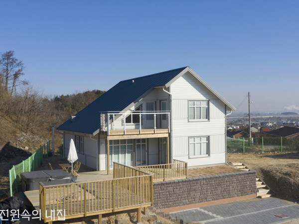 오래도록 튼튼하면서도 즐거운 집을 만들기 위한 세 가지 조건.북쪽 공터에서 보이는 집의 전경현관에 들어서면 보이는 거실과 다이닝룸. 건축주의 손길이 곳곳에 담겨있다.약 20가구가 모여 사는 조그만 동네. 앞으로는 아라뱃길의 고즈넉한 정취가 흐르고 뒤로는 산자락의 포근한 기운에 둘러싸여 있는 이곳에, 60대 부부가 그들의 노년을 꿈꾸며 쉼터를 지었다.설계와 시공을 맡은 ‘더원하우징’은 30년 가까이 된 구옥에 살고 있던 부부의 집을 허물고, 새로 시작할 앞으로의 공간을 만들었다. 56평의 널찍한 연면적에도 불구하고 단 2개의 방만 설계한 집은, 1층에는 LDK와 안방, 2층에는 취미실과 드레스룸이 전부다. 지인들의 방문이 잦아 복잡한 동선을 원치 않고, 넓게 공간을 사용하고 싶어 했던 건축주의 생활 환경에 맞춘 설계였다. 주방과 다이닝룸·거실은 일직선으로 이어지고, 보조 주방·데크와도 회유 동선으로 연결되어 언제든 야외의 풍경을 만끽할 수 있다. 거실 천장은 박공지붕의 모양을 그대로 살렸다.오디오에서 흘러나온 음파가 충분히 공간 안에 머물 수 있도록 도움과 동시에, 탁 트인 시야를 제공한다. 다이닝룸을 장식하는 우물천장에는 서까래처럼 생긴 기다란 나무들이 줄지어 있는데, 이는 사실 시스템 에어컨의 배관이 지나가는 곳으로 한 줄씩 디자인해 감싼 것이다.브라운과 화이트 색상의 세라믹 사이딩으로 둘러진 외관. 빗물받이 시스템이 장착되어 관리가 손쉽다.프라이버시와 방범에 힘쓰는 건축주의 집답게 사방에 CCTV가 설치되어 있다.포치의 천장은 뒤틀림, 부서짐 같은 목재의 단점을 보완한 탄화목으로 마감했다.PLAN①현관 ②데크 ③침실 ④드레스룸 ⑤욕실 ⑥화장실 ⑦세탁실 ⑧주방 ⑨다이닝룸 ⑩거실 ⑪보조주방 ⑫취미실 ⑬발코니 ⑭주차장HOUSE PLAN대지위치 ▶ 인천광역시 계양구 대지면적 ▶ 227.4㎡(68.7평) | 건물규모 ▶ 지상 2층 | 구성원 ▶ 2명(부부) 건축면적 ▶ 122.76㎡(37.1평) | 연면적 ▶ 187.56㎡(56.7평) 건폐율 ▶ 53.98%(법정 60%) | 용적률 ▶ 82.48%(법정 300%) 주차대수 ▶ 1대 | 최고높이 ▶ 8.4m 구조 ▶ 기초 – 철근콘크리트 매트기초, 지상 – 내·외벽 2×6 경량목구조 / 지붕 2×8 경량목구조 S.P.F JAS등급단열재 ▶ 그라스울(저에너지 하우스용) R21(내벽) / R23(외벽) / R37(천장) 외부마감재 ▶ 케뮤 세라믹 사이딩 16mm 창호재 ▶ 공간창호 AL 35mm 3중 시스템 창호 철물하드웨어 ▶ 심슨스트롱타이 | 에너지원 ▶ 기름보일러 설계·시공 ▶ 더원하우징 031-708-2330 www.theonehousing.net중문은 3연동 도어를 설치해 내부의 직접적인 노출은 피하고 단열을 도왔다.계단실 옆에는 세탁실이 위치한다.“건축주가 원하는 요청사항은 확실했어요. 첫째로 건강할 것. 둘째로 프라이버시가 보장될 것. 셋째로 취미 생활인 음악 감상을 마음껏 할 수 있을 것. 어쩌면 집에 관한 가장 근본적이면서도 어려운 과제들이었지만, 건축주가 몇십 년 동안 무탈하고 안전하게 보낼 수 있는 요새를 만드는 게 저희 목표이기 때문에 주어진 조건 안에서 최선을 다했죠.”‘웰빙하우스’를 표방할 만큼 내구성과 단열, 재해에 민감했던 건축주는 내진에 강하면서도 라돈이나 유해가스 노출의 위험이 적고, 결로에 자유로운 목조주택을 짓길 원했다. 이것이 부부가 업체를 결정하게 된 배경인 만큼, 더원하우징은 벽지와 풀에서 나오는 유해물질을 차단하기 위해 친환경 페인트인 벤자민무어로 집의 내벽을 칠했다. 외장재로 사용한 금속 마감재 역시 컬러강판이 아닌, 100년 이상의 수명을 자랑하는 티타늄 징크를 선택해 건축주가 노년에도 손이 자주 가지 않도록 하는 등 골조부터 마감까지 신경 쓴 흔적이 집 안 곳곳에 역력하다.주방·외부 데크와 연결되어 있는 보조 주방에도 개수대를 설치해 편의성을 높였다. 조명은 부부의 집에서 빠질 수 없는 인테리어 소품이다.대지의 남쪽과 동쪽에 이웃집이 면한 형태였기 때문에 프라이버시를 고려해 북쪽과 서쪽으로 최대한 붙여 이격거리를 확보했다. 북쪽은 아라뱃길이 보이는 공터로, 해당 방면으로 다양한 크기의 개구부를 냈다. 거실에는 4개의 조그만 천창을 내어 빛의 유입을 도왔으며, 블라인드는 이중으로 설치해 단열과 프라이버시를 한층 강화했다. 이는 상하 자유자재로 움직여 때로는 푸른 하늘을, 때로는 데크에 앉아 노는 손자들의 모습을 볼 수 있다.2층은 건축주의 취미인 오디오 감상을 위해 통째로 취미실로 꾸몄다. 아트월의 느낌을 내면서도 오디오의 소음을 잡아줄 수 있는 흡음판을 한쪽 벽에 시공하고, 각종 연결선과 장비들을 가릴 수 있도록 발코니에 빌트인 수납장도 짜 넣었다. 취미실 한쪽에는 조그마한 드레스룸 겸 침실을 하나 더 내어 지인들이 놀러 왔을 때도 문제없이 대처할 수 있다.SECTION①현관 ②데크 ③침실 ④드레스룸 ⑤욕실 ⑥화장실 ⑦세탁실 ⑧주방 ⑨다이닝룸 ⑩거실 ⑪보조주방 ⑫취미실 ⑬발코니 ⑭주차장INTERIOR SOURCE내부마감재 ▶ 1층 벽 - 벤자민무어 친환경 도장, 1층 다용도실·2층 발코니 – 루나우드 루버, 2층 벽 - LG하우시스 합지벽지 / 1·2층 바닥 - 강그린 SUPER 강마루 욕실 및 주방 타일 ▶ 수입 자기질타일 | 수전 등 