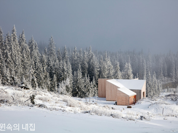 눈이 내리면 온 세상이 하얗게 변하는 북유럽의 한 마을. 비가 오나 눈이 오나 변하지 않고 늘 그 자리에 서 있는 바람개비가 하나 있다.노르웨이의 수도, 오슬로 외곽에 위치한 집, 밀라 히테(MYLLA HYTTE). 히테는 노르웨이어로 ‘별장’, ‘오두막집’이란 뜻으로 근처에 위치한 호수에서 따 이름을 붙였다. 아담한 사이즈로 지어진 집은 지질학자 가족의 휴식을 위한 공간으로 설계된 곳이다. 평온한 언덕 위에 자리하고 있어 주변의 풍경이 한눈에 보이는 것이 특징. 뒤로는 소나무숲이 자리하고, 앞으로는 넓은 평야 넘어 잔잔한 밀라호수의 모습이 보인다.위에서 보면 바람개비 같은 4개의 날개가 선명히 보인다.해가 잘 드는 다이닝룸과 연결된 앞마당에선 가족들이 차를 마신다.카약을 취미로 즐기는 가족들을 위해 집 앞에 이를 보관할 창고를 만들었다.HOUSE PLAN대지위치 ▶ 노르웨이, 예브나케르시(Jevnaker County) 연면적 ▶ 주택 - 84㎡(25.41평) / 창고 - 16㎡(4.84평) 건축팀 ▶ Auste Cijunelyte, Tom Erdman, Lexie Mork-Ulnes, Casper Mork-Ulnes, Anatoly Starr 설계 ▶ Mork-Ulnes Architects www.morkulnes.comSITE PLAN건축 규정상 박공지붕이 필요했지만, 이 집은 박공을 반으로 절개하여 바람개비 모양의 형태로 구성되었다. 눈이 와도 경사진 지붕에 의해 피해를 보지 않는 현관 앞, 북쪽 대지와 반대편 남쪽 대지에 만든 2개의 마당에서는 전혀 다른 경관의 정취를 느낄 수 있다. 이를 연결시키는 디딤석은 집의 서쪽을 둘러싸고, 집의 외관을 닮은 약 5평의 창고까지 연결된다. 외벽은 가공 처리하지 않은 소나무 심재 패널로 마감했다. 이는 시간의 흐름에 따라 잿빛이 되고, 바래지면서 계절의 변화를 보여줄 것이다.다양한 개구부와 반으로 잘린 박공지붕의 모습이 눈에 띈다.다이닝룸과 마주 보고 있는 거실침대에 누우면 설경이 한눈에 들어온다.PLAN합판으로 마감하고 이어지는 지붕 캐노피를 더한 실내 공간은 최대 10명을 수용할 수 있는 3개의 전용 침실과, 시설이 완비된 2개의 욕실을 갖추고 있다. 침대 프레임과 이층 침대, 소파, 식탁, 벤치 및 선반을 포함한 맞춤형 합판 가구가 집 안 곳곳을 이루며 따뜻한 느낌을 선사한다.집의 날개 부분은 네 가지 풍경을 담고 있다. 큰 방에서는 밀라 호수가 보이고, 손님방에서는 완만한 언덕, 아이들 방에서는 하늘이 보이며, 침실에서는 건너편에 우뚝 솟은 숲이 보인다. 하나의 자연에 폭 안긴 듯하면서도, 서로 다른 결의 바람이 부는 밀라 히테는 팔색조 같은 매력을 느끼게 한다.자녀 침실. 2층 침대를 제작해 공간을 효율적으로 구성했다.부부침실로 들어가는 통로. 붙박이장에 각종 책과 그릇을 전시해 놓았다.주방의 오른쪽으로는 북쪽 마당과 현관이, 왼쪽으로는 남쪽 마당이 위치한다. 남쪽 마당으로 나가는 문은 위아래가 나뉘어 열려 창문의 역할도 한다.SECTION구성 _ 편집부 사진 _ Bruce Damonteⓒ 월간 전원속의 내집 / www.uujj.co.kr