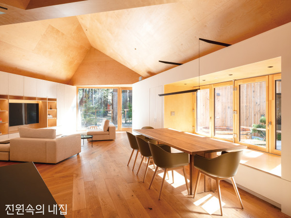 울창한 나무 사이를 걷다 보면 마주하게 되는 단정한 경사 지붕의 집. 예상치 못한 아름다운 풍경은 마음 한편을 따스하게 한다.내부 한 쪽에 마련된 책을 읽는 공간. 창밖의 나무들이 온전한 쉼의 공간이 될 수 있게 도와준다.건물의 정면. 박공지붕은 외부의 표정을 만드는 중요한 요소가 되었다.이 프로젝트는 Airbnb를 통해 여행객들이 단기간 머무를 수 있는 50평 규모의 펜션을 설계해 달라는 클라이언트의 의뢰로 시작되었다. 대지는 미국 샌프란시스코에서 차로 3시간 정도 떨어져 있는 사우스 레이크 타호(South Lake Tahoe)에 위치하고 있다. 샌프란시스코와 비교적 가까운 거리이기에 그곳에서 일상을 보내는 사람들이 스키와 수상스포츠 및 각종 레저 활동을 위해 가장 즐겨 찾는 주말 휴양지로 알려진 곳이다. 클라이언트와 협의를 거쳐, 이 집의 디자인은 휴양지로서의 상황을 고려하여 일반적인 집에서 경험하지 못하는 새로운 공간을 만들어주자는 데 자연스럽게 의견이 모였다.주택 모형 사진아름다운 호수와 인접한 대지. 이 주어진 대지의 조건을 섬세하게 읽어내는 작업을 통하여 여행객들에게 일상에서 접하지 못하는 새로운 공간감을 제공하려 노력하였다. 그리하여 펜션의 새로운 프로토타입(Prototype)을 개발해 보자는 것에 클라이언트와 뜻을 같이하며 디자인을 시작하였다.실제로 이 지역은 자연 보호 차원에서 일정 지름 이상 되는 나무 벌목 시 일반적인 건축물 허가에 추가로 ‘수목 벌채 허가’라는 까다로운 절차를 밟아야 했다. 보통은 ‘제약’이 되는 법규를, 반대로 디자인의 ‘기회’로 적극 활용하고자 했고, 이러한 발상의 전환을 바탕으로 건축적인 개념을 발전시켜나갔다.조명이 켜진 건물은 나무로 가득 채워진 숲속 풍경과 더욱 잘 어우러진다.현관 쪽 모습. 2층까지 오픈된 시원한 천장고가 공간의 개방감을 더한다.PLAN①주차장 ②현관 ③세탁실 ④욕실 ⑤주방 ⑥거실 ⑦식당 ⑧갤러리 ⑨스파 데크 ⑩독서 공간 ⑪침실 ⑫다락 침실 ⑬아트리움 HOUSE PLAN대지위치 ▶ South Lake Tahoe, California 대지면적 ▶ 410.25㎡(124.10평) | 건물규모 ▶ 지상 2층 건축면적 ▶ 185.99㎡(56.26평) | 연면적 ▶ 214.79㎡(64.97평) 건폐율 ▶ 40% | 용적률 ▶ 50% 주차대수 ▶ 2대 | 최고높이 ▶ 7.8m 구조 ▶ 기초 – 철근콘크리트 줄기초 / 지상 – 벽 : 경량목구조 + 심슨스트롱 월, 외벽 2×6, 지붕 : 2×12 구조목단열재 ▶ 1차 Spray Cell Insulation, 2차 그라스울 24K 외부마감재 ▶ 벽 – 시베리안 Larch 사이딩 / 지붕 – 아스팔트 타일 창호재 ▶ Zola Thermo Plus 3중창 | 철물하드웨어 ▶ 심슨스트롱 타이 열회수환기장치 ▶ ZEHNDER 콤포에아 160 + Broan ERV 에너지원 ▶ Lochinvar Wall Mount Condensing Boiler 구조설계(내진) ▶ Enertia, San Francisco 시공 ▶ Sierra Sustainable Builders 설계 ▶ 김선형내부 전경. 다양한 지붕 모양은 특별한 장식 없이 그 자체로 하나의 오브제가 되어준다.1층 갤러리 복도와 큰 창을 통해 보이는 실외 테라스드론으로 촬영한 외관. 나무 사이로 배치된 건물의 형태가 인상적이다.첫 방문 시 가장 눈에 들어오는 것은 역시 사이트를 빽빽하게 메운 나무들과 그 사이로 나 있는 산책로였다. 클라이언트에게 대지에 지어지는 집 자체가 나무 사이로 흘러가는 기존 산책로와 같은 공간이 되었으면 좋겠다는 이야기를 했고, 이를 클라이언트가 흔쾌히 받아주었다.이와 같은 디자인 개념을 가지고 대지의 나무들 사이로 주어진 요구 실들을 배치하다 보니 현관부터 침실까지 이어지는 연속적인 공간의 흐름을 갖게 되었다. 동시에 공적인 현관부터 사적인 침실까지 자연스럽게 거리가 생겨 편안한 경계를 형성하였다. 더불어 천장에는 각각의 프로그램을 구분하는 수벽을 두어 이용객이 내부를 걸어가며 공간을 하나씩 발견해나가는 일련의 경험을 제공한다. 여행자들을 위한 집이니만큼 이 자체가 출발지와 목적지를 갖는 여행의 경험과 닮아 있는 집의 구조를 가지게 된 것이다.실제로 현관 진입부터 산책하듯 집의 내부를 걸으면 항상 나무가 가까이 있어 외부로의 뷰가 열리는 느낌을 받게 된다. 또한, 나무 사이로 공간을 꺾어서 배치하다 보니 자칫 단조로워질 수 있는 내·외부 공간이 좀 더 다채롭고 유기적으로 엮어짐을 확인할 수 있었다.(위, 아래) 나무로 마감하여 친환경적인 분위기를 연출한 2층 공간채광 좋은 거실과 다이닝룸주방은 블랙 앤 화이트 조화로 깔끔하고 고급스럽게 완성했다.두께를 가진 벽들은 다양한 크기의 수납공간들을 포함하여 벽을 실용적으로 이용할 수 있도록 배려하였고, 겨울이 되면 눈이 많이 오는 이 지역의 특성상 법규에 따라 경사 지붕을 계획하여 설하중에 대비했다.이 집의 설계에는 시공성을 위해 두 가지의 최적화 과정이 필요했다. 첫 번째는 지붕의 평활도를 유지하면서 벽체가 만나는 각도를 통일하는 것. 이를 위해 컴퓨터 알고리즘을 통해 8개의 다른 모양의 지붕면이 가지는 경사 및 각도를 4개로 통일하였고, 모든 지붕면을 평평하게 유지할 수 있었다. 이는 자동적으로 목구조 시공 시 사용 부재의 절단 및 이용에서 효율적인 공정을 가져왔고, 건축적으로는 각각의 공간마다 다른 지붕 모양