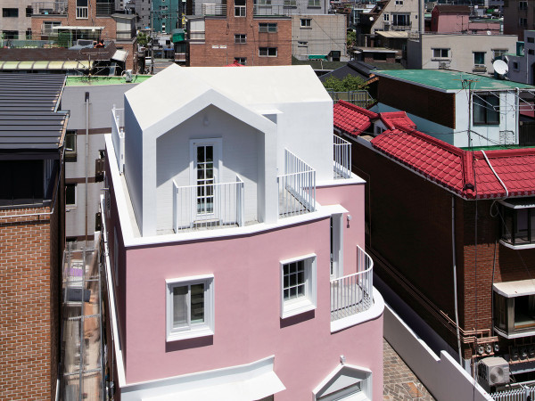 비슷한 모습의 건물들로 채워진 조용한 주택가에 핑크 컬러의 옷을 입은 3층 건물이 세워졌다. 오래된 골목을 환하게 밝히는 화사한 빛깔의 집.핑크 컬러로 새 옷을 갈아입은 주택 전경발코니를 둔 증축된 3층 모습건물 매매를 대행했던 부동산을 통해 리모델링해 줄 건축사를 소개받기로 했던 건축주는 우연한 기회(마침 부동산이 그날 휴무였다)에 근처 우리 사무실을 발견하고 문을 두드렸다. 큰 기대 없이 문의 차 방문했던 건축주와 우리의 만남은 그렇게 이루어졌다. 같은 지역의 거주민으로서 동네 프로젝트에 대한 애정이 많았던 우리에게 큰 사건이자 의미 있는 인연의 시작이었다.서울 마포구 상수동, 당인동 일대에는 오래된 단독주택과 다가구주택이 즐비하다. 낡은 주택은 헐리고 신축되거나 리모델링되어 동네에 자리 잡고 있다. 그런 주택들은 각자가 처한 상황들과 경제적 여건, 필지의 크기나 건물의 사용 목적에 의해 새 옷을 입게 되고 새 볼륨을 갖게 된다.동네 속에 녹아든 집. 개성 있는 외관은 홀로 돋보이기보다 오히려 오래된 주변 풍경을 밝혀주는 결과를 가져왔다.작은 필지 하나하나가 모여 동네의 분위기를 만들고, 여러 동네가 모여 한 도시의 특색이 되기도 한다. 하지만, 획일화된 대규모 아파트 단지처럼 이 동네에 새로 개발된 저층 건물들도 엇비슷한 모양새를 이루고 있었다. 이러한 환경 속에서 우리는 당인동 작은 필지 위에 조금은 특별한 동네의 입면을 제안하고 싶었다.1층에 들어올 딸의 소품 가게는 전체 건물의 주요색을 핑크 컬러로 결정하게 된 계기가 되었는데, 이는 결과적으로 이 주택만의 특별함을 더해주었고, 인접한 다가구주택 단지 속에서 유쾌한 얼굴이 되는 결실을 맺었다.PLAN①근린생활시설 ②화장실 ③거실 ④방 ⑤현관 ⑥주방 ⑦발코니HOUSE PLAN대지위치 ▶ 서울시 마포구 대지면적 ▶ 112㎡(33.88평) | 건물규모 ▶ 지상 3층 건축면적 ▶ 66.94㎡(20.24평) | 연면적 ▶116.03㎡(35.09평) 건폐율 ▶ 59.77% | 용적률 ▶ 103.6% 최고높이 ▶ 11.32m 구조 ▶ 기초 – 철근콘크리트 줄기초 보강 + 독립 기초 / 지상 – 조적조 + 경량철구조 단열재 ▶ 비드법보온판 2종3호 60, 150mm, 경질우레탄폼단열재(PIR) 1호 60, 90, 140, 220mm 외부마감재 ▶ 외단열시스템 에너지원 ▶ 도시가스 | 전기·기계·설비·토목 ▶ ㈜스타시스 구조설계(내진) ▶ 파워구조 시공 ▶ ㈜스타시스 설계 ▶ 씨티알폼 건축스튜디오BEFORE - 리모델링 전 건물은 1970년대 지어진 2층 주택이었다. 겉은 멀쩡해 보였지만, 기존의 것은 대부분 살릴 수 없을 정도로 노후화된 상태였다.3층으로 오르는 계단과 블루 컬러의 방문이 포인트가 되어주는 거실. 좌측에 주방이 자리한다.적재적소에 낸 창은 늘 집 안에 환한 빛을 들여 크지 않은 면적의 거실이 확장되어 보일 수 있게 돕는다.계단실 벽면에 책장을 짜 넣어 공간을 활용할 수 있도록 배려했다.먼저, 1972년 최초 사용승인을 받은 기존 2층 주택을 3층으로 확장 계획했다. 수직 증축과 노후화에 따른 구조 보강을 위해 철거 전 구조 안전 진단을 받았고, 각 가족 구성원들의 생활 패턴과 성향에 따라 설계가 진행되었다. 1층의 일부는 딸이 운영할 작은 가게가 들어서고, 나머지 1층 부분과 2, 3층은 4명으로 이루어진 한 가족의 주거공간으로 구체화되었다.철거를 시작하니 예상대로 1970년대 주택에서 흔히 보이는 빈약한 기초가 나타났다. 기존 줄기초 보강뿐 아니라 독립 기초 및 많은 부분의 구조 보강이 필요하였다. 1층의 조적 벽은 최대한 살렸으나, 구조적인 문제로 인해 2층은 철거 후 3층과 함께 다시 증축했다. 기존 건물의 요소를 많이 살리지 못하는 상황이었기 때문에 새로운 형태와 외장을 제안하였다.거동이 불편하신 할머니를 위한 1층은 독립적으로 활용이 가능한 주거공간으로 계획했다. 2층은 어머니, 딸을 위한 방과 주방, 아담한 거실 및 발코니를 배치했고, 3층에는 아들 방과 발코니를 두었다.SECTION①근린생활시설 ②화장실 ③거실 ④방 ⑤현관 ⑥주방 ⑦발코니INTERIOR SOURCE내부마감재 ▶ 벽 – 윤현상재 Basic A30RB 아이보리, KFC2658 짙은그레이, LG하우시스 휘앙세 합지벽지 퍼그먼트라이트그레이 / 바닥 – 세시나01 화이트마블 타일, 스타강마루 워시오크 욕실 및 주방 타일 ▶ 윤현상재 수입 타일 |수전 등 욕실기기 ▶ 아메리칸스탠다드 주방가구 ▶ 에넥스 |조명 ▶ 필립스 매입 조명, 레일 조명, 모던 LED 방수 계단재·난간 ▶ 멀바우 + 평철 난간 현관문 ▶ AEVO 스탠다드 + 경동 도어락 |중문 ▶ 노루하우홈 원슬라이딩 망입 방문 ▶ 한솔 ABS HMA-G01 딥블루 |붙박이장 ▶ 제작3층 진입부 모습. 박공지붕의 형태가 내부에 고스란히 전달된다.사용자의 편의를 고려해 ‘ㄱ’자로 배치한 주방 ©오충석채광 좋은 곳에 놓인 작업 공간2층과 3층에는 각 두 곳씩, 총 네 곳의 발코니가 있는데, 이는 높은 천장고와 함께 작은 규모의 주택에서 인지 공간 및 활동 범위의 확장을 위한 중요한 요소로 자리 잡았다. 외부로 연결되는 작은 발코니는 각 구성원의 개별 공간이며, 큰 발코니는 가족들과 지인들에게 이벤트 공간을 제공한다. 또한, 다소 폐쇄적일 수밖에 없는 도심형 주거공간에