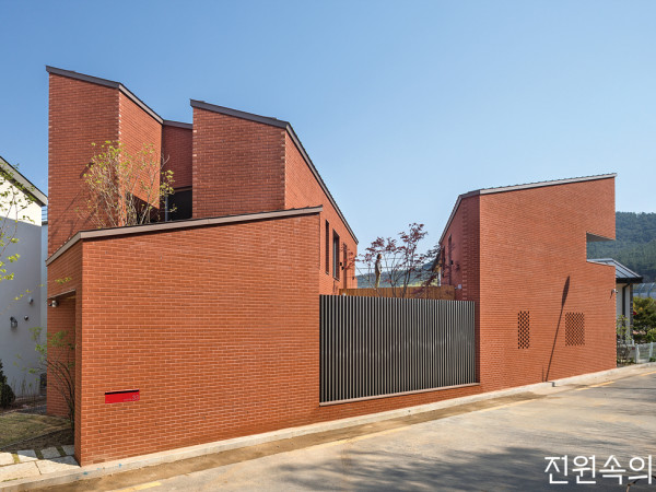오랫동안 연을 잇고 살아오던 두 가족이 나란히 집을 지었다. 겉은 비슷하지만 속은 완전히 다른 그들의 특별한 동거.너른 대지와 탁 트인 주변 환경을 가진 땅은 다양한 설계를 시도를 할 수 있지만, 주어진 조건이 제한되어 있는 경우는 매 순간 신중한 선택이 필요하다. 레드하우스, 그레이하우스로 이뤄진 수지두집의 경우도 땅을 구입하는 일부터가 난관의 시작이었다. 잘 알고 지내던 두 가족이 함께 집을 짓기로 결정하고, 마음에 드는 터를 발견했다. 각각 한 필지씩 처음에는 2필지를 샀으나, 가족들이 원하는 집을 담아내기엔 공간이 부족해, 결국 한 필지를 더해 둘로 나누기로 했다. 대지 동쪽은 산에 접해있고, 반대편 서쪽은 도로에 면해있어 풍광이 완전히 다른 느낌을 주었기 때문에 조경이 주변과 잘 어우러지는 것 또한 중요했다. 설계를 맡은 홈스타일 토토의 임병훈 소장은 “단지의 전반적인 모양새가 촘촘하기 때문에, 수지두집에는 약간의 여유를 두어 동네의 쉼표를 만들고자 했다”라며 “앞집과의 이격거리가 좁은 상황에서 최대한 조망과 채광을 확보해야 했기 때문에 계단형으로 매스를 잡았다”고 설명했다.계단형의 매스가 눈길을 끄는 레드하우스의 후면부 오밀조밀 행복을 엮은 레드하우스레드하우스의 디자인 콘셉트는 ‘아기자기’다. 부부와 4명의 아이가 사는 이곳은 나무를 활용한 따뜻한 인테리어가 포인트. 부부와 아이들의 침실이 각기 따로 존재하면서도 서재, 취미실, 수납을 도와줄 다용도실이 갖춰져야 했기 때문에 공간을 효율적으로 나누는 것이 설계의 핵심이었다. 또한, 취미 생활도 놓칠 수 없어 오디오 마니아인 건축주를 위한 방음실도 거실 한가운데 구성했다. 부부 침실은 드레스룸으로 들어가 욕실과 파우더룸을 지나 다다르도록 해 프라이버시를 지키고, 동선의 편의도 배려해주었다. 2층에 위치한 네 아이의 침실과 서재는 천창과 가로창을 여러 군데 내어 채광을 도왔다. 이 집의 또 하나의 특징은 다락. 2층에서 한 계단 더 올라가면 나타나는 다락은 4명의 아이를 키우며 충분한 수납공간이 필요했던 건축주에게 소중한 장소다.PLAN(좌)레드하우스 & (우)그레이하우스 / ①차고 ②창고 ③덤웨이터 ④현관 ⑤다용도실 ⑥취미실 ⑦화장실 ⑧주방 ⑨식당 ⑩거실 ⑪드레스룸 ⑫침실 ⑬서재 ⑭테라스 ⑮세탁실 ⑯다락HOUSE PLAN대지위치 ▶ 경기도 용인시 대지면적 ▶ 249.3㎡(75.41평/레드), 249.6㎡(75.50평/그레이) 건물규모 ▶ 지하1층, 지상2층 | 거주인원 ▶ 레드 - 6명(부부 + 자녀 4), 그레이 - 4명(부부 + 자녀 2)건축면적 ▶ 121.35㎡(36.70평/레드), 119.34㎡(36.10평/그레이) 연면적 ▶ 361.39㎡(109.32평/레드), 358.01㎡(108.29평/그레이) 건폐율 ▶ 48.68%(레드), 47.81%(그레이) |용적률 ▶ 95.88%(레드), 95.63%(그레이) 주차대수 ▶ 각 2대 |최고높이 ▶ 9.14m(레드), 8.9m(그레이) 구조 ▶ 기초 - 철근콘크리트 줄기초 등 / 벽 - 경량목구조 외벽 2×6 구조목 / 지붕 - 2×10 구조목 단열재 ▶ 지붕 - 가등급 아이신 수성연질폼 235mm / 벽 - 140mm 삼익산업 미네랄울 단열재 TR(밀도100) 외부마감재 ▶ 외벽 THK18 모노타일 + 뉴테크우드 합성목 / 지붕 - 포스맥 강판 (광장건업) 창호재 ▶ 살라만더 독일식 3중유리 46mm 철물하드웨어 ▶ 심슨스트롱 타이 열회수환기장치 ▶ ZEHNDER |에너지원 ▶ 도시가스, 태양광패널 조경 ▶ 시운조경디자인 전기·기계 ▶ 태양전설 구조설계 ▶ 금나구조 디자인 ▶ 홈스타일토토 02-720-6959, www.homestyletoto.com시공 ▶ JCON 032-567-1610, www.jconhousing.com 인허가 ▶ TOTO 건축사사무소 마당과 연결되어 있는 주방, 다이닝룸에는 폴딩도어를 설치해 언제든지 정원을 누릴 수 있게 했다. 마당과 연결된 창으로 풍부한 빛이 유입된다. 2층 복도. 한층 더 올라가면 다락이 있다. 박공지붕 모양이 두드러지는 서재.POINTPOINT 1 - 미네랄울 습기와 화재에 강한 단열재인 미네랄울을 집 전체에 둘러 시공했다. 지상과 지하가 만나는 부분에는 연질폼을 채워 넣어 결로방지에 힘썼다.POINT 2 - 덤웨이터 소하물 전용 엘리베이터. 차고와 주방을 오르내리며 작동하는 덕분에, 건축주들은 양손 무거운 짐을 덜었다.마당에 심은 단풍나무는 계절의 정취를 느낄 수 있게 도와준다. 뒷산에서 바라본 그레이하우스 현대적이고 세련된 그레이하우스그레이하우스는 레드하우스와 딱 정반대다. 넓고 시원한 공간감과 모노톤의 인테리어를 원한 건축주. 덕분에 1층에는 LDK와 서재만으로 공간을 채웠다. 블랙과 화이트를 사용해 모던한 느낌을 주면서도 각 실들이 큼지막하게 배치되어 있어 시원시원하다. 주방과 다이닝룸이 안마당을 감싸고 있는 구조로, 유리창 밖으로 언제든 야외의 정취를 느낄 수 있다. 그레이하우스의 핵심은 프라이버시다. 부부와 두 자녀의 침실은 모두 2층에 위치하는데, 각 침실마다 화장실이 따로 붙어있다. 또한, 드레스룸과 세탁실은 서로 마주 보고 자리해, 동선을 줄이고 집합수납으로 공간 효율성을 높였다.시원하고 널찍한 그레이하우스 거실화이트, 그레이, 블랙을 중심으로 인테리어 해 모던한 느낌을 살렸다. 바쁜 아침에도 손쉽게 준비할 수 있도록 파우더룸과 욕실, 드레스룸이 연결되어 있다. SE