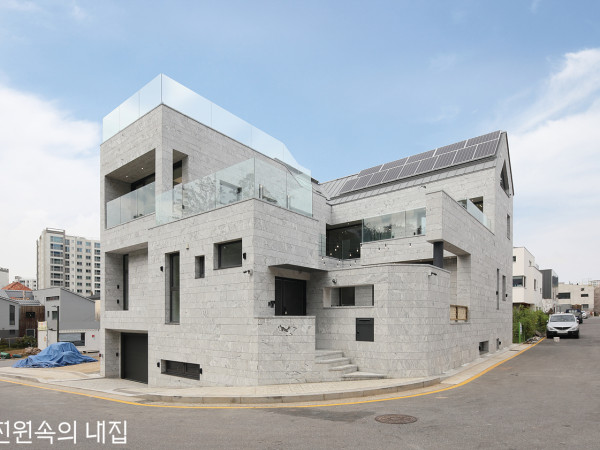 확고한 취향과 분명한 계획으로 집짓기를 시작한 건축주. 특별한 자재와 중정형 구성으로 원하는 것을 모두 얻었다.이웃집과 최대한 이격해 매스를 놓고 주차장과 진입로를 완충 공간으로 삼았다. 미묘한 ‘ㄱ’자 배치 덕에 입체감 있는 외관이 완성되었다.2층까지 오픈한 거실의 층고에 맞춰 창도 시원하게 계획했다. 실내의 개방감이 밖에서도 느껴지길 바란 건축주의 요청사항이었다.베이비부머 세대인 건축주는 오랜 아파트 생활을 청산하고 단독주택행을 결심했다. 여행을 다녀보면서 묵었던 리조트의 경험을 집에서도 느끼고 싶었던 이들은 다양한 요소를 집에 반영하고자 했다. 어디에서든 외부와 통하는 평면 구성, 시원한 통창, 고급스러운 재료 등이 바로 그것이다. 그러나 노년에 접어들수록 도심의 편의시설 이용과 방범이 중요한 법. 이들이 택한 위례지구는 단독주택이 즐비한 단지로, 창을 크게 냈다가는 프라이버시를 지키기가 어렵다. 그렇게 도출된 중정 주택. 마치 요새에 둘러싸인 성처럼 보이지만, 보행로 쪽으로 단차가 단계적으로 낮아져 그리 갑갑하진 않은 모양새다. 안과 밖이 서로 다른 매력을 갖추면서 채광과 프라이버시를 모두 누릴 수 있는 집이 완성되었다.SECTION①현관 ②주차장 ③창고 ④썬큰 ⑤거실 ⑥식당 ⑦주방 ⑧다용도실 ⑨침실 ⑩드레스룸 ⑪욕실 ⑫마당 ⑬가족실 ⑭베란다HOUSE PLAN대지위치 ▶ 경기도 성남시 대지면적 ▶ 287.3㎡(86.90평) |건물규모 ▶ 지하 1층, 지상 2층 + 다락 |구성원 ▶ 2명(부부) 건축면적 ▶ 143.53㎡(43.41평) |연면적 ▶ 454.4㎡(137.45평) 건폐율 ▶ 49.96% |용적률 ▶ 85.23% 주차대수 ▶ 3대 |최고높이 ▶ 11.93m 구조 ▶ 기초 - 철근콘크리트 매트기초 / 지상 – 철근콘크리트 단열재 ▶ 외벽 - 경질우레탄폼 단열재 2종2호 90T / 내벽 – 수성연질폼 50T / 지붕 - 경질우레탄폼 2종2호 150T / 층간바닥 – 압출법특호 30T / 기초 – 압출법특호(가등급) 100T 외부마감재 ▶ 화강석 30T(오픈조인트 마감)창호재 ▶ 이건 시스템창호(AL-3중 LOW-E 코팅유리) 에너지원 ▶ 도시가스, 태양광 전기·기계 ▶ ㈜나라이앤씨 설비 ▶ 동명건축설비 구조설계 ▶ ㈜지우구조기술사사무소 설계 ▶ 남기봉건축사사무소 www.lifefactory.co.kr 시공 ▶ 호멘토(HOMENTO) 1670-6234 www.homento.co.kr도로에서 바라 본 주택의 전경. 내부 쓰임새에 따른 적절한 개구부 계획, 채광과 프라이버시를 위한 높이 차, 평지붕과 경사지붕의 조화 등 단일한 외장재임에도 불구하고 단조롭지 않다.외벽에서 자연스럽게 이어지는 주택의 진입부. 범죄예방환경설계(CPTED)의 기본인 자연적 감시가 가능한 배치다. 오른쪽 벽에는 우편함과 택배함을 매입했다.(위, 아래) 주차장에서 올라가는 전실 현관과 보행로에서 진입하는 현관 내부. 벽과 바닥 모두 대리석으로 마감했다. 계단재 하부 매입 조명 덕분에 마치 공중을 걷는 듯한 기분이다.SPACE POINTPOINT 1 - 넓은 지하 주차장여러 명의 손님이 와도 충분히 수용가능한 주차장. 한켠에 썬큰을 내어 자연광도 비친다.POINT 2 - 럭셔리한 계단실테살로 대리석을 바닥에 깔고 벽면에는 녹색 빛이 오묘히 감도는 베르데 루아나로 마감했다.집은 현관부터 거실, 주방, 침실까지 모든 공간이 외부로 이어지는 구성이다. 이는 개방감 있는 실내 공간을 원했던 건축주의 요청에 따른 것. LDK가 통합된 공용 공간의 마당으로 면한 창은 크기를 키우고 거실 층고도 더 높였다. 주택 안팎으로는 다양한 석재를 주재료로 사용했다. 특히 외장재에 힘을 실었는데, 독특한 패턴과 재질의 화강석을 적용하기 위해 건축주가 직접 해외 자재상을 방문해 원석을 확인하는 수고도 아끼지 않았을 정도. 내부 공용 공간 벽과 바닥에 천연 대리석을 깔고, 다이닝 테이블과 주방 상판 역시 대리석 제품을 골랐다. 그중 압권은 지하 주차장에서 1층으로 올라가는 계단실 벽면의 천연 대리석. 주차장으로 진입하는 경우가 많은 건축주가 직접 고른 제품으로, 녹색 빛의 우아한 자태가 귀가의 기쁨을 배가시킨다.(위, 아래_ 강화 유리를 난간으로 삼은 계단실. 지하에서 최상층까지 오픈된 구조와 넉넉하게 설정한 계단참 덕분에 답답하지 않다.(위, 아래) 매스에 나란히 붙은 테라스는 2층 어디에서도 외부와의 접촉을 가능케 한다.거실의 TV 놓을 벽면은 도로 쪽으로 내면서 자연스럽게 시선을 차폐하고, 마당 쪽으로 큰 창을 냈다.개수대는 거실 쪽을 향하게 두고 본격적인 요리는 안쪽의 보조주방에서 한다. 미닫이문을 닫으면 잔살림을 가릴 수 있다.독립 세대 거주 가능한 장기적 계획향후 거동이 불편해졌을 때를 대비해 건축주의 침실은 1층에 배치하되, LDK와 멀리 배치해 독립적으로 구성했다. 현관 가까이에 둔 손님용 화장실과는 구분된 전용 욕실과 널찍한 드레스룸도 갖췄다. 대리석을 쓴 공용 공간과 달리 침실에는 원목마루와 편백 루버를 시공해 따뜻한 분위기를 자아낸다. 남쪽의 매스를 덜어내고 2층은 ‘ㄱ’자 모양으로 방을 배치해 모든 방에는 동등하게 남향 채광과 외부 공간이 부여될 수 있었다. 추후 자녀 세대가 들어와 살아도 독립적으로 생활할 수 있도록 설비 배관을 별도로 낸 것 역시 주목할 만하다. 외부