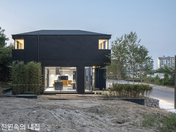 묵직하면서도 날렵한 품새로 몸을 낮춘 집. 어두운 밤, 다가구주택으로 가득한 택지지구에서도 가장 빛나는 까만 점 하나.데칼코마니처럼 대칭을 이루는 주택의 외관 거실과 주방으로 구성된 탁 트인 1층 공용 공간. 검정색 스테인을 입힌 목재와 한지로 만든 접이식 한식 창호를 닫으면 공간을 구분할 수 있다. 왼쪽의 붙박이장 뒤편으로 보조주방과 욕실이 각각 자리한다. 이 집은 한 장의 그림에서 시작되었다.자를 대고 반듯하게 그린 사각형, 그 중앙을 가로지르는 십자 복도와 네 모서리를 방이 차지하는 다이어그램 같은 평면도. 건축주 편석진 씨는 직접 그린 이 그림을 들고 건축가를 찾아간다.손님 초대가 잦은 라이프스타일에 맞춰 1층은 주방과 거실만 둘 것, 2층에는 모두가 성인인 구성원이 동등하게 침실을 가질 것. 요청사항도 그가 그려온 그림처럼 간단해 보였지만, 실제의 주거 구성에 있어 결코 쉽게 해결할 수 있는 문제는 아니었다. 설계를 맡은 리소건축의 김대일 소장과 김남건축의 김진휴·남호진 소장은 단순해 보이는 그림에서 풍부한 평면의 가능성을 읽어냈고, 흥미로운 결과물을 만들 수 있을 거라는 확신이 들어 본격적으로 설계에 착수했다.외벽부터 지붕까지 올 블랙 스타일의 외관은 각각 노출콘크리트와 검정색 컬러강판으로 구현했다. PLAN①현관 ②식당 ③거실 ④다용도실 ⑤욕실 ⑥주차장 ⑦침실 ⑧드레스룸 HOUSE PLAN대지위치 ▶ 경기도 남양주시 대지면적 ▶ 255.4m2(77.25평) | 건물규모 ▶ 지상 2층 | 거주인원 ▶ 4명 건축면적 ▶ 120.24m2(36.37평) | 연면적 ▶ 197.54m2(59.75평) 건폐율 ▶ 47.08% | 용적률 ▶ 77.35% 주차대수 ▶ 2대 | 최고높이 ▶ 7.12m 구조 ▶ 기초 – 철근콘크리트 매트기초 / 지상 – 철근콘크리트 외부마감재 ▶ 외벽 - 노출콘크리트 위 스테인, 럭스틸 / 지붕 - 럭스틸 창호재 ▶ 필로브 알루미늄 시스템창호 + 47mm 로이삼중유리 에너지원 ▶ 도시가스 조경 ▶ 박준경 전기·기계 ▶ 극동파워테크(전기), 타임테크(기계) 구조설계(내진) ▶ 터구조 시공 ▶ 무일건설 02-3789-0142 설계 ▶ 리소건축사사무소 02-797-0305 www.li-so.kr + 건축사사무소 김남 02-6339-9305 www.kimnam.co.kr요리와 홈파티를 즐기는 건축주를 위해 동선이 자유로운 오픈키친을 구성했다. 널찍한 아일랜드 싱크에 두 개의 싱크볼을 배치해 많은 양의 음식을 만들어도 무리가 없다. 날씨가 좋을 때는 마당과 이어지도록 창호에도 신경 썼다. 직사각형에 가까운 반듯한 모양의 땅에 1층은 공용 공간, 2층은 같은 크기의 침실 4개를 배치해야 하는 조건에서, 설계자가 떠올린 건 대칭이었다. 우선, 현대 주거에서 주방과 거실은 동등한 중요도와 위계를 가지기에 양쪽으로 분할하는 것이 무리가 아니었다. 침실 역시 네 모서리의 컨디션이 다르더라도 코너창과 한식 창호를 덧댄다면 공간을 콤팩트하게 설계하면서 활용도를 높일 묘안처럼 보였다. 각 층의 서비스 공간으로 보조주방과 욕실이 한 쌍을 이룰 수 있다는 점에서도 설득력을 가진다.여기에 방점을 찍은 건 현관의 위치다. 건축 수법에서 실내를 한 번에 보여주는 경우는 잘 없기에 건축가들은 다양한 동선을 제안했지만, 그중 건축주가 선택한 건 정중앙에서 진입하는 것이었다. 대신 직접 노출된 면에 수납장을 두어 솔리드하게 처리, 외부 시선을 차단했다.이처럼 대칭에 얽매여 자칫 생활을 불편하게 하는 장치를 건축가들은 경계하고, 효율도 미학도 놓치지 않는 대안을 충분히 제시했다. 취향과 기준이 명확한 건축주의 확고한 의지가 이 집을 더욱 특별하게 만들어주는 열쇠로 작동한 셈이다.현관에서 바라본 실내. 오픈된 계단실 틈 사이로 배면의 경치가 유입된다. 2층의 복도. 사방에 침실이 자리해 양끝과 천창으로 채광을 확보했다. POINT✔ POINT 1 - 노출콘크리트 외벽콘크리트 안료를 농도와 광도를 달리해 8종류 이상 시험한 후, 질감이 유지되도록 시공했다.✔ POINT 2 - 지붕과 현관부지붕과 현관부에는 럭스틸 컬러강판을 적용, 외벽과 톤은 비슷하되 재료는 달리 했다.✔ POINT 3 - 붙박이장과 주방가구실내의 큰 면적을 차지하는 수납장과 아일랜드 상판에도 블랙 인테리어가 반영되었다.1층 다운 욕조는 반려견을 씻기기에도 용이하다. 주어진 공간을 낭비 없이 쓰도록 각 방에는 포켓도어를 달았다. SECTION①현관 ②식당 ③거실 ④다용도실 ⑤욕실 ⑥주차장 ⑦침실 ⑧드레스룸 INTERIOR SOURCE내부마감재 ▶ 벽 - 벤자민무어 친환경 도장 / 바닥 - 원목마루, 이태리 수입타일 욕실 및 주방 타일 ▶ 유로세라믹 수입타일, 윤현상재 수입타일 수전 등 욕실기기 ▶ 세면기 – catalano zero, 샤워수전 - axor, 세면수전 – crestial, 욕조 – 새턴바스, 양변기 – 아메리칸스탠다드 붙박이장·주방 가구 ▶ 와셀로 www.wacello.co.kr 조명 ▶ the edit 펜던트 조명, the lite 매입 조명 플라워디자인 ▶ 플라워바이손, 김진희 계단재·난간 ▶ 포천석 현관문 ▶ 필로브 알루미늄 시스템도어 + 47mm 로이삼중유리 중문·방문 ▶ 제작 코너창과 한식 창호로 조절하는 조망과 일사량 ⓒ김남건축 2층 복도 끝에서 내려다 본 1층 현관. 현관에 들어서면 지붕까지 이어지는 높은 층고를 경험한다. 건축가들의 또 