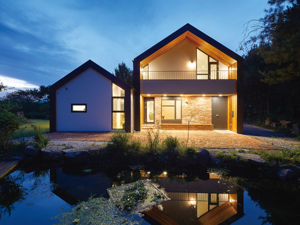 깊은 산속 옹달샘 옆, 이 땅에 오래전부터 존재했던 것 같은 집. 가장 단순한 형태의 담백한 쉘터(Shelter)를 만들고자 한 부부의 바람이 녹아들었다.정원에서 바라본 주택 전경. 건강상의 이유로 양평에 내려오게 된 부부를 위해 목구조를 택하고, 내부는 천연재료를 적용했다. 그 집에 서류를 두고 온 걸 알고 다시 차를 돌렸다. 깊은 숲속, 여느 곳보다 일찍 찾아온 어둠과 이슬 젖은 흙내음이 집을 감싸고 있었다. 불 켜진 창, 노란 불빛 아래 도란도란 이야기를 나누고 있는 부부는 그지없이 평온해 보였다. 이들의 소박한 꿈이 깃든 터전. 달빛이 차고 기울고 다시 차오르며 노니는 곳, 바로 ‘월산리’다.ELEVATION & SECTION ①현관 ③거실 ⑪안마당 ⑬정원 ⑮서재 어둠이 내려앉은 시간, 견고한 쉘터에 불빛이 켜지고, 정원으로 열린 창 너머로 저녁 풍경이 펼쳐진다.자연 풍경 속에 녹아든 두 개의 단순한 쉘터 이 작은 골짜기는 신기하게 작고 진한 것들이 응축되어있다. 산에서 내려오는 경사는 약간의 평지를 마련해놓고 다시 아래를 향해 비스듬히 흘러간다. 자칫 잘못하면 에너지가 속절없이 저 너머로 흘러버리고 마는 약간의 긴장감이 있는데, 그 긴장감을 해소해주는 것이 바로 부부의 ‘비밀 정원’이다. 그들이 정성스럽게 가꾼 소박한 정원의 밝고 환한 생명력이 땅의 중심을 잡아주고 에너지를 모은다.낭만적인 풍경의 이 땅은 집의 울타리가 되는 개울을 건너와야 비로소 그 안에 들어올 수 있다. 그리고 건강하게 숨 쉬고 있는 작은 자연 연못과 마주할 수 있다.건물은 주인이자 주인이 아니다. 원형질의 가장 단순한 형태로 기능을 담고자 했다. 원초적인 삼각 지붕의 집 두 개가 나란히 붙어 있는 것. 단순한 두 개의 볼륨이 그 원초성이 주는 아우라로 땅에 단단히 서 있다.다리를 건너자마자 만나는 입구 측 모습. 외부로부터 시선을 보호하기 위해 창을 최소화했다. 해 질 녘 정원과 작은 쉘터 HOUSE PLAN대지위치 ▶ 경기도 양평군 대지면적 ▶ 698m2(211.14평) 건물규모 ▶ 지상 2층 거주인원 2명(부부) 건축면적 ▶ 134.75m2(40.76평) | 연면적 ▶ 198.91m2(60.17평) 건폐율 ▶ 19.31% | 용적률 ▶ 28.50% 주차대수 ▶ 1대 최고높이 ▶ 7.6m 구조 ▶ 기초 – 철근콘크리트 매트기초 / 지상 – 벽 : 경량목구조 2×6 구조목, 지붕 : 2×10 구조목 단열재 ▶ 그라스울 24K | 외부마감재 ▶ 외벽 – 천연슬레이트, 스터코 / 지붕 – 천연슬레이트 창호재 ▶ 공간 알루미늄 시스템창호(에너지등급 2등급) 철물하드웨어 ▶ 심슨스트롱타이 시공 ▶ 윤형근 설계 ▶ 씨엘건축사사무소(김길령)벽과 지붕을 동일한 재료로 선정하여 쉘터의 성격을 더욱 부여했다. 은색의 천연슬레이트는 날씨에 따라 다르게 변하는 마감재로, 외관의 단순한 형태를 구현하는 데 적합했다. 개울을 건너 들어오면 먼저 외부로부터 듬직하고 담담한 이미지를 주는 큰 매스를 마주하게 된다. 그리고 건물을 살짝 돌아 땅 안쪽에 정원으로 열린 작은 매스가 있다. 이곳을 베이스캠프로 부부는 정원 일을 하고 밥을 짓고 식사를 하고 그림을 그린다. 때로는 햇빛을, 때로는 그늘을 찾아 자연과 쉘터(Shelter) 사이를 오가다 보면 어느새 어둠이 찾아올 것이다. 그 어둠이 좀 더 짙어지면 부부는 견고하고 아늑한 큰 매스로 가 휴식을 취하게 된다.두 매스는 각각의 기능을 달리한다. 바깥쪽의 큰 것은 창문을 최소화하며 주로 프라이빗한 기능을 담아 거실, 서재, 침실 등을 두었다.주방과 식당이 있는 작은 쉘터는 오픈형 평면이라 목조로 구현하기 어려운 형태였지만, 일부 중목 소재를 반영하여 목구조의 새로운 가능성을 발견했다.거실에서 본 식당. 내부 재료는 벽돌, 목재, 규조토 등을 사용하여 전체적으로 따뜻하고 원초적인 질감이 있는 분위기를 연출하고자 했다. 안쪽의 작은 것은 자연에 활짝 열린 카페 같은 분위기의 주방과 식당 공간을 연출하였는데, 이는 설계 초기부터 건축주의 요구사항이기도 하였다.1층은 두 개의 바닥 레벨로 구성되었다. 바깥쪽과 안쪽의 공간의 깊이감과 실제 대지 레벨을 고려한 것으로, 거실에서 계단을 두 단 올라가면 식당과 손님방이 나오게 된다. 식당은 정원과 안마당으로 활짝 열려있으며 손님방은 뒷마당과 연못으로 열려있다. 특히 연못 쪽은 동향이라 여름철 햇볕이 가려지고 시원한 바람이 머물러 사용 빈도가 높다. 부출입구와 주방을 가까이 배치해 편의성을 주었다. 마당은 여유 있게 걸터앉아 즐길 수 있도록 캐노피와 툇마루를 놓고 붉은 벽돌로 따뜻한 자리를 만들어 주고자 했다.위층으로 오르는 계단은 우주선에 탑승하는 기분으로 좁고 길게 정중앙에 배치했는데, 2층 전체가 하나의 순환형 평면으로 막힘없이 흐른다.하늘을 향해 열린 고창으로 밝고 환한 복도가 완성되었다.흰색 벽과 벽돌로 구성된 계단실서재와 복도를 사이에 둔 침실의 일부침실INTERIOR SOURCE내부마감재 ▶ 벽 – 규조토 페인트 / 바닥 – 구정마루 욕실 및 주방 타일 ▶ 윤현상재 수전 등 욕실기기 ▶ 대림산업 | 주방 가구 ▶ 공간싱크 조명 ▶ 모던라이팅 | 계단재·난간 ▶ 티크 집성목 + 철제 난간 현관문 ▶ 엘더도어 | 중문 ▶ 현장 제작(갈바 위 도장 + 무