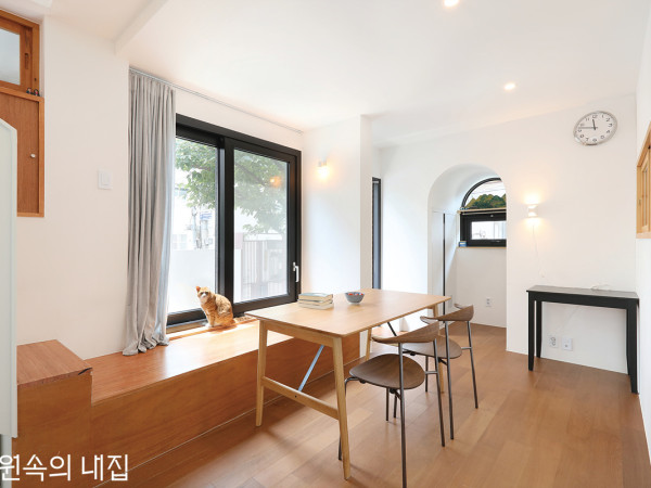 가을이면 동네 사람들이 나무 아래에 모여 감을 주거니 받거니 하던 집. 이제 새로운 주인을 만나 작은 서점과 함께 골목을 밝힌다.1 - 기존 건물에 썼던 것과 같은 사이즈의 비슷한 벽돌로 대체한 1층과 토끼 귀 모양 지붕이 있는 2층이 새로이 쌓여 오래된 동네에 활기를 불어넣는다.2 - 집 안에서도 이어지는 아치. 1층은 세탁실과 주방, 평상이 있는 거실 등 공용 공간 위주로 꾸몄다.결혼 후 10년 동안 10번의 이사를 거친 부부. 남편의 전근으로 지방에서 몇 년 살다 온 사이 집값은 천정부지로 올라 있었다. 마지막으로 살았던 옥탑이 있는 작은 집에서의 기억이 좋았던 부부는 아파트가 아닌, 예산이 감당할 수 있는 구옥을 찾아보기로 했다. 그렇게 발견한 쌍문동의 작은 집. 도봉산 자락에 경사가 거의 없으며 동네 사람들의 느슨한 교류가 있는, 얼마 남지 않은 서울의 정겨운 동네처럼 보였다.HOUSE PLAN대지위치 ▶ 서울시 도봉구 대지면적 ▶ 64.84㎡(19.61평) │ 건물규모 ▶ 지상 2층 건축면적 ▶ 35.32㎡(10.68평) │ 연면적 ▶ 55.42㎡(16.76평) 건폐율 ▶ 54.47%│ 용적률 ▶ 85.47%│ 최고높이 ▶ 8.44m 구조 ▶ 기초 - 철근콘크리트 매트기초 / 지상 - 철골조(1층 벽), 경골목구조 2×6 구조목(2층 벽) / 지붕 – 경골목구조 2×10 구조목 단열재 ▶ THK140, THK235 그라스울 단열재, THK50 가등급 압출법 단열재 외부마감재 ▶ 벽 – 75×150 각타일, 스터코, 적벽돌 타일, 기존 벽돌 / 지붕 – 컬러강판 담장재 ▶ 시멘트블록│ 창호재 ▶ 대동엘로이 시스템창호│ 에너지원 ▶ 도시가스 시공 ▶ 제타디자인 어쏘시어트 설계 ▶ 비유에스아키텍츠 건축사사무소 02-725-9900 http://bus-architecture.com총공사비 ▶ 1억5천만원(설계비 제외, 구옥 2억원)INTERIOR SOURCE내부마감재 ▶ 신명원목마루 │ 욕실 및 주방 타일 ▶ 티앤피타일 수전 등 욕실기기 ▶ 아메리칸스탠다드 │ 주방 가구 ▶ 제작, 이케아 조명 ▶ 을지로 조명나라, 루이스폴센 │ 붙박이장 ▶ 이케아3 - 10평 남짓한 건축면적의 집이지만, 리모델링이라 기존 집에서 쓰던 작은 마당도 유지할 수 있었다. 오묘한 빛깔의 분홍색 대문과 담장은 벽돌과 톤을 맞춰 건축가 직접 디자인했다.부부는 집을 허물고 새로 짓는 대신 원래 있던 부분을 살리고 공간을 조금 덧붙이는 증축을 택했다. 주변 곳곳 공동주택으로 개발된 필로티 건물이 조금씩 들어서는 상황 속에서 그리 넓지도 않고, ‘쓸모가 보이지 않는’ 건물을 살리면서 작업해 줄 건축가는 선뜻 나타나지 않았다. 이들의 쉽지 않은 결정에 젊은 건축가 비유에스 아키텍츠가 동행했다. 신축을 역으로 제안하지 않고 “이 집이 낙후되어 가는 주거지역의 새로운 대안이 되길 기대”하는 마음이 부부는 참 고마웠다고.BEFORE단층이었던 기존 주택. 측량 후 마당의 절반이 건축선을 침범하고 있어 도로로 공간을 내어주고 감나무 뿌리 일부를 정리해야 했다.SECTIONPLAN①서점 ②거실 ③주방 ④화장실 ⑤침실 ⑥드레스룸 ⑦테라스4 - 건축주가 운영하는 1.5인용 작은 동네 서점 ‘쓸모의 발견’. 기존 옥외 창고를 고쳐 만든 곳으로, 건축주가 좋아하는 책들로 직접 큐레이션 했다.5 - 집 안에는 건축주 부부가 보유한 더욱 많고 다양한 책들이 꽂혀 있다. 계단실 한쪽에 사다리를 달아 활용도를 높였지만, 실제 덜 보는 책들은 위쪽에 쌓았다.세 칸의 방이 나란히 배치된 단층집이었던 구옥. 63년에 지어진 집인데다 이웃집과의 경계가 명확하지 않은 터라 내부 구성의 전면적인 재조정이 필요했다. 실내의 조적벽을 철거하고, 모든 면으로 통풍을 할 수 있게 후면 공간을 작은 중정으로 만들었다. 1층은 주방과 거실을 두고, 경량의 목구조로 수직 증축한 2층에는 사적인 공간을 배치했다. 원래 옥외 창고로 쓰이던 작은 공간은 건축법이 허락하는 한도 내에서 수평 증축해 1.5인용 작은 서점도 만들었다.6 - 밖에서 봤을 때 아치형 지붕은 실내 채광의 1등 공신이다. 안쪽에 아치형의 구조물을 통해 반사된 간접광이 자연스럽게 퍼진다.사실 부부는 집을 설계하기 전 이 집에서 일부러 몇 개월 살아봤다고 고백한다. 해는 어디에서 떠서 어떻게 지나가는지, 환기가 잘 되는 방법은 무엇인지, 고양이 4마리와 함께 살아야 하는데 어떤 점을 신경 써야 하는지 등을 직접 체험하면서 원하는 것들을 정리해 나갔다. 건축가 역시 고치기 전 건축주가 살고 있는 집에 찾아와 집이 가진 조건을 파악하고 현장과 생활에 대한 이해의 폭을 넓혔다.7 - 거실 평상은 훌륭한 독서 공간이 되어 주는 동시에 2층으로 올라가는 계단참 역할도 겸한다. 큰 창으로 동네가 보이고 따뜻해 고양이들의 차지가 될 때가 많다.POINT 1 - 세월의 흔적이 보이는 벽돌정면에서 보면 언뜻 새집처럼 보이지만, 측면의 덧댄 벽돌이 지난 세월을 짐작케 한다. POINT 2 - 감나무를 배려한 2층 베란다감나무에 주는 영향을 최소화하기 위해 2층 베란다 일부를 나무 윗동 반경만큼 덜어냈다. POINT 3 - 이웃 집과 면한 주방 외부 공간뒷집으로부터의 프라이버시를 유지한 채 공기는 통하게 하고 불투명한 유리로 막았다.8 - 고양이 털 때문에 좁더라도 거실과의 분리가 필요했던 주방. 작은 창을 내어 거실과의 소통을 꾀했