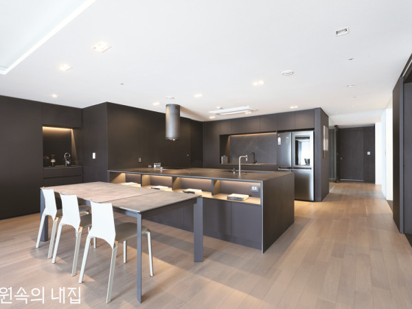 블랙의 모던한 공간이되, 따스함을 놓치지 않으려 했다. 절제된 인테리어 속에서 일상도 그러하길 바라는 가족의 꿈이 실현된 집.거실은 다이닝 공간보다는 조금 밝은 느낌으로 구성했다. 온몸을 감싸주는 높은 팔걸이와 등받이가 특징인 패브릭 4인 소파를 옅은 그레이 컬러로 배치하고, 거실 창가에 1인 소파로 존재감을 주는 암체어 세트를 두어 감각을 더했다. 신혼집 이후, 가족의 두 번째 집은 고층의 주상복합으로 결정되었다. 모노톤의 컬러, 군더더기 없는 심플함을 원한 부부에게 기존 집은 덧창과 많은 벽체, 도드라진 나무 색으로 리모델링을 피할 수 없었다. 여유 있게 설계 기간을 잡은 터라, 아이디어를 모을 시간은 많았다. 비슷한 면적의 다양한 포트폴리오를 수집하고, 이 중 부부와 취향이 닮은 디자이너를 만나기까지 두 달이 걸렸다.이후 본격적인 고민이 시작됐다. 부부가 마음껏 고르고 채운 신혼집과 달리, 이젠 7살이 된 딸아이의 감수성을 신경 써야 했다. 전체적인 콘셉트를 해치지 않게 공용 공간과 아이 공간의 컬러감을 맞추고, 바닥도 차가운 석재 마감 대신 원목마루를 택했다.리모델링을 맡은 817디자인스페이스의 임규범 대표는 “최소한의 컬러와 마감재로 미니멀한 계획을 잡고, 가벽을 철거하는 등 공간 선을 새로 잡아 개방감을 한껏 살렸다”며 “모던한 공간이되 차갑게 느껴지지 않도록 디자인하는 게 관건이었다”고 설명했다.현관은 좌우 수납실과 팬트리가 함께 한다. 절제된 컬러감으로 입구부터 집의 특징을 여실히 보여주고 있다. 너른 폭의 아일랜드 가구 아래로 오픈 수납 공간을 마련하고, 간접조명을 인입해 따스한 느낌을 더했다. 좌우로 수납 시스템이 설치된 현관 홀은 이 집의 특징을 집약적으로 보여준다. 매트한 블랙과 화이트를 대비시키고, 전실에는 모노톤의 유화 액자로 포인트를 줬다. 한 걸음 더 들어서면 주방과 거실의 오픈 공간을 만난다. 세 식구지만, 손님 초대가 잦아 다이닝 공간에 면적의 꽤 큰 부분을 할애했다. 주방 가구는 매트한 블랙 컬러의 대면형 아일랜드로, 일반 가정에서는 쉽게 볼 수 없는 압도적인 폭을 자랑한다. 세라믹 상판에 특수 코팅된 도어, 입체적인 내부 수납 기능을 갖춘 제작 가구다.주방의 이미지는 거실 벽면으로 이어져, 커피머신 장과 김치냉장고 수납장까지 일체화시켰다. 각 장 상부에 설치한 LED 간접조명은 블랙의 고급스러움을 더욱 돋보이게 한다.POINTPOINT 1 - 가전 가리기톤이 달라지는 김치냉장고는 도어 안으로 숨겼다. 사용빈도가 낮아 가능했다. POINT 2 - 수납 편의성 주방가구의 도어까지 활용한 대용량 수납툴. 부드럽게 열고 닫히는 하드웨어를 적용했다.부부의 취향을 극명하게 드러내는 공간은 안방이다. 기존 벽체를 안쪽으로 들여 크기는 줄었지만, 침대 옆으로 가벽을 세워 파우더룸과 욕실, 드레스룸의 구분을 명확하게 잡았다. 가벽에는 개구부를 내어 채광은 물론 소통의 역할로 삼고, 흑경을 달아 공간의 밸런스를 맞췄다. ‘ㄱ’자로 이어지는 드레스룸은 돌출 부위가 전혀 없는 미니멀한 디자인으로 도어 수납장을 채웠다.불필요하게 컸던 안방 욕실은 면적을 나누어 거실에서 출입할 수 있는 게스트 욕실을 추가했다. 개인 공간의 욕실은 베이지 그레이 컬러의 대형 타일로 통일하고, 게스트 욕실은 좌변기까지 블랙으로 택해 유니크한 매력을 보여준다. 각 실 출입구는 도장된 미닫이문으로 제작해 일체화된 느낌을 갖는다.안방에는 가벽을 세워 세면 카운터를 만들되, 개구부를 내어 밝은 빛을 들였다.PLAN기존 벽 대신 유리를 세워 마련한 가족실 겸 서재. 이 집의 바닥 전체는 노바마루의 원목라인 소프트그레이로 택해 블랙에 내추럴함을 더했다. ©진성기아일랜드 폭을 키워 파티 등 용도에 맞춰 다양하게 활용할 수 있게 했다. 맞은편으로 게스트 욕실과 안방이 자리한다. INTERIOR SOURCE벽 ▶ 노루페인트 친환경도장, 개나리 실크벽지|바닥 ▶ 노바 원목마루 소프트그레이욕실 및 주방 ▶ 포세린 수입타일(니즈타일)|욕실 기기 ▶ 아메리칸스탠다드수전 ▶ 크레샬, 슈티에|싱크볼 ▶ 백조씽크 콰이어트, 엘레시후드 ▶ 엘리카|조명 ▶ LED 매입|가구 ▶ 세라 믹상판(세라미코), HPL도어(메라톤)소파 및 1인 체어 ▶ 알로소서재책상 ▶ 막시리빙|거실 협탁 ▶ 에잇컬러스디자인·설계 ▶ 817디자인스페이스 임규범, 고효정 http://817designspace.co.kr시공 ▶ 백병기, 오기창화분 ▶ 데팡스|식물스타일링 ▶ 김원희 올블랙으로 연출한 게스트 욕실LIVING ROOMItem 1 - 알로소 4인 소파 사티군더더기 없는 깔끔한 디자인과 아늑한 쿠션감이 완벽한 밸런스를 이루는 프리미엄 소파 브랜드 알로소의 ‘사티’는 편안함과 스타일을 동시에 갖춘 제품. 넉넉한 팔걸이와 등받이가 사용자를 포근하게 감싸 안아주는 형상에 균형 잡힌 비율로 어떤 인테리어와도 조화롭게 어우러진다.Item 2 - 알로소 암체어 뚜따 + 오토만창가에 배치된 프리미엄 암체어는 알레산드로 멘디니가 디자인한 ‘뚜따’와 ‘오토만’으로 우아한 조형미가 시선을 잡는다. 뚜따는 사람이 앉았을 때 일어나는 신체 변화에 알맞도록 등 좌판의 기울기를 고안해 낸