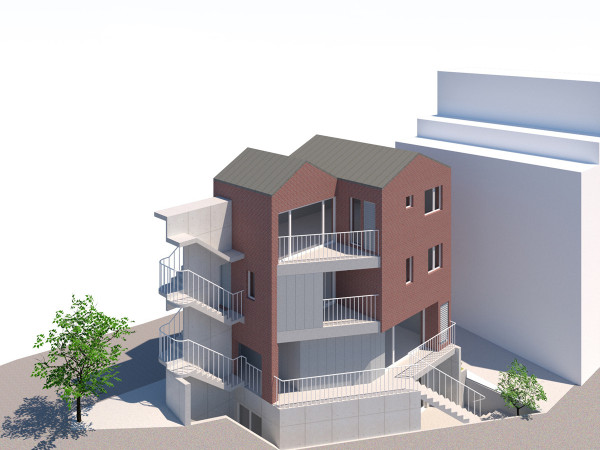 대지 여건을 고려한 배치부터 공간의 풍성함을 결정짓는 단면, 세대수와 가족의 취향을 반영하는 평면 계획 단계에서 건축가의 다양한 아이디어를 엿보는 기회를 가져본다.SITE대지는 서울시 도봉구 내 오래된 주거지역으로 북한산과 우이천이 멀지 않다. 구옥, 빌라, 다가구주택 그리고 아파트까지 다양한 주거 형태가 모여 있는 마을이다. 대지의 모양은 삼각형이며 메인도로에서는 1층, 반대편 아파트 쪽에서 보면 2층처럼 보이는 경사지이다. 삼각형이라는 특수한 조건이지만, 6m 도로가 북측에 길게 면해 있어 일조권 사선에 자유롭고 주차가 용이하다.FAMILY건축주는 건축가 남편과 화가 아내로 구성된 2인 가족이다. 기존의 구옥을 철거하고 그 자리에 신축을 통해 집을 짓고자 했다. 여기에 남편의 사무실과 아내의 독립적인 작업을 위한 스튜디오를 각각 별도로 둬 스튜디오 임대료 지출을 절약하고, 주거와 직장이 한 건물에 위치한 직주일체 시스템을 구축했다. 그리고 한 세대 임대를 통한 추가적인 수입도 기대할 수 있다.HOUSE PLAN대지위치 서울시 도봉구 | 지역지구 도시지역, 제2종 일반주거지역대지면적 122m2(36.90평) | 건물규모 지하 1층, 지상 3층건물용도 단독주택, 근린생활시설(스튜디오, 사무소) 건축면적 65.25m2(19.74평) | 연면적 141.90m2(42.92평) 건폐율 53.57%(법정 60%) | 용적률 116.31%(법정 200%) 주차대수 | 2대 구조 철근콘크리트 | 외부마감 적벽돌, 금속패널 3D이미지 | w.park atelierDIAGRAMELEVATION & CONCEPT1. 효율적으로 활용하는 삼각형 대지삼면이 도로와 주택에 둘러싸인 대지. 직각 부분인 남동쪽에 건물 매스를, 북측 모서리에 외부 계단과 주차장을 배치했다. 여기에 레벨이 낮은 남서쪽으로 썬큰과 테라스를 둬 채광과 통풍, 그리고 야외활동 중 프라이버시를 확보했다.2. 쾌적한 일상을 위한 외부 공간삼각형은 실내 공간으로 쓰기는 어렵지만, 외부일 때는 매력적인 공간이 될 수 있다. 삼각형 대지에서 사각형 공간을 구획할 때마다 생기는 자투리 공간을 발코니나 계단 등으로 활용, 안팎을 자연스레 잇는 쾌적한 일상을 도모했다.3. 합리적인 공사를 위한 심플한 형태작은 면적으로 4개 층을 만들어야 했다. 비용과 기간 측면에서 합리적인 공사를 위해 심플한 형태로 계획했다. 그 형태 속에서 공간을 잘게 나누기보다 큰 덩어리로 만들어 여러 가지 라이프스타일에 따른 변주가 가능하도록 하였다.SECTIONPLAN①스튜디오 ②서재 ③사무실 ④화장실 ⑤현관 ⑥주방 ⑦다이닝 ⑧거실 ⑨방 ⑩발코니 ⑪보일러실 ⑫주차장 ⑬썬큰마당 ⑭테라스현재 모델에서 외피를 노출 콘크리트로 적용해본 3D 모델 / 용적률을 우선하는 조건부터 순수 주거 조건까지 다양한 변수에 맞춘 대안이 고려되었다.건축가 윤민환 _ studio s.a.m경기대학교 건축공학과 졸업 후 원오원건축에서 실무를 하였고, 와세다대학 건축학 석사 졸업, 박사과정을 수료했다. 2017년 건축사사무소 하이를 설립하고, 2019년 건축디자인사무소 studio s.a.m으로 활동을 이어가고 있다. 주요 작업으로는 개화동 일곱집, 대조동 mini multi house, 쌍문동주택 리노베이션이 있으며, 2009년 제 28회 일본 SD review에 선정, 2011년 아름지기재단 주최 헤리티지 투모로우 프로젝트2에서 1위로 선정되었다. 010-2847-7107 │ www.instagram.com/studio.s.a.m구성 _ 신기영ⓒ 월간 전원속의 내집 / www.uujj.co.kr