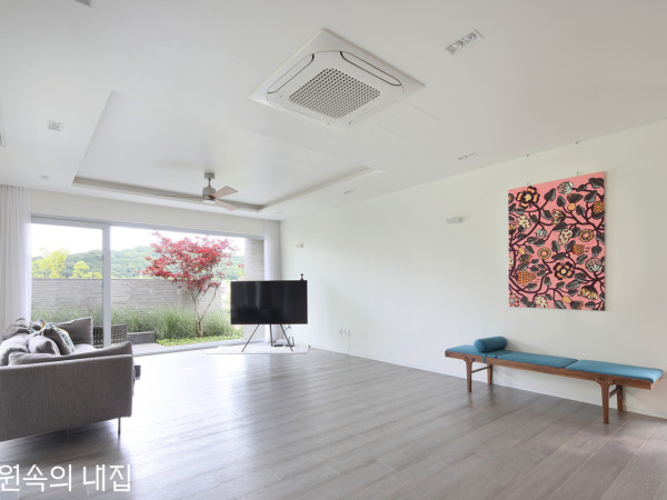 아름다운 주변 풍광을 담아낸 새하얀 단층집. 그 이름처럼 검소한 겉모습 속에 옥을 품은, 부부의 새 보금자리다.회옥재의 전경. 하얀색의 매스와 투명한 선룸의 대비가 집의 특징을 잘 설명해준다. 부엌과 선룸의 연결통로. 선룸을 포함해, 크고 작은 창을 여러 군데 내어 외부 풍경을 한껏 끌어들이고자 했다. 부부는 선대로부터 물려받은 땅에 은퇴 후 안온하게 지낼 수 있는 집을 짓고자 했다. 두 개의 방, 부엌 및 다용도실, 화장실과 욕실, 그리고 주변을 조망하기 좋은 선룸을 포함하여 30평 정도의 주택을 목표로 설계를 진행하였다. 부부가 큰 집을 짓지 않겠다고 한 데는 두 가지 이유가 있었다. 첫째는 예산에 관한 것이었고, 둘째는 주변 풍경 자체가 충분히 아름다우니 집은 굳이 크고 화려할 필요가 없다는 것이었다. 사시사철 계절감을 드러내는 수목들, 집 앞을 흐르는 맑은 개울, 항상 볕이 잘 드는 높은 지대, 밤이면 달과 별로 가득 메워지는 맑은 하늘과 청량한 밤공기. 대지를 둘러싼 아름다운 풍경을 집으로 끌어들이면 집 자체는 그리 크지 않아도 될 것 같다는 건축주 내외의 생각에 공감했고 크지 않지만, 충분히 큰 집을 만들고자 했다.SECTION①현관 ②선룸 ③부엌 ④서실 ⑤침실 ⑥드레스룸 ⑦다용도실 ⑧세면실 ⑨화장실 ⑩욕실 ⑪보일러실 선룸을 중심으로, 서측에 남편의 공간인 욕실과 서실, 동측은 아내의 공간인 부엌과 안방을 두었다. 이 구분은 건물의 외관에 고스란히 드러난다. 집은 산골짜기에 위치하고 있지만, 대지의 단이 높아 사시사철 항상 해가 잘 든다. 건물 앞쪽으로 건축주가 직접 가꾼 배나무밭이 보인다. 각각의 공간들은 생활이 불편하지 않을 선에서 최소한의 규모로 계획되었다. 대신 크고 작은 창을 다양한 위치에 내어 밖으로 충분히 열려있는 구조를 만들고, 집 중심에 선룸을 배치하여 하늘을 포함한 주변 풍광을 한껏 담아낼 수 있도록 했다.외국의 주택 사례에서 간혹 ‘Man Cave’라는 공간을 볼 수 있다. 단어 그대로 해석하면 남자의 동굴인데, 이는 남편이 취미생활을 위한 시간을 갖거나 휴식을 보내기 위한 공간이다. 건축주에게 설계 과정에서 가장 즐거운 일을 하나 꼽으라고 한다면, Man Cave와 같은 ‘나만의 공간’을 계획하는 일이라 할 수 있을 것이다. 나의 이상과 자아를 공간으로 구체화하는 일, 그리고 그 안에서 보낼 시간을 상상하는 일만큼 즐거운 일이 있을까. 건축주 내외에게는 각각 ‘욕실’과 ‘부엌’이 이에 해당했다. 남편은 외부 풍경을 한껏 즐기며 반신욕 할 수 있는 욕실을 갖고 싶어 했고, 아내는 모든 물건을 자신의 규칙대로 깔끔히 정리할 수 있는 부엌을 계획하기 위해 공을 들였다. 집의 중심인 선룸을 기점으로, 서측에는 욕실과 남편의 서실(書室)이, 동측에는 부엌과 아내의 취미 공간이 자연스레 구분되어 배치되었고, 이는 건물의 외관에 고스란히 드러나게 되었다.가평의 파란 하늘을 담은 현관 바닥. 현관 앞쪽의 낮은 턱은 현관을 보다 안정감 있게 해주며, 잠시 짐을 얹어 두기에도 편하다. 이 집의 중심공간인 선룸 어둠이 깔린 주택. 집 앞을 흐르는 개울이 건물을 더욱 돋보이게 한다. HOUSE PLAN대지위치 ▶ 경기도 가평군 대지면적 ▶ 1,106㎡(334.57평) | 건물규모 ▶ 지상 1층 건축면적 ▶ 130.92㎡(39.60평) | 연면적 ▶ 130.92㎡(39.60평) : 주택 – 104.12m2 / 농막 – 18.00㎡ / 창고 – 8.80㎡ 건폐율 ▶ 11.84% | 용적률 ▶ 11.61% 주차대수 ▶ 1대 | 최고높이 ▶ 4.4m 구조 ▶ 기초 – 철근콘크리트 매트기초 / 지상 – 철근콘크리트 라멘조 단열재 ▶ 압출법보온판 1종3호, 경질우레탄폼보온판 1종3호, EPS단열재 1종3호 외부마감재 ▶ 벽 – STO 외단열시스템 등 / 지붕 – 선이인터내셔널 알루징크 창호재 ▶ 필로브 AL창호 160mm 양면로이 투명삼중(에너지등급 1등급) / 선룸 – 이건창호 에너지원 ▶ 난방열원 – 히팅골드바 전기패널 / 온수 – 저장식 온수기 조경석 ▶ 윤현상재 조경용 타일(30T) 시공 ▶ 더 이레츠 종합건설 설계·조경 ▶ 폼아키텍츠 총공사비 ▶ 3억원(설계비 및 조경 공사비 제외) 하늘에서 바라다본 외관. 건물의 특성이 명확하게 나타난다. PLAN①현관 ②선룸 ③부엌 ④서실 ⑤침실 ⑥드레스룸 ⑦다용도실 ⑧세면실 ⑨화장실 ⑩욕실 ⑪보일러실 아내의 공간인 안방과 취미실. 좌식 생활에 맞추어 가구는 거의 들이지 않았다. 목욕을 하면서 외부 풍경을 조망하거나, 외부로 드나들 수 있는 공간을 원했던 남편을 위한 공간인 욕실. 살짝 보이는 천장은 히노끼 각재를 사용하여 특유의 상쾌한 향이 난다. 건물의 내외장재에 관한 선택은 기능과 가격, 건축주의 취향 등을 종합적으로 고려해 설계자와 건축주가 함께 의논하여 선택한다. 이후 설계자는 선택된 각각의 재료가 만나는 방법을 고민하는데, 흔히들 이 단계를 ‘디테일을 설계한다’고 표현한다. 이번 설계에서 디테일에 대한 고민은 대부분 간결함을 만드는 일에 관한 것이었다. 건축주도 설계자도 집이 안팎으로 복잡해 보이지 않았으면 했다.먼저 지붕과 외벽 마감재는 유사한 색상을 선택하여 외형이 간결해 보인다. 지붕 후레싱(지붕 끝단과 벽면에 만나는 부분)도 최대한 얇게 만
