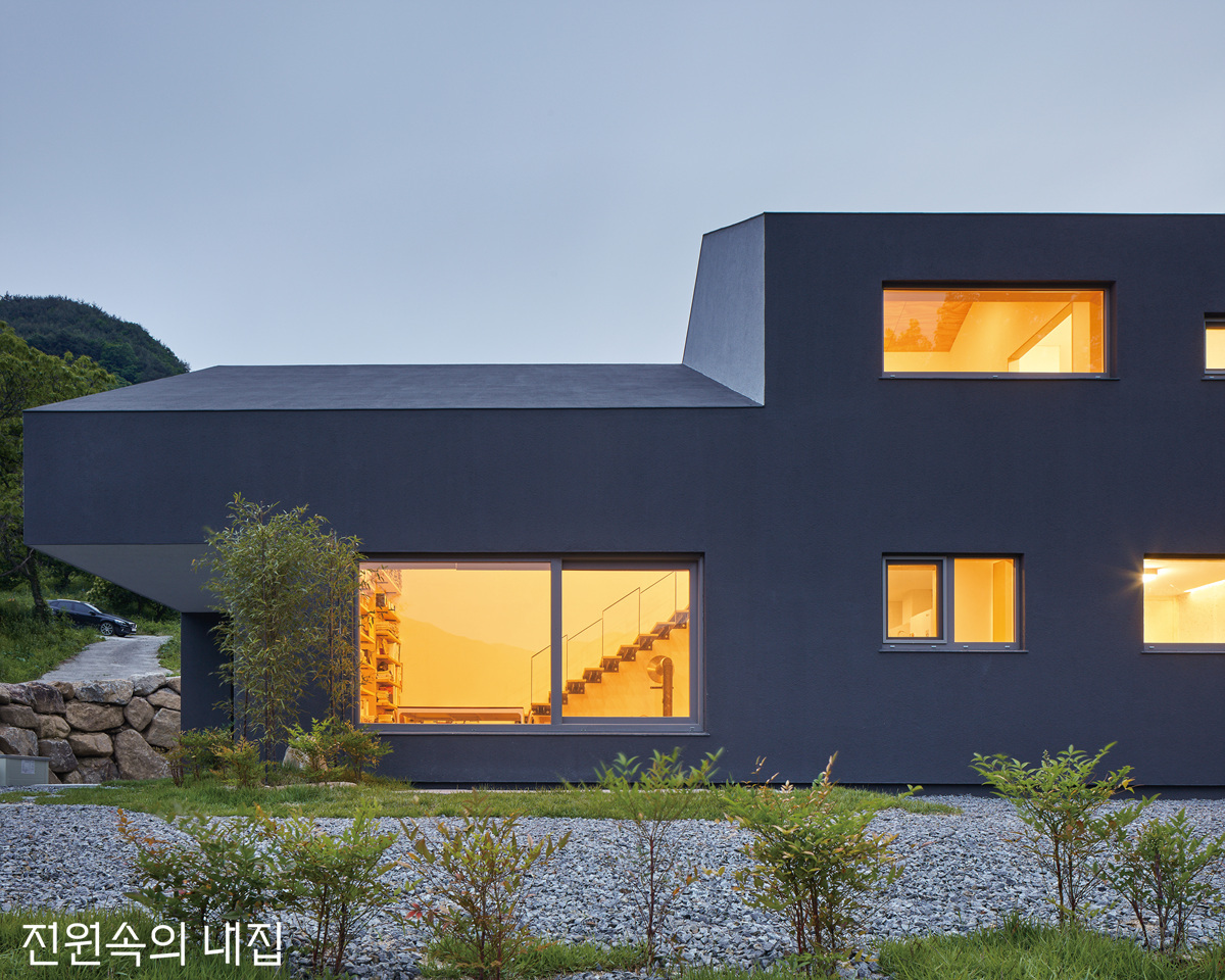 전체적인 매스 형태는 지붕에 단 차이를 두어 거실이 높은 층고를 유지하도록 했다. 이로써 아이들의 공부방 역할을 겸하게 될 거실 공간을 풍부하게 할 수 있었고, 주변 산세의 선형도 거스르지 않을 수 있었다. 평면은 1층에 거실, 주방, 구들방(부부 침실), 화장실, 다용도실을, 2층에는 게스트룸 겸 좌식 공부방, 서재, 드레스룸, 화장실을 계획했다.