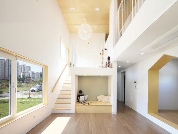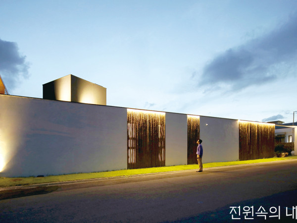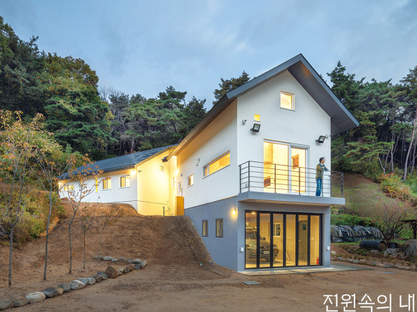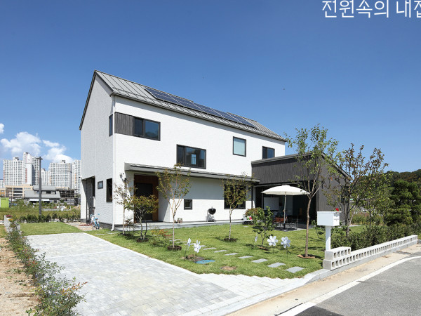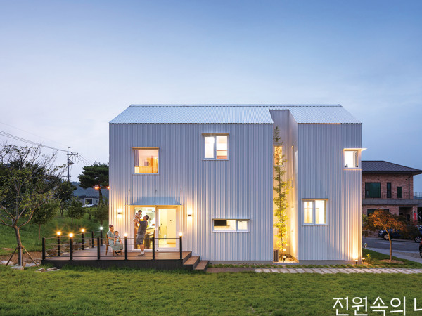 단순한 외관의 하얀 집. 집의 진가는 가까이 다가갔을 때 온전히 드러난다. 대지 위 꼭 닮은 두 채의 건물 속에서 쌍둥이 남매의 웃음소리가 오늘도 맑게 퍼져나간다.전라북도 완주군 구이면에 자리 잡은 모악호수마을에 은은한 회백색 빛을 품은 단정한 집이 지어졌다. 직장의 이전으로 서울에서 전주로 내려온 젊은 부부는 평소 꿈꾸던 전원생활을 실현하기 위해 17년간 유럽에서 활동한 건축가에게 평범하지만 흔치 않은 집을 요청하였다.건축가는 건축주와 처음 대지를 방문했을 때 주택 단지 남서쪽 끝자락에 자리하고 지대가 높은 곳임을 확인한 후, 주택 2층에서 서측 모악산과 동측 구이저수지를 바라보는 모습을 그렸다.SECTION ③손님방 ④거실 ⑤다이닝룸 ⑧보일러실 ⑪주차장 ⑬드레스룸 ⑭아이 방 ⑰다락 정남향 정원으로 이어지는 주택 전면과 데크 / 이웃과 동측 소로로부터의 프라이버시 확보를 고려해 조경을 배치했다. 주거동과 이의 1/3로 축소된 주차동은 각각 알루미늄 골판, 폴리카보네이트 골판 마감으로 형태와 질감의 일체감을 주었다.건축주 또한 40평대의 소규모 단독주택이지만 단층보다 복층에 대한 로망이 있던 터였다. 지붕이 있는 주차장을 위해 건물은 주거동과 주차동으로 나뉘었고, 건물 배치는 순리대로 이루어졌다. 대지 북측에 접한 막다른 진입도로로 주차동에 들어서면 주거동과의 좁은 사이공간, ‘골목’이 나타난다. 주거동 전면에는 남측과 서측의 경관녹지까지 연속된 정남향의 푸른 정원이 펼쳐진다. 정남향으로 면이 긴 직사각형 모양의 주거동은 넓은 정원을 통해 얻은 채광을 최대로 끌어들이고 있다.HOUSE PLAN대지위치 ▶ 전라북도 완주군대지면적 ▶ 571.70㎡(172.94평) | 건물규모 ▶ 지상 2층 + 다락건축면적 ▶ 112.03㎡(37.75평) | 연면적 ▶ 157.43㎡(47.62평)건폐율 ▶ 19.60% | 용적률 ▶ 27.53%주차대수 ▶ 2대 | 최고높이 ▶ 8.44m구조 ▶ 기초 – 철근콘크리트 매트기초 / 지상 – 일본 중목구조(프리컷 철물구조)단열재 ▶ 외벽 – 에코필 105mm / 지붕 – 수성연질폼 300mm 발포외부마감재 ▶ 외벽, 지붕 – 알루미늄 골판(회백색 분체도장)창호재 ▶ 삼익 Inoutic 43mm PVC 로이삼중유리(에너지등급 1등급) | 에너지원 ▶ LPG기계·전기·설비·통신 ▶ ㈜태인엠이씨총공사비 ▶ 4억5천만원(설계비, 인테리어, 조경 제외)시공 ▶ 디자인 아프리카설계 ▶ ㈜후소 파트너스(HUSO+Partners)외부 조명으로 집의 선이 더욱 뚜렷하게 살아나는 모악호수 쌍둥이집자연 친화적인 주택을 희망한 건축주의 요구에 따라 내진설계가 적용된 일본 중목(프리컷 공법)을 구조재로 하고, 최근 주택 시공에 주로 사용되는 컬러강판 지붕과 스터코 외벽을 피하고자 알루미늄 골판을 외장재로 선택하였다.목조의 친근함과 골판의 볼륨 있는 질서로 단순하면서도 입체감 있는, 모던하면서도 클래식한 정서를 느끼게 하고 싶었다. 심플함과 깔끔함을 극대화하기 위해 지붕과 외벽을 회백색으로 도장 처리된 알루미늄 골판으로 일체화하고 재료의 겹침선이 없도록 최대 길이 8.2m의 알루미늄 골판을 원피스(one-piece)로 제작·시공했다.1층 거실에서 즐기는 대나무 숲 다락방과 아이방에는 여닫이 나무 창문이 있어 다이닝룸을 중심으로 소통할 수 있다. 주차장 또한 목구조이면서 야간에 불을 켰을 때 주차동 전체가 하나의 조명기구처럼 보이도록 구조체가 실루엣으로 드러나는 반투명 폴리카보네이트를 외장재로 사용하였고 주거동과 같은 결이 되게끔 폴리카보네이트 골판을 선택했다. 북측 현관을 통해 실내로 들어서서 성문 같은 대형 목재 중문을 열면 자연을 한층 끌어들인 대나무 숲과 마주하게 된다.이 대나무 숲은 모든 실과 소통하게 계획되어 집 안 어디에서든 바라볼 수 있다. 백색 친환경페인트로 도장된 실내 벽, 자작나무 천장, 그리고 노출된 중목기둥들은 서로 조화를 이루며 그 자체로 인테리어 효과를 가진다. 내부 마감이 모두 자작나무 합판으로 된 아이 방은 특별히 지붕 아래 또 다른 박공지붕 모양의 천장을 만들어 공간적 아늑함을 주었다. 각각의 실마다 바닥 레벨 차이를 두거나 천장고의 변화를 통해 공간적 다채로움을 더했다.노출된 중목구조의 원목 기둥과 또 하나의 박공지붕 천장으로 다채로운 2층 공간이 완성되었다. 평상 느낌의 툇마루가 있는 손님방. 바닥을 열어 평상 밑 공간에 수납이 가능하다. / 2층 가족실의 수납 의자에 앉아 창밖 모악산의 풍경을 바라보는 모녀 이 집은 현관 외에는 신발 신을 일이 없다는 것이 특징인데, 특히 화장실이 있는 욕실은 단차 없이 건식 바닥으로 시공되어 거실처럼 맨발 출입이 가능하고, 바닥 난방이 들어와 또 하나의 확장된 거실이 된다. 또한 방 창문마다 커튼 대신 미닫이 덧문을 달아 채광을 조절할 수 있어 관리가 용이하다.INTERIOR SOURCE내부마감재 ▶ 벽 – 강남제비스코 프리미엄 친환경 도장, 자작 합판 / 천장 – 자작 합판 / 바닥 – LG하우시스 강마루, 에폭시 도장, 포세린 타일욕실 및 주방 타일 ▶ 국제 포세린 타일 | 수전 등 욕실기기 ▶ 바인도기주방 가구 ▶ 한샘 + 현장 제작 | 조명 ▶ 태광조명붙박이장 및 가구 ▶ 현장 제작 | 계단재·난간 