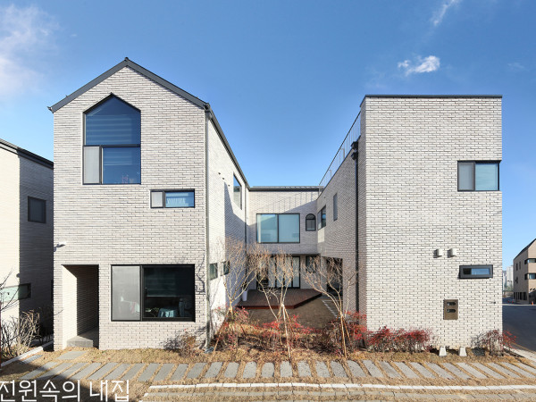 김포 한강신도시 끝자락 낮은 언덕에 자리 잡은 집 한 채. 꿈을 쌓아 올려 완성한 벽돌집은 그저 바라보는 것만으로도 가족을 행복하게 한다.©류인근주택 생활은 오성수 씨의 오랜 꿈이었다. 어릴 적 뛰놀던 좁은 골목길, 이웃들과 어울리던 작은 마당. 언젠가 두 아이에게도 이런 소소한 일상의 즐거움을 누리게 해주고 싶었다. 때문에 신혼 초 아담한 아파트를 제외하곤 집을 사는 것조차 차일피일해온 그였다.SECTION 1. 주차장 / 2. 작업실 / 3. 작업실 뒷마당 / 4. 안마당 / 5. 포치 / 6. 현관 / 7. 거실 / 8. 주방 및 식당 / 9. 화장실 / 10. 서재 / 11. 주방 뒷마당 / 12. 계단실 / 13. 침실 / 14. 드레스룸 / 15. 욕실 / 16. 가족실 / 17. 테라스 / 18. 잔디마당 / 19. 옥상 테라스 / 20. 다락 주택의 정면. 주차장 쪽 가늘게 보이는 디자인 기둥은 매스가 떠 있는 느낌을 강조해준다 잔디마당에서 바라본 건물. 작은 신전과 같은 분위기가 신비롭다. 늘 바랐지만, 집짓기의 시작은 생각만큼 쉽지 않았다. 네 식구에게 적당한 땅을 찾는 것도, 아이들의 통학과 교육 문제 등으로 반대하는 아내를 설득하는 것도 그가 떠안은 숙제였다. 그러다 한참 만에 한 대지와 마주했다. 신도시가 조성되면서 아내가 걱정하던 부분까지 말끔히 해결해준 고마운 곳이었다. 이후 지인의 소개를 받아 건축가를 만났고 지난해 11월, 그토록 고대하던 내 집을 완성했다.HOUSE PLAN대지위치 ▶ 경기도 김포시 │ 대지면적 ▶ 446㎡(134.91평)건물규모 ▶ 지하 1층, 지상 2층 + 다락건축면적 ▶ 88.65㎡(26.81평) │ 연면적 ▶ 200.36㎡(60.61평)건폐율 ▶ 19.88% │ 용적률 ▶ 36.57%주차대수 ▶ 2대 │ 최고높이 ▶ 9.39m구조 ▶ 기초 – 철근콘크리트 매트기초 / 지상 – 철근콘크리트 단열재 ▶ 비드법보온판 2종1호외부마감재 ▶ 외벽 저층부 – 콘크리트벽돌(두라스택 S390 베이직그레이) / 외벽 상층부, 지붕 – 점토벽돌(삼한C1 고토미S)담장재 ▶ 노출콘크리트, 스틸파이프 │ 창호재 ▶ 이건 알루미늄창호 (투명로이 3중유리)전기·기계·설비 ▶ 정연엔지니어링 │ 토목 ▶ 한터이엔씨구조설계(내진) ▶ 용우엔지니어링 │ 시공 ▶ 건축주(오성수) + 티에스건설(유원상)설계·조경 ▶ 디자인밴드요앞 건축사사무소대문을 열고 들어가면 계단을 올라 집과 안마당으로 이어진다. ©류인근 서로 다른 레벨과 바닥 마감을 가진 잔디마당과 안마당“지금은 4층까지로 변경되었는데, 설계 당시 2층 이하 층수 및 건폐율 제한으로 원했던 바를 모두 담아내기엔 한계가 있었어요. 그래서 밖으로는 그리 화려하지 않아도 되니 내실 있는 집을 만들어 달라 부탁드렸죠.”설계는 디자인밴드요앞 건축사사무소에서 맡았다. 신현보 소장은 “가족이 요구사항과 제약적인 부분을 신중히 검토하고 적극적인 외부 공간을 계획함으로써 법규로 인한 한계점을 극복하고자 했다”고 설명했다.노출 천장으로 단순하게 마감한 거실. 큰 창을 통해 바깥의 마당과 하나의 공간이 된다. 상부장 없이 깔끔한 주방 SPACE POINT20% 내부, 80% 외부 공간수도권 외곽 민간개발 교외 주택지는 주로 임야를 개발해 조성된다. 원활한 분양과 적절한 가격 형성을 위해 보통 100~200평 사이 규모로 분할한다. 이런 필지들은 법적으로 보전관리지역이나 녹지지역인 경우가 많아 대개 20% 건폐율 제한을 받는다. 즉, 대지의 크기를 따져보면 20~40평 정도의 건축면적을 갖게 되는 셈이다. 얼핏 생각하면 별로 좁지 않을 것 같지만, 아파트를 벗어나 주택에서 꿈꾸는 개방감과 자연과의 교류, 특별한 취미실, 창고 등을 고려했을 땐 상상 이상 높은 밀도의 공간일 수밖에 없다. 이 집 역시 밀도 높은 20% 내부 공간과 남겨진 80%의 외부 공간으로 설계되었다. 건물을 놓고 외부 공간을 여러 개로 나눠, 배치하고 남는 공간이 아닌 의도적 분할로 각각 고유한 성격을 갖게 했다. 제일 아래 진입공간부터 가장 위쪽 옥상정원까지, 서로 다른 크기와 둘러싸임, 위계를 가진 6개의 외부 공간이 만들어졌다.1. 진입마당넓은 폭의 계단과 벽과 같은 느낌의 대문이 있는 담장, 상부에 떠 있는 매스에 의해 완성된 진입마당. 대문을 밀고 들어가면 계단을 따라 현관 앞 포치까지 이어진다.2. 안마당진입 계단, 인접 대지, 잔디 마당과 단차를 이루면서 주 생활공간인 거실 및 주방과 직접적으로 연결된다. 주 외장재를 연장해 벽돌 포장한 바닥은 다양한 야외 활동을 가능케 한다.3. 잔디마당안마당의 벽돌 포장과 대비되는 잔디와 나무, 펜스로 마감했다. 2층 가족실과 기단 위 테라스를 통해 이어지도록 하고, 이는 건물과 외부 사이 배경으로서의 역할을 수행한다.4. 주방뒷마당 대지의 북측에 위치한 주방과 맞닿은 1층 뒷마당은 보조주방으로 기능하면서 잔디마당에서 출입할 수 있는 지름길로도 사용된다.5. 작업실 뒷마당 작업실과 연계된 지하 뒷마당은 실외기, 가스, 정화조 등 각종 설비 장치가 모이고 시작되는 곳이자 작업실의 채광과 환기를 함께 담당한다.6. 옥상 테라스 다락에서 이어지는, 유일하게 집 안에서 접근하는 외부 공간이다. 건물을 둘러싼 외부 공간과 달리 동선의 끝자락에서 온전한 휴식의 장소가 된다.계단실과 현관. 현관 옆으로 따뜻한 볕 아래