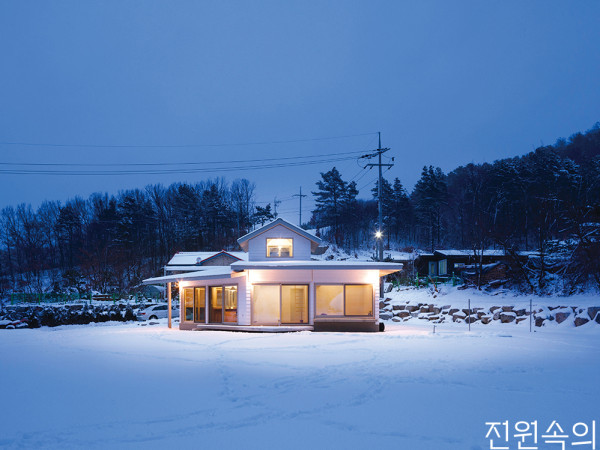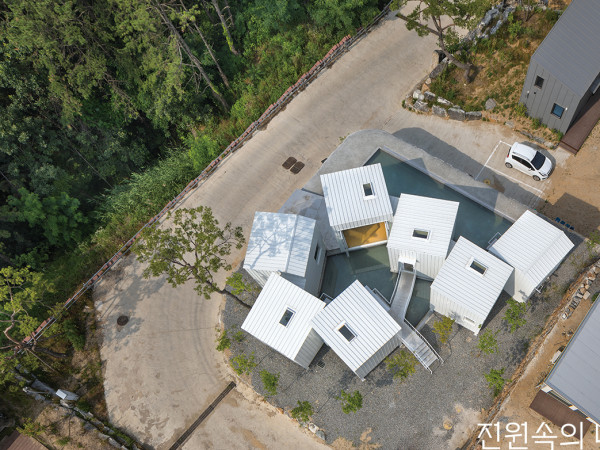 7개의 건물이 물 위로 내려앉았다. 주거의 기본적인 기능은 담되, 가변적으로 사용할 수 있게 한 가족의 새 공간이다.건축가 세 명의 공동 프로젝트 중 한 채인 물 위의 방. 멀리 저수지의 풍경을 주택 속에 고스란히 담아냈다.SITE땅과 가족의 인연은 30년 전으로 거슬러 올라간다. 건축주의 부모님은 젊은 시절, 언젠가 나이 들면 자연과 어우러진 곳에 집 짓고 살고 싶단 꿈 하나로 이 부지를 마련하셨다고 한다. 사실 땅을 사고도 꿈의 실현까지는 기약 없는 긴 기다림의 연속이었다. 그래도 컨테이너 박스를 임시거처 삼아 그곳에 살았던 기억은 그에게 여전히 어릴 적 소중한 추억으로 남았다.어느 날, 농업용수 확보라는 명목으로 부모님 땅 근처에 저수지가 조성되고 이후 사람의 손길이 더해져 길이 생겨났다. 그리고 그 길을 따라 교외에서 마주했던 익숙한 개발 풍경이 이곳까지 닿았다. 그대로 두기 아까워 땅의 쓰임에 대해 고민하던 그는, 지인의 소개로 건축가를 만났다.주변 자연과 어우러진 수(水)공간높낮이에 변화를 주어 건물에 리듬감을 부여했다.SECTION ①방(Undefined Area) ③가변 수영장(Bath Pool)“얼마 전 안타깝게 고인이 되신 故정효원 소장님께서 제 이야기를 듣고 현장에 와주셨어요. 땅을 천천히 둘러보시곤 ‘마음을 휴식하게 해줄 수 있는 곳’이라며 흔쾌히 설계를 맡아주시기로 했죠.”땅의 규모를 생각해 펜션의 용도를 포함한 3채의 건물을 의뢰했던 그에게 정효원 소장은 여러 명의 건축가가 함께 대지를 채워나간 작업을 보여주며 공동 프로젝트를 제안했다. 한 사람이 했을 때보다 더 창의적이고 한계를 넘나드는 재미있는 결과물이 나올 거라는 기대와 설렘에 가슴이 두근거렸다. 그렇게 정효원, 정영한, 김희준 3명의 건축가가 설계를 맡은, 각각의 개성을 더한 공사가 시작되었다.그중 ‘물 위의 방’은 정영한 소장이 계획한 실험적 공간이다. 저수지라는 인공호의 풍경을 적극적으로 빌어 대지 안에 물을 담고, 그 물을 통해 사용자들이 다양한 경험을 할 수 있게 했다. 누구나 한 번쯤은 꿈꿔봤을 멋진 공간이지만, 사실 실현되기까지는 우여곡절도 많았다.사용자가 쓰임에 맞게 가변적으로 활용할 수 있다.내부 모습. 연면적이 30평 이하로 크지 않은 공간이다.HOUSE PLAN대지위치 ▶ 충청북도 청주시대지면적 ▶ 402㎡(121.60평) | 건물규모 ▶ 지상 1층건축면적 ▶ 80.26㎡(24.27평) | 연면적 ▶ 80.26㎡(24.27평)건폐율 ▶ 19.97% | 용적률 ▶ 19.97%주차대수 ▶ 1대최고높이 ▶ 4.10m구조 ▶ 기초 – 철근콘크리트 / 지상 – 철골조 + 경량목구조 하이브리드 결합방식(벽, 지붕 : 경량목구조)외부마감재 ▶ 알루미늄 절곡 가공 패널 | 창호재 ▶ 시스템창호에너지원 ▶ 기름보일러조경 ▶ 건축주 직영시공 ▶ 드웰링 파트너즈(이계준 소장)설계 ▶ 정영한 아키텍츠 02-762-9621 www.archiholic.com집 안에서 바라본 수공간. 예상대로 현실적인 관리는 매우 까다롭지만, 이 또한 주택 생활의 일부분이라 생각하고 재미난 여름을 보냈다고 건축주는 전한다. “세 건물 동시 진행에서 부딪힌 자금 압박과 관리에 대한 부담으로 ‘수(水)공간’을 흔쾌히 받아들이긴 힘들었어요. 그렇지만 공사를 하며 가장 중요하게 여겼던 부분이 ‘내 생각보다는 건축가의 의견을 따르자’였기 때문에 이것저것 고려해 다시금 용기를 냈죠.”고민했던 시간이 아까우리만큼 결과물은 만족스러웠다. 낮은 산과 저수지의 풍경이 전부였던 이곳에 3×3 큐브 형태로 연결된 구조와 높낮이에 변화를 준 공간감, 집 어느 곳과도 마주하는 수공간의 조화는 마치 액자처럼 곳곳의 풍경을 담아 시각적 재미까지 품어냈다.3×3의 매스로 둘러싸인 반사 중정(Reflective Courtyard)적당한 크기의 창을 곳곳에 내어 다양한 풍광을 감상할 수 있는 시각적 재미를 품었다. INTERIOR SOURCE내부마감재 ▶ 벽 – 도장 / 바닥 – 에폭시 콩자갈욕실 및 주방 타일 ▶ 을지로 백송세라믹 | 수전 등 욕실기기 ▶ 아메리칸스탠다드주방 가구 ▶ 현장 제작(자작 합판 + 스테인리스 헤어라인 절곡)조명 ▶ 을지로 모던라이팅 | 현관문·붙박이장 ▶ 현장 제작계단재·난간 ▶ 현장 제작(스테인리스 체크 플레이트 + 금속 평철 및 환봉 난간)PLAN (1F - 80.26㎡) ①방(Undefined Area) ②주방/식당 ③가변 수영장(Bath Pool) ④반사 못(Reflective Pond) ⑤반사 중정(Reflective Courtyard) ⑥반사 수영장(Reflective Pool) *상기 방들의 기능은 사용자가 정의한다.“자식들 밥 굶기지 않겠다는 마음으로 일만 해 오셨던 부모님의 마음과 삶을 비출 수 있는 건물을 살아계실 때 지어 보여드리고픈 소망이 있었어요. 부모님이 돌아가시더라도 남은 건물을 통해 두 분의 뜻을 바라보고 느끼고 살아가고 싶습니다.”물이 비워진 기간 ‘물 위의 방’에는 건축주와 부모님이 함께 머무르고 있다. 휴식과 치유의 공간이 되기를 희망했던 초심처럼, 이곳에서 가족은 첫 번째 겨울을 맞이한다.7개의 매스로 연결된 주택어둠이 내려앉은 시간, 환하게 불을 밝힌 물 위의 방 전경“집을 짓는 것은 매우 재미있고 의미 있는 일입니다. 완벽한 집은 없어요. 그저 내가 무엇을 중요하게 여기는 사람인지를 집짓기를 통해 알아갈 뿐이죠. 