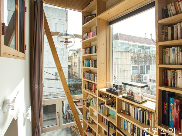 과감한 청록색 외관과 비정형 창문에 놀라긴 이르다. 실내로 들어서는 순간, 작은 집에 꽂힌 수많은 책과 장쾌한 실내 구조에 감탄이 절로 나온다.외관은 날렵한 각도의 창과 과감한 색상의 청록색 도료로 미장 마감해 강렬한 인상이다. SECTION ①현관 ②거실 겸 주방 ③화장실 ④방 ⑤계단실 ⑦다락 ⑧원룸 ⑨데크 대학에서 문헌정보학을 가르치는 건축주는 건축가를 만나자마자 책이 많다는 말을 먼저 꺼냈다. 해외 단독주택에서 13년 정도 살다가 2005년 귀국했고, 서울 성북구에 소재한 아파트에서 다시 13년을 아내, 아들, 딸과 살다 보니 다시 단독주택 생활이 그리워지던 터. 거주하던 동네는 포기하고 싶지 않아 건축가와 함께 인근을 돌아봤고, 면적은 크지 않아도 필지가 반듯한 지금의 땅을 만났다.현관문을 열고 나서 15분 걸으면 도착하는 북한산 입구, 매일 산책해도 지겹지 않은 정릉천, 옛 정취가 그윽하게 남은 시장과 천변의 풍경 등 동네는 더할 나위 없이 좋았다. 문제는 작은 땅에 네 식구와 많은 양의 책을 수용할 집을 짓는 것이었다.집의 중심 공간인 2층 가족실. 한쪽 벽면을 채운 가족서가는 구조목으로 제작해 많은 책의 무게도 끄떡없다.1층은 콘크리트조, 2, 3층은 목조주택임을 서로 다른 외장재에서도 짐작할 수 있다. HOUSE PLAN대지위치 ▶ 서울시 성북구대지면적 ▶ 83.29㎡(25.19평) │ 건물규모 ▶ 지상 3층 + 다락건축면적 ▶ 48.98㎡(14.81평) │ 연면적 ▶ 122.71㎡(37.11평)건폐율 ▶ 58.81% │ 용적률 ▶ 147.33%주차대수 ▶ 1대 │ 최고높이 ▶ 9.77m구조 ▶ 철근콘크리트구조(1층) + 중목구조(2, 3층)단열재 ▶ 기초 및 1층 배면 – 압출법보온판 / 1층 외벽 - 비드법보온판 / 2,3층 외벽 및 지붕 – 그라스울외부마감재 ▶ 벽 - 파렉스 외단열 미장 마감, 벽돌타일 / 지붕 – 컬러강판창호재 ▶ 이노틱 PVC 시스템창호 + THK24 로이복층유리, VELUX GPL+ THK24 로이복층유리, 이건 AL 창호 + THK24 로이복층유리, THK27.76 접합로이복층유리에너지원 ▶ 도시가스 │ 전기 ▶ 거산ENG 김기표기계·설비 ▶ 유영설비기술연구소 김성률구조설계(내진) ▶ ㈜허브구조 김형만 구조기술사설계 ▶ ㈜에이디모베 건축사사무소 이재혁시공 ▶ ㈜수피아건축3층 침실에서 바라본 모습. 박력 있는 구조의 미학이 실내에 고스란히 드러난다. 2층에서 3층 올라가는 계단실 옆의 오목한 공간. 직장 가까이에 있다는 이유로 처음 찾은 건축가는 ㈜에이디모베 건축사사무소 이재혁 소장이었고, 그는 서류에 이름을 남긴 마지막 건축가가 되었다. 그 역시 가족과 함께 사는 집을 협소주택으로 짓고, 집에는 계단실을 수직으로 가로지르는 서가가 있다(본지 2017년 5월호). 운명이라고 해도 좋을 첫 만남에 설계가 시작되었다.땅은 남북방향으로 1.8m 높이의 경사를 가지고 있는 좁은 골목 사이에 위치한다. 건축가는 이웃에게 피해를 덜 주기 위해 목구조를 이용한 빠른 공사가 적합하다고 판단했다. 공장에서 재단한 프리컷 (Precut) 부재를 현장 조립만 하면 되는 중목구조 방식이 집의 메인 구조로 결정되었다. 건축주 역시 해외에서 목조주택에 거주한 경험이 있던 바였다.둘째 아이의 3층 방에 낸 창과 연결돼 재미를 더한다. 1층과 2층 사이의 현관부 계단실. 보일러, 전기분배기를 포함한 각종 수납 공간은 현관 주변 벽을 활용했다. / 집 안 어디에서도 보이는 가족 서가 그러나 이미 장성한 자녀와 부부가 쓰기에는 면적이 충분하지 않았다. 취직한 큰아이가 출가를 한다면, 여기서 신혼생활을 시작할 수 있을 정도의 공간도 마련해주고 싶었다. 그리하여 1층은 철근콘크리트조의 별도 세대로 꾸미고, 2층과 3층, 다락은 중목구조로 지어 남은 세 식구가 거주할 수 있는 하이브리드형 주택으로 방향이 잡혀 나갔다.평소 집에서 보내는 시간이 많고, 가족이 함께 카페 투어도 다닐 만큼 오붓한 터라 2층은 과감하게 한층 전체를 주방 겸 거실로 계획했다. TV와 소파를 중심으로 한 전형적인 거실 대신 가족서가(家族書架)와 큰 테이블이 있는 구성으로 완성되었는데, 이 공간이 생기고 나니 함께 보내는 절대적인 시간의 양은 물론 질도 높아졌다고 건축주는 전한다.대지의 경사가 있어 2층 주방에서 바로 실외로 연결된다.첫째가 혼자 쓰는 1층 원룸. 추후 신혼집으로 쓰기 위해 동선과 층을 구분했다.외관은 주변 건물로부터의 시선을 고려했을 때 남쪽에 크게 창을 낼 수 없는 상황이었다. 대신, 계단실이 있는 동쪽과 공적영역에 속하는 남서쪽 모서리에 임팩트 있게 계획되었다. 힘이 흐르는 방향이 그대로 드러나는 중목구조의 역동적인 선을 따라 창의 프레임을 겹쳐 시공한 것. 이는 외부뿐만 아니라 내부에서도 스펙터클한 경관을 만들며 집의 아이덴티티가 되어 준다.집의 또 다른 중심 공간인 서가 역시 남서쪽의 창과 함께 저층에서 다락까지 이어져 모든 공간을 하나로 엮는 구심점 역할을 톡톡히 한다. 특히 계단실의 오목한 알코브는 아늑한 독서 공간으로 꾸며져 가족의 사랑을 독차지하게 되었다.3F – 33.1㎡ / ATTIC – 11.72㎡1F – 48.64㎡ / 2F – 40.97㎡PLAN①현관 ②거실 겸 주방 ③화장실 ④방 ⑤계단실 ⑥드레스룸 ⑦다락 ⑧원룸 ⑨데크 ⑩주차장PROCESS01(