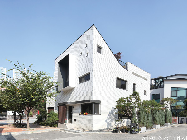 조용한 주택에 들어선 카메라를 닮은 하얀 집. 세상의 아름다움을 사진으로 담듯 매일 가족의 행복을 담아내는 중이다.화이트 파벽돌의 단정한 바탕에 카메라의 특징을 유치하지 않게 담았다. 도드라진 가운데 큰 스터디룸 창은 렌즈에서, 우측 위 작은 창들은 플래시에서 영감을 얻은 부분. 위에서 내려다 본 주택의 모습. 지상에서보다 카메라의 모습이 짙게 묻어나온다. ⓒGIP“집 모습을 보고 나면 ‘카메라를 좋아하시나 봐요?’라는 질문을 항상 받아요(웃음).”건축주인 김리형, 최영인 씨 부부는 사실 어려서부터 살던 아파트 생활에 익숙했다. 하지만, 은퇴 후 마당 있는 집으로 옮기신 부모님을 찾을 때면 마음이 달라졌다. 시부모님댁에 갈 때마다 아이들이 자연스럽게 집을 누비며 노는 것을 보면서, 주택이 주는 추억을 만들어주고 싶어졌다고. 택지 구매 후 깔끔한 현장관리와 완성도에 깊은 인상을 받아 ‘GIP’를 파트너로 낙점하고 집짓기 여정을 시작한 가족. 아이들은 놀이로, 부부는 로망으로 집에 생각을 보태나갔다.그렇게 15개월이 지나 작년 5월, 부부와 두 아이, 네 마리 반려동물까지 여덟 식구는 그들의 일상을 담아줄 카메라를 닮은 집을 만났다.임대 세대의 출입구. 통행로에 면해있는 출입구이기에 목재 루버로 프라이버시를 보호하고자 했다. 지붕의 박공에서 시작해 바닥까지 이어지는 블랙 톤의 컬러강판 마감은 도로에서 바라본 주택이 다른 주택과 비교해 지나치게 튀지 않게 다듬으며, 메인뷰 화이트 톤과의 대조에서 균형감을 준다. ⓒGIPSECTION ①현관 ②알파룸 ③마스터룸 ④침실 ⑤거실 ⑥주방 ⑦욕실 ⑧드레스룸 ⑨스터디룸 ⑩다락 임대 세대와 주인 세대가 함께하는 주택을 위해 처음에는 듀플렉스 주택도 고민했다. 하지만, 익숙한 아파트 구조에서의 급격한 변화와 듀플렉스의 수직적인 생활 동선을 원치 않았던 부부는 공간을 수평으로 풀기 위해 층으로 세대를 구별하고자 했다. 이때 자칫 평범한 다세대 빌라처럼 보일 수 있어 외관에 대한 고민이 필요했고, GIP 이장욱 대표의 제안으로 지금의 카메라를 닮은 독특한 입면 계획이 탄생했다.중정과 함께 1층에 배치된 알파룸. 개수대와 화장실을 함께 두어 오랜 시간 손님이 머물러도 편히 지낼 수 있다.택지 지구에서 중정은 가족만의 프라이빗한 녹지가 되어준다.디딤돌과 자갈이 깔린 후면을 따라가면 주인 세대로 진입하는 현관이 나타난다. HOUSE PLAN대지위치 ▶ 경기도 용인시 수지구대지면적 ▶ 255.00㎡(77.27평) | 건물규모 ▶ 지상 2층 + 다락건축면적 ▶ 127.28㎡(38.56평) | 연면적 ▶ 223.23㎡(67.64평)건폐율 ▶ 49.91% | 용적률 ▶ 87.54%주차대수 ▶ 2대 | 최고높이 ▶ 10.02m구조 ▶ 철근콘크리트구조 | 단열재 ▶ 벽 – 비드법보온판 150T(외단열), 열반사단열재 20T(내단열) / 지붕 – 압출법보온판 220T외부마감재 ▶ 외벽 – 컬러강판, 파벽돌, 스터코 / 지붕 – 컬러강판창호재 ▶ 이건창호 | 에너지원 ▶ 도시가스, 태양광 패널설계 ▶ GIP 건축사사무소시공 ▶ GIP 하우징 031-8020-8800 www.ecocellhome.com현관문과 알파룸, 계단 사이에 위치한 화장실은 외출 후 손 씻기 등의 위생과 손님용 화장실 역할을 동시에 수행한다. 하지만, 특정 물건의 구체적인 형태를 그대로 따르면 자칫 디자인이 유치해질 수 있었다. 그래서 카메라의 각 요소를 상징화하는 작업을 거쳐 느낌은 취하되 과하지 않도록 조절했다. 외부 시선이 가장 많이 닿는 전면과 좌측면 상부에는 벽을 타고 흘러내리는 우아한 곡선 디자인을 적용해 딱딱하고 무미건조한 상자 같은 느낌을 피해 입체감을 주고자 했다.POINT자연광을 들이는 천창다락과 다락 사이, 거실 바로 위에는 카메라 셔터를 형상화한 천창이 배치되어 있다. 천창은 거실에서 바깥의 날씨나 하늘을 조망할 수 있는 시각적 통로 역할을 하면서, 거실에 빛을 풀어내는 자연조명의 역할도 담당한다.거실 천창은 자연 실내 조명의 역할과 함께 푸른 하늘도 감상할 수 있다. 싱크대 위에는 상부장을 없애고 창을 크게 내어 개방감을 살리고 아이들을 살필 수 있게 한다. 오픈된 천장을 갖는 남서향의 스터디룸DIAGRAM전통적인 내부 공간 배치 방식의 틀을 깨고, 남측부터 4개의 레이어를 나누어 자연광 및 바깥 조망 우선도를 차등적용해 공간을 배치했다. 부족한 자연광은 천창과 테라스 등 다양한 장치로 보강했다.●1st Layer복층 침실 겸 스터디룸, 중정●2nd Layer식당, 거실●3rd Layer주방, 안방, 욕실1, 욕실2●4th Layer계단실, 드레스룸, 다용도실스터디룸에 면한 두 아이 각각의 방은 복층으로 구성돼 넉넉한 개인 공간을 가진다. 외부 시선이 닿지 않는 테라스에서는 티타임을 갖거나 빨래를 건조하기도 한다. 현관문을 통해 들어가면 손님을 맞아 티타임 등을 즐길 수 있는 알파룸과 중정을 만난다. 모던한 스타일의 집이지만, 주 생활 공간에서 분리된 알파룸은 사랑방이라는 한국적인 개념을 재해석한 공간이다.2층은 우선순위와 기능에 따라 아이들 공간, 가족 공간, 프라이버시 및 위생 공간, 작업 공간 등 4개의 레이어로 나눠 남쪽부터 각각을 배치했다. 레이어를 나누긴 했지만, 벽체 대신 슬라이딩 도어를 설치해 4열의 드레