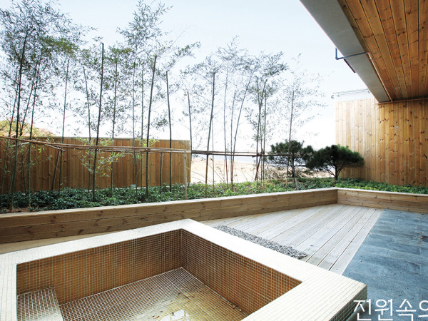 마을길을 따라 길게 놓인 벽 너머, 제주 속 또 다른 제주가 있다. 그 아름다운 모습을 다른 이들과도 나누고 싶어 문을 연 아늑한 민박집이다.도로에서 보이는 건물 전경SECTION ②주방/식당 ③욕실 ⑤거실 ⑦수영장 ⑨방 해외 주재원으로 직장생활을 하고 있는 남편을 따라 어린 아들을 데리고 바다를 건넜다. 그렇게 시작된 타국에서의 하루하루. 시간이 지날수록 즐겁기보단 서러움이 밀려왔다. 향수병이었다. 더 이상은 견디기 힘들다는 판단 하에 그녀는 한국으로 돌아올 계획을 세웠다. 종착지는 ‘제주’였다.“제주 이민자가 늘고 있다는 소식이 한창이던 즈음, ‘아, 이곳이다’ 싶었어요. 바쁜 도시에서 사는 사람들은 언젠가 한적한 곳에서 조용하게 살고픈 생각을 한 번쯤 하잖아요.”가족들과 함께 한 제주 여행의 소중하고 즐거웠던 추억은 섬 생활 결심에 힘을 보탰다.넓지 않은 면적이지만, 큰 창을 설치함으로써 개방감을 살렸다.도로와 건물 사이로 긴 벽을 세웠다. 벽 사이 구운 대나무는 집을 시골 풍경 속에 녹아들게 한다. 물론 넓디넓은 제주 땅에서 어디에, 어떻게 살아야 할지는 여전히 미지수였다. 고민이 거듭될수록 정보에 대한 한계와 어려움에 부딪혔다. 결국 남편을 뒤로 한 채 그녀는 아이와 제주행 비행기에 무작정 몸을 실었다. 일단 살아봐야 했다. 이미 제주의 땅값과 집값은 오를 대로 오른 상황. 늦은 감은 있었지만, 이왕 왔으니 열심히 발품을 팔았다.돌담과 벽으로 둘러싸인 아늑한 외부 공간건물의 입면을 다채롭게 해주는 2층 방. 수영장을 굽어보는 삼각형의 창과 하늘에서 쏟아져 내려오는 빛을 받는 천창, 그리고 멀리 삼방산을 한눈에 바라볼 수 있는 통창이 내부에 숨겨져 있다. “그나마 조금 익숙해진, 처음 정착한 동네 위주로 적당한 땅을 알아보았어요. 그런데 뭐든 다 때가 있다고들 하잖아요. 마침 원하는 면적의 터가 매물로 나왔고, 지인의 소개로 건축가까지 만났죠.”집짓기의 ‘집’자도 모르던 그녀에겐 하나부터 열까지 큰 도전이었다. 이웃과의 소통도, 건축비 외 예상치 못한 만만찮은 비용도 복잡하고 힘들었다. 다행히 주변의 도움이 있어 무사히 공사를 마쳤다.siteHOUSE PLAN대지위치 ▶ 제주특별자치도 서귀포시 │ 대지면적 ▶ 321㎡(97.1평)건물규모 ▶ 지상 2층건축면적 ▶ 80.49㎡(24.35평) │ 연면적 ▶ 88.97㎡(26.91평)건폐율 ▶ 25.70% │ 용적률 ▶ 27.70%주차대수 ▶ 1대 │ 최고높이 ▶ 6.3m구조 ▶ 기초 – 철근콘크리트 매트기초 / 지상 – 철근콘크리트단열재 ▶ 벽 – 비드법단열재 2종(가등급) 70㎜ / 지붕 – 비드법단열재 2종(가등급) 150㎜외부마감재 ▶ 외벽 – 백색 스터코 위 오염방지코팅, 구운 대나무 / 지붕 – 파쇄석 마감담장재 ▶ 제주자연석 │ 창호재 ▶ 윈센 24㎜ 로이복층유리에너지원 ▶ 기름보일러시공 ▶ 정윤기 │ 설계 ▶ 포머티브 건축사사무소거실에서 본 수영장의 모습 1층 가장 안쪽에 배치된 거실 및 침실은 안정적이면서 프라이버시가 확보된 공간이다. 중간에 놓인 나선형 계단을 오르면 2층 방과 연결된다. 그리고 이곳에 살겠단 처음 계획과 달리 그녀는 민박집 주인이 되었다.“고민했던 집 구조와 공간을 사람들이 좋아하고 이렇게 집을 짓고 싶다는 말을 건네줄 때마다 그간의 고생이 잊힐 만큼 기쁘고 뿌듯했어요. 그래서 많은 이들과 이 공간을 공유하면 어떨까 하고 이 일을 시작하게 되었습니다.”처음 제주에 왔을 때처럼 지금 선택에 후회는 없다. 그저 현재의 즐거움만 있을 뿐이라고 그녀는 전한다.투명 창은 건물 안과 밖의 구분을 없앴다. 채광 좋은 주방 및 식당 공간 도로와 길게 면하는 대지에 지어진 집도로와 면해 있는 길고 좁은 대지의 특성상 도로와 주택의 관계에 대한 아이디어가 무엇 보다 중요했다. 특히 길에서 발생할 수 있는 소음과 가족의 프라이버시 확보는 설계의 관 건이었다. 따라서 단순하게 도로와 건물과의 사이를 벽이라는 가림막으로 막아버리는 일 차원적인 방식보다는, 일종의 ‘켜’를 두고 두 공간이 상호 대응할 수 있는 방향을 찾고자 했다.이곳을 설계한 포머티브 건축사사무소 이성범, 고영성 소장은 긴 벽 사이에 6cm 직경의 구운 대나무를 일정 간격으로 촘촘히 세워 내부를 가려주면서도 작은 바람 길을 열어주 는 방법을 택했다. 이러한 자연 소재의 입면이 벽의 일부를 채움으로써 새롭게 들어선 낯 선 건물은 한가로운 마을 풍경 속에 녹아들었다. 특히 시간의 흐름에 따라 조금씩 바뀔 대나무의 색감은 자칫 단조로워 보일 수 있는 새하얀 스터코 입면에 소소한 변화를 줄 것으로 기대된다.집 안 어디에서도 마주할 수 있는 수공간. 낮에는 따스한 햇볕이 수면에 일렁이고, 저녁에는 낮게 깔린 간접등으로 분위기를 돋운다. 필요한 가구만으로 깔끔하게 정리된 거실 벽 뒤에 숨겨진 5+1의 공간대부분의 건축주는 주택 계획 시 주거와 외부 공간과의 연결, 그리고 그 활용도에 대한 관심이 높다. 그녀 또한 외부 활동의 중요성을 강조했고, 이는 설계 방향에도 영향을 미쳤다. 일단 건축가는 대지를 나눠 벽이 아닌 ‘공간’과 ‘유리’로 각각을 구분했다. 먼저 입면의 연장선상에 있는 ‘주출입