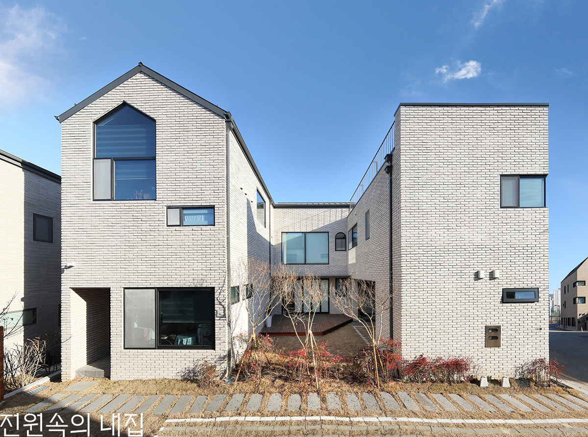맞벌이를 한다 해도 젊은 부부가 온전히 집 한 채를 갖는 것은 무리인 시대. 듀플렉스는 선택이 아닌 필수사항이었다. 대신 각 세대의 주차장과 출입 동선을 완전히 분리하고 소음 차단을 위해 배치와 시공 모두 각별히 신경 써달라 주문했다. 한편, 모퉁이에 위치한 택지 특성상 외부로 노출되는 면이 많았고, 방범과 사생활 보호를 위한 대책도 필요했다. 건축주는 단독주택의 장점인 열린 마당도 누리고 싶어 했는데, 이 요청을 어느 것 하나 포기하지 않고자 ‘ㄷ’자 형태의 중정 배치와 필로티로 공간을 풀어냈다. 그 결과 단순하고 조형적인 매스로 동네에 차분한 인상을 남기되 사생활과 안전은 보장받고, 거실과 연결된 가족만을 위한 마당도 가질 수 있게 되었다.