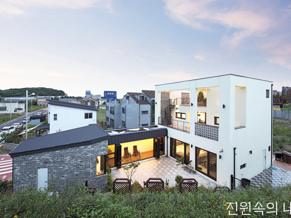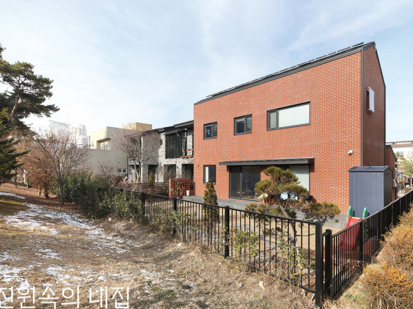 건축주는 직장 근처 판교의 단독주택에 살면서 본인들 손으로 직접 주택을 짓고자 여러 해 동안 땅을 찾고 있었다. 건축주가 살던 집은 외관은 단독주택이지만, 아파트와 동일한 내부구조에 마당이 협소해 아쉬웠다고 한다. 게다가 냉난방 효율이 낮은 것도 문제였다. 맞벌이 부부인지라 부모님과 같이 지내면서 어린 두 아이가 맘껏 뛰어놀 수 있는 넓은 마당과 맞춤형 실내공간의 꿈을 가지고 주택 설계를 의뢰했다.넓은 대지 위에 3세대를 위한 집 앉히기건축주가 찾은 땅은 일반적인 택지 개발을 통해 나온 단독주택지가 아니라 향린동산(경기도 용인시 동백동)이라는 오랜 세월을 통해 자생적으로 형성된 주택단지였다. 자연녹지지역(건폐율 20%)으로 170평 대지에서 30평을 쓸 수 있었다. 사실 넓은 대지에 집을 앉히는 일은 협소한 대지보다 더 많은 고민을 하게 만든다. 집을 구석에 배치하면 넓은 마당이 생겨 좋아 보이지만, 정원 관리 문제가 있고 주인공인 집이 왜소해 보인다. 그렇다고 집을 중앙에 배치하면 집과 정원의 구성이 어정쩡해질 수 있다. 더욱이 대지의 남쪽과 북쪽에는 작은 도로가 지나고 있다. 조망이 좋은 남쪽 면에 집의 정면과 큰 마당을 배치하고, 차량 이동이 많은 북쪽에 집의 후면을 두어 도로의 소음을 차단하였다. 집의 정면인 남쪽에는 한적하지만 주택단지 내부도로가 있어 사생활 보호를 위해 긴 벽을 세우기로 하였다.House The Wall _ 긴 벽을 통해 형성된 세 개의 마당하우스 더 월의 가장 큰 특징은 집의 정면부에 긴 가벽에 있다는 것이다. 이 벽은 기본적으로 남측도로로부터 집의 사생활을 보호한다. 건축주는 마당에 세 가지 기능을 담고 싶어 했다. 아이들이 뛰어놀 수 있는 큰 마당, 가족을 위한 중정 그리고 부모님을 위해 텃밭을 겸한 작은 정원이 그것이다. 긴 가벽으로 집의 내부와 외부에 경계가 생겼고, 벽의 앞쪽에는 큰 마당, 벽과 집 사이에는 중정 그리고 벽 끝에는 텃밭을 만들었다. 벽은 사생활을 보호하고 세 가지 색깔의 마당을 만들어 주었다. 1층 벽의 재료인 흰색 고벽돌을 비워 쌓아 자칫 단절감을 유발할 수 있는 외부가벽에 빛과 시선의 투과성을 만들었다. 가벽의 안쪽에는 정원 관리와 아이들 놀이기구를 수납할 수 있는 창고를 만들어 야외 생활이 많은 전원주택 삶에 적합성을 더했다.정갈한 박공지붕과 흰색 고벽돌의 대비대지 주변에 수목이 많고 남쪽으로 조망이 열려 있는 토지에 건축주는 심플하면서도 외부 자연환경과 대비되는 외관을 만들고 싶어했다.1층 외벽과 가벽은 흰색 고벽돌을 쌓고, 박공지붕과 2층까지 이어지는 외부 벽을 다크그레이 색의 컬러강판으로 처리하여 집에 강한 대비를 만들었다. 그렇게 주택은 모던하면서도 주변자연에 자연스럽게 녹아들었다. 낮에는 햇빛이 가벽을 통해 내부 중정으로 들어와 벽돌의 질감이 더욱 살아났고, 저녁 무렵이 되면 집 내부의 불빛이 가벽을 통해 바깥을 밝혔다. 중정 주변과 앞마당으로 이어지는 중정 문은 목재를 사용하여 자칫 컬러강판과 흰색 벽돌이 줄 수 있는 건조함에 자연의 따뜻함을 더했다. 건축개요대지위치 : 경기도 용인시 기흥구대지면적 : 557.00㎡(168.49평)건물규모 : 지상 2층건축면적 : 108.80㎡(32.91평)연면적 : 169.44㎡(51.25평)건폐율 : 19.53%용적률 : 30.42%주차대수 : 2대최고높이 : 8.3m구조 : 기초 - 철근콘크리트 매트기초, 철근콘크리트 줄기초 등 / 지상 - 벽 : 경량목구조 외벽 2×6 구조목 + 내벽 S.P.F 구조목 / 지붕 : 2×8 구조목단열재 : 그라스울 32K, 비드법단열재 2종2호 50㎜(가등급), 압출법보온판 100㎜(가등급)외부마감재 : 외벽 – 240*60*20T 고벽돌 타일(백색), 벽돌비워쌓기, 컬러강판 0.5T / 지붕 – 컬러강판 0.5T창호재 : 이건창호 로이 3중유리철물하드웨어 : 심슨스트롱타이 에너지원 : 도시가스, 태양광전기·기계·설비 : 정연엔지니어링시공 : ㈜우리마을설계 : mlnp architects (엠엘앤피 아키텍트 건축사사무소) 02-572-8026, http://mlnparchitects.com한옥의 지혜 _ 마당을 중심으로 공용 공간과 개인 공간 만들기가벽을 통해 형성된 중정형 마당 주변은 우리의 전통 한옥을 생각나게 한다. 대문을 통해 중정으로 들어오면 부모님이 거처하는 방이 사랑방 역할을 한다. 사랑방에서는 마당과 뒤뜰을 바라보는 큰 창이 있으며, 창 앞에는 툇마루를 배치하여 주변의 고즈넉한 풍경을 감상할 수 있다. 1층의 거실과 식당은 하나의 공간으로 연결되어 있어서 아이들을 보면서 저녁을 준비할 수 있고, 가족들이 한 공간에 있다는 느낌을 준다. 2층에는 두 아이와 건축주 부부의 방을 배치하였다. 아직은 어린 두 아이의 방은 현재에는 하나로, 미래에는 두 개의 방으로 나눌 수 있게 설계하였다. 그리고 그 위에는 아이들 다락방 겸 책장을 만들었다. 부부가 머무는 2층 메인 침실은 외부 테라스로 바로 나갈 수 있어서 1층에서는 볼 수 없는 풍경을 선사한다. 가족이 모이는 공간과 개인 공간이 유기적으로 연결되면서도 사생활이 보장되도록 고려하였다자재사양내부마감재 ; 벽 - 벤자민무어 친환경 도장 / 바닥 – 이건 강마루욕실 및 주방 타일 : MK TOTAL수전 등 욕실기기 : 대림바스주방 가구, 붙박이장 : 개인 공