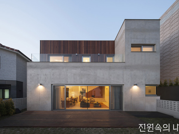 우리는 이 공간의 이름을 애둘러 표현하지 않고 직설적으로 시그니처 하우스라 정했다. 강렬했던 첫 만남의 인상을 가감 없이 드러냈기 때문이다.외부 정면 모습인상적인 거실 앞 데크전체 60평의 이 공간은 사업가 부부가 훗날 노년을 보내기 위해 설계를 의뢰했다. 대화를 이어가면서 그들의 생각(집에 대한 의견들과 취향)을 이해하는 과정은 그들이 사는 모습 자체가 이 집의 형식을 구성하는 결정적인 단서가 되도록 했다. 단순함의 무게를 갖되 그 안에 온기를 품고 있는 공간이어야 했다.주택의 후면부 단단하게 응집된 형상의 외관밀집된 아파트 단지 사이, 숨구멍처럼 낮은 산으로 둘러싸인 마을에 위치한 대지는 마을 안쪽을 향한 남서쪽은 빛을 받기 좋고 마을 바깥쪽으로 향한 북동쪽은 근경으로 녹지를 조망할 수 있는 형태의 땅이었다. 대지를 경계로 마을 안쪽과 바깥쪽의 높이 차가 약 5미터, 지하층을 두어 마을 안쪽의 집들보다 높은 대지레벨을 계획할 수 있어 시각적 확장을 얻을 수 있는 조건이었다.HOUSE PLAN대지위치 : 경기도 용인시 | 대지면적 : 233㎡ | 건물규모 : 311.87㎡ | 건축면적 110.19㎡ | 연면적 : 전체 311.87㎡, 지하층-112.20㎡, 1층-108.49㎡, 2층-91.18㎡ | 건폐율 47.29% | 용적률 51.36% | 주차대수 4대 | 최고높이 9.488m 구조 : 기초-철근콘크리트 매트기초, 지상-철근콘크리트, 지붕-철근콘크리트 위 무근콘크리트 위 우레탄방수 | 단열재 : 수성연질폼 120㎜ 발포 | 외부마감재 : 노출콘크리트 위 발수코팅, 멀바우 데크재, 테라코사하라 | 창호재 : 이플러스 시스템창호 43mm 삼중유리 전기·기계 : 한얼 건축사사무소 | 설비 : 한얼 건축사사무소 | 토목 : 한얼 건축사사무소 | 구조설계(내진) : 한얼 건축사사무소 | 시공 : 100A associates | 설계 : 100A associates외부 정면 디테일과 주택의 입구현관부 모습마을에 진입하여 마주하는 건축의 지하층에 해당하는 매스는 나란히 나열된 이웃집들과 위화감 없이 어우러지게 하되, 마을의 바깥쪽에서 마주하는 건축의 형태는 될수록 단순하게 하여 콘크리트의 무게만을 두어 주위와 대립시켰다.디테일 단면도채광 좋은 거실단 차이를 둬 배치한 거실과 주방 겸 식당INTERIOR SOURCE내부마감재 : 벽-도장, 무늬목 / 바닥-포세린타일, 원목마루 / 천장 : 도장 | 욕실 및 주방 타일 : vista 수입타일 | 수전 등 욕실기기 : Treemme, Kartell, 아메리칸스탠다드, 대림바스 | 주방가구 : 현장제작 MDF 위 도장 | 조명 : 테크노전기, Flos 계단재, 난간 : 포세린타일, 도장 | 현관문 : 이플리스 시스템도어 | 중문 : 현장제작(금속자재 위 도장마감 + 강화유리) | 방문. 붙박이장 : 현장제작 MDF 위 도장 | 데크재 : 멀바우 19㎜주방에서 본 거실과 현관 쪽 전경 2층으로 오르는 계단실1층 파우더룸으로 연결되는 공간‘ㄱ’자 창이 설치된 정갈한 1층 침실앞마당의 면적을 최대로 확보하기 위해 내부공간을 뒤로 물리고 높은 벽 사이의 좁은 계단을 통해 진입하도록 하여 전이공간으로서 심리적 긴장감을 갖도록 했다. 이 긴장감을 안고 내부공간에 들어섰을 때 마주하는 농밀한 온기는 심리적 안정감을 준다. 공간과 공간의 조직을 가능한 단순하게 하고 크고 작은 프레임을 통해 다시 공간의 흐름을 갖게 함으로써 섬세한 균형을 이루는 공간이 되도록 했다. 결과적으로 이 공간은 주인으로부터 얻은 단서를 표면으로 드러내는 과정을 통해서 외강내유(外剛內柔)한 공간으로 구축된 셈이다.계단실깔끔하게 마감된 계단실 공간2층 복도 끝에 놓인 마스터룸2층 욕실과 베란다2층 침실침실과 연결되는 서재 공간주거공간은 결국 공간과 그곳에서 삶을 영위해 나아갈 사람만 남는다. 흥미로운 것은 그들의 사고와 삶의 방식을 이해하고 그것들을 공간에 담았을 때 비로서 그들의 삶이 담기어지기 시작한다는 것이다. 이 공간 또한 앞으로 그들의 삶이 축적되어 그들이 사는 모습 자체의 공간이 되길 바란다.<글ㆍ100A associate>건축가_100A associate[백에이어소시에이츠]1부터 시작해서 가까스로 98을 지나고, 99를 거쳐 드디어 다 다르게 되는 100. 百이라는 것은 하루 낮과 밤, 지구 1년 사시의 생장영장을 상징하는 수이며, 천지의 모든 이치를 상징하는 수이다. 수로서 낱낱이 셈하는 百 그보다 더한 의미를 갖고 있으며 수이상의 것으로 하나의 상징성을 갖는다. 100 A는 시간과 장소를 초월하는 ‘순수성’_천지의 모든 이치, 100을 대하는 우리의 미학적 의견과 태도, 그리고 그것과의 소통을 통한 정리와 해답을 통한 인문학적 기록을 남기고자 한다.02-919-9135, www.100a-associates.com구성_김연정 | 사진_김재윤ⓒ 월간 전원속의 내집 www.uujj.co.kr