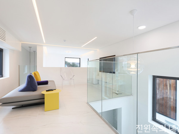 조용한 시골마을, 하얀 집 한 채가 서있다. 초록의 올리브 나무 사이에서 그 존재감을 각인시키며 하염없이 바라보게 하는 그런 집.올리브 나무와 어우러진 하얀 주택의 외관서측에서 바라본 모습. 주차공간과 연결된 긴 계단이 주출입구 앞에 위치한다.주택은 포르투갈의 중부에 위치한 폰테 보아(Fonte Boa)의 시골 땅에 지어졌다. 포도밭과 올리브 과수원이 있는 작은 대지로, 아름다운 산과 계곡이 주위를 둘러싸고 있다. 한때 이곳은 고대 로마시대(BC 4세기경)의 별장이 있었던 장소로, 지금은 주로 아담한 식물과 올리브 나무들로 풍경을 이룬다.주변 나무숲과 계곡의 전망을 활용하기 위해 서측 가장자리에 건물을 놓았다. 덕분에 주도로로부터 가족의 사생활이 보호되고, 채광에 유리한 위치를 확보할 수 있었다. 특히, 기존의 비탈면과 주변 모든 나무들을 그대로 유지 및 보존해야 했으므로, 지형에 큰 변화를 주지 않을 위치를 선택하여 집을 세웠다.주변 자연 환경을 그대로 유지하여 건물과 조화를 이루도록 했다. / 지면보다 낮은 개방형 차고 콘크리트 외벽의 지하층에는 와인저장고를 두었다.SECTION주변 풍광이 거실 안으로 들어온 듯한 큰 창이 인상적이다.목재로 마감한 내부. 계단 칸칸에 모두 수납공간을 두어 다양한 물건들을 넣어 둘 수 있도록 배려했다. 블랙 컬러의 난로는 공간 내 포인트가 되어준다.전통적인 포르투갈의 단독주택 유형을 재해석한 이 집은, 징크로 마감한 경사지붕을 가진 두 개 층의 직사각형으로 이루어져 있다. 콘크리트 구조의 지하층에는 소규모의 와인저장고를 두고 경사면으로부터 분리한 것이 특징이다.도로에서 주택으로의 진입은 대지의 남측 경계에 쌓은 돌담의 개구부를 통해 이뤄진다. 지면보다 낮은 개방형 차고는 콘크리트 벽으로 에워싸인 반지하 구조로 설계되었고, 이곳에는 세탁실과 주거공간으로 올라가는 계단이 놓였다.방풍문이 설치된 집의 입구까지는 플랫폼(Platform) 방식의 긴 계단으로 연결되어 있다. 계단과 부속 공간들로 채워진 두 개 층은 모두 세 부분으로 구성되며 1층에는 주방과 식당, 거실이, 2층에는 분리된 두 침실과 작업실을 배치했다.거실 옆으로 배치된 아담한 크기의 주방 / 현관에 선반을 두어 필요한 물건을 걸어둘 수 있도록 했다. 2층 복도공간HOUSE PLAN대지위치 : Fonte Boa, Fartosa, Penela, Portugal | 건축규모 : 지하 1층, 지상 2층연면적 : 180㎡(54.45평) | 엔지니어 : Paulo Maranha, Paulo Sampaio, Luíis Ribeiro(ECA Projectos)설계담당 : Joana Figueiredo, Catarina Fortuna, Filipe Catarino | 설계 : João Mendes Ribeiro joaomendesribeiro@mail.telepac.pt외관을 닮은 2층 방. 실에 맞춰 제작된 가구 덕분에 공간이 더욱 깔끔해 보인다.멀리서도 눈에 띄는 박공지붕 이층집두 층 사이의 소통은 집의 세로 방향으로 놓인 수납장 겸 계단실을 통해 이루어진다. 또한 내부의 모든 공간은 다양한 방식으로 주변 풍경과 연계되도록 만드는 큰 개구부나 작은 창을 통해, 외부와 특정한 유대관계를 가진다.건축가_João Mendes Ribeiro포르투갈 코임브라(Coimbra) 출신의 João Mendes Ribeiro는 포르투 대학교에서 건축을 전공했다. 이후 코임브라 대학교에서 박사학위를 받았고, 1991년부터 이곳에서 건축디자인을 가르치고 있다. 그동안 여러 설계 작품이 세계 각국의 출판물을 통해 소개되었고, 각종 건축상 수상을 비롯해, 베니스 비엔날레 포르투갈 대표로 참석하는 등 다양한 업적으로 이름을 알리고 있다.취재_김연정| 사진_José Camposⓒ 월간 전원속의 내집/ www.uujj.co.kr