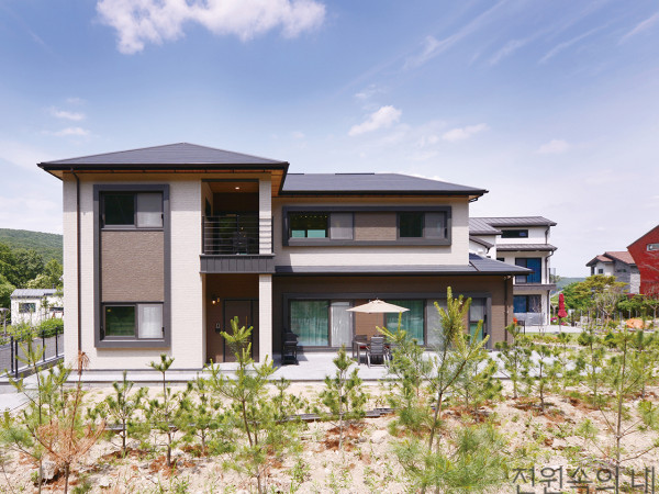 단정한 외관에 깔끔한 인테리어로 완성한 집. 남편의 오랜 설득 끝에 못내 시작한 집짓기지만, 지금은 본인이 더 좋아하게 되었다며 아내가 웃는다.ELEVATION 매스는 정원을 살포시 감싸는 ‘ㄱ’형태로 그리 복잡하지 않으면서도 2층 테라스와 지붕선을 통해 충분한 공간감을 제공한다.두 살 터울의 사춘기 남매를 슬하에 둔 결혼 19년 차 부부. 용인에 있는 24평 아파트 전세로 시작해 32평, 48평, 62평까지 조금씩 살림을 늘려 오던 어느 날, 남편은 집을 지어야겠다고 선전포고를 했다. 윗집의 층간소음이 참을 수 없는 지경에 이르렀고, 아랫집으로 진동이 전달될까 늦은 퇴근 후엔 안마의자도 못 쓰는 데다 꿈꿔온 로망을 더 이상은 미룰 수 없다는 이유와 함께.“그때까지도 살아보고 적응 못 하면 다시 아파트 갈 생각이었어요. 그래서 살던 집 정리도 안 하고 일단은 지어보기로 합의했죠.” 라며 집짓기를 시작한 배경을 밝혔다.모던한 스타일의 화이트톤 인테리어. 패턴이 있는 포세린 타일 바닥재와 TV 하부 미니 아트월이 포인트가 되어 준다. POINT 1 - 젠 스타일의 완성, 세라믹사이딩집의 형태나 배치만큼 분위기를 크게 좌우하는 것이 바로 외장재. 낮고 길게 빠진 지붕은 KMEW 네오블랙, 벽면에는 세라믹사이딩 브라운과 화이트를 적절하게 섞고 금속으로 프레임을 만들어 젠 스타일 외관을 완성했다.POINT 2 - 1층 포치, 2층 테라스외부와 내부 완충공간 역할을 하는 포치 상부에 2층 테라스를 두어 콤팩트하면서도 센스 있게 공간을 활용했다.‘올 수리 인테리어’를 하고 들어온 아파트를 두고 부부는 함께 정보를 찾아 나섰고, 여러 업체를 다녀 본 결과 건축박람회에서 만난 코원하우스가 파트너로 낙점됐다. 이들이 코원하우스를 고른 건 가격대나 디자인, 인지도 때문만은 아니었다.“집짓기에 대해 잘 몰라도 주변으로부터 조금씩 듣는 게 있잖아요. 처음에는 싸게 한다고 해 놓고 슬금슬금 추가 공사를 늘려 비용을 더 받는 곳들이 많다는 거죠. 그런데 코원하우스는 계약서가 아주 디테일해서 좋았어요. 설계·인테리어 담당자가 각각 배치되는데, 집 콘셉트 상의와 동시에 스위치며 손잡이며 미리 세세하게 정하고 들어갔어요. 당연히 추가 공사는 없었죠.”부부 동반 모임을 비롯해 집을 찾는 손님이 많아 야외 테이블세트만 4개를 구입했다. / 현관에도 별도의 창을 내어 낮에는 불을 켜지 않아도 밝다. 신발을 신을 때 편한 벤치는 이웃에게 받은 선물. 대지 높이차에 의해 주차장은 지하로 분리됐다.전체적인 외관은 일본주택 느낌이 나는 젠 스타일 모델을 고르고, 이에 어울리는 세라믹사이딩을 외벽과 지붕재로 선택했다. 1층은 남편이 원한 모던 스타일로, 2층은 아내가 원하는 클래식 스타일로 인테리어 콘셉트를 잡았다.HOUSE PLAN대지위치 ▶ 경기도 용인시대지면적 ▶ 525㎡(158.81평) │ 건물규모 ▶ 지하 1층, 지상 2층건축면적 ▶ 103.59㎡(31.34평) │ 연면적 ▶ 265.59㎡(80.34평)건폐율 ▶ 19.73% │ 용적률 ▶ 35.57%주차대수 ▶ 2대 │ 최고높이 ▶ 8.92m구조 ▶ 기초 – 철근콘크리트 매트기초 / 지하 – 철근콘크리트 구조 / 지상 – 경량목구조 외벽 2×6 구조목 + 내벽 2×4 S.P.F 구조목, 지붕 - 2×10 구조목단열재 ▶ 압출법보온판, 그라스울외부마감재 ▶ 외벽 – KMEW 세라믹사이딩 / 지붕 – KMEW 지붕재창호재 ▶ LG하우시스 3중 유리 유럽식 시스템창호철물하드웨어 ▶ 심슨스트롱타이설계 및 시공 ▶ ㈜코원하우스 02-554-8771 www.coone.co.kr62평 아파트의 주방에 익숙해 좁을 줄 알았는데 의외로 ‘ㄷ’자 동선이 콤팩트해 편하다고. 안방은 아내의 취향이 반영돼 클래식한 스타일로 꾸며졌다. 남편이 그토록 원하던 안마의자와 함께. POINT 3 - 자연스러운 진입 동선계단 하부의 데드스페이스를 최소화해 손님용 화장실로 쓰는 곳으로, 현관으로 들어와 손을 씻고 바로 각방으로 진입이 가능한 위치에 두었다.POINT 4 - 거실까지 소통하는 유리 파티션주방에서 일을 하다보면 소외되기가 쉬운데, 냄새나 소음 때문에 통합하기에는 고민이었다는 부부. 유리 파티션을 설치해 불편함은 덜고 시각적으로는 개방감을 주었다.POINT 5 - 남편과 아내의 드레스룸 분리보통은 안방에 부부의 드레스룸을 같이 두고, 자녀방에 각각 붙박이장을 설치한다. 그러나 의외로 부딪치는 것이 부부의 옷 정리 습관. 이를 미리 캐치해 남편과 아내의 드레스룸을 각각 분리했다.거실과 주방은 각각 데크로 이어지는데, 이는 시원하게 계획된 창으로 연결된다.원하는 것과 어울리는 것 사이에 충돌이 생길 때마다 인테리어 담당자가 조율해 결정을 도왔다. 평면은 사춘기인 자녀들과 동선을 구분하고, 출가 후 부부는 1층만 쓰는 것을 전제로 계획되었는데, 덕분에 아이들과는 훨씬 더 사이가 좋아졌다고.PLAN ①현관 ②거실 ③주방 및 식당 ④다용도실 ⑤방 ⑥화장실 ⑦드레스룸 ⑧가족실 ⑨데크 ⑩테라스 웨인스코팅 벽면과 아기자기한 조명이 빛나는 2층 가족실. 1층의 포세린 타일과 달리 헤링본 마루로 마감해 색다른 분위기다. INTERIOR SOURCE내부마감재 ▶ 벽 – LG하우시스 베스띠 실크벽지, 팬톤페인트 친환경 도장 / 바닥 – 코토 세라믹 포세린 타일, 구정