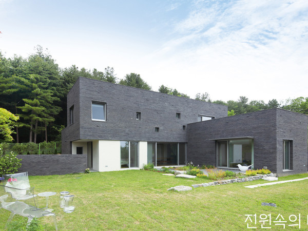 낮은 경사로를 올라 마주한 초록으로 둘러싸인 주택. 햇살이 살포시 내려앉은 벽돌집이 밤하늘의 별처럼 아름답게 빛난다.외부에서 바라본 주택의 전경 / 잿빛 벽돌 외관과 푸른 옷을 갈아입은 잔디 정원이 조화를 이뤘다. 양지 TG에서 내려 공장 풍경을 20여 분 더 감상하고, 마을에 이르는 길도 단번에 찾지 못해 여러 번 좁은 골목을 되돌아가는 수고를 거쳐 예정된 지번에 도착했다. 도로에는 짓다 만 주차장이 입구를 막아 도무지 안이 보이지 않고 주차장 높이만큼 땅은 성토되어 석축으로 쌓여 있었다. 상상과는 다른 실망스러운 여정. 시공을 중단하고 설계를 다시 하는 터라 손해가 크니 가능한 현재의 진행 상황을 반영해 달라는 부탁이 막막할 뿐이었다.대지를 가득 채운 성가신 여름 잡풀들. 짜증스레 도달한 대지의 한가운데서 앞(남쪽)을 바라보니 마을의 지붕들이 나지막이 펼쳐지고, 멀리 반짝거리는 저수지와 맞닿은 산들의 실루엣이 평온하기 그지없다. 뒤(북쪽)로 돌아서니 깊이를 가늠하지 못할 정도로 울창한 전나무 숲이 장엄하기까지 하고 그 옆(서쪽)으로 자작나무들의 수피와 잎사귀들이 태양에 빛나고 있었다. 그야말로 말로만 듣던 ‘황홀경’.SECTION ①현관 ②거실 ③주방 ④식당 ⑤창고 ⑥욕실 ⑦드레스룸 ⑧세탁실 ⑨가족실 ⑩방 ⑪데크 ⑫테라스 ⑬자쿠지 낮은 경사로를 오르면 마주하는 건물주택의 정면. 큰 창 앞에 놓인 아기자기한 미니 정원이 집을 더욱 돋보이게 한다.마냥 즐거워 대지를 돌아다니던 중 머릿속에 그림 한 장이 그려졌다. ‘여기다 투명한 공간을 놓고 마을과 마당 그리고 뒤쪽 전나무 숲을 하나로 이어야지. 그리고 아무것도 놓지 말자. 나머지는 어떻게 설계해도 땅이 다 받아줄 거야.’이 땅에는 집을 설계하는 것이 아니라 풍경을 설계해야 했다. 먼저 대지의 북쪽으로 치우쳐 단순한 ‘┗┓’모양의 매스를 놓고 벽을 몇 개 세웠다. 사각형 매스의 앞뒤로 뻗은 팔들은 집의 형태를 만들기보다는 풍경을 집 안으로 초대하거나 시선을 외부로 인도한다. 마당 여기저기에 놓인 벽들은 경계를 지을 요량이 아니라 집과 더불어 파노라믹한 원경을 분절하여 진입마당, 앞마당, 뒷마당, 비밀의 정원 등 마당의 특성을 결정짓는 역할을 한다.블랙 타일로 포인트를 준 현관 / 넓은 하부장을 제작해 이전 집에서 부족했던 주방 수납공간을 해결해주었다.이 집의 가장 중심이 되는 식당 공간. 큰 창이 앞뒤로 열려있어 어디서든 좋은 풍광을 감상할 수 있다. HOUSE PLAN대지위치 ▶ 경기도 용인시 | 대지면적 ▶ 810㎡(245.02평 | 건물규모 ▶ 지상 2층 | 건축면적 ▶ 187.57㎡(56.74평) | 연면적 ▶ 242.92㎡(73.48평) | 건폐율 ▶ 23.16% | 용적률 ▶ 23.94% | 주차대수 ▶ 2대 | 최고높이 ▶ 7.20m 구조 ▶ 기초 – 철근콘크리트 매트기초 / 지상 – 철근콘크리트 | 단열재 ▶ 경질우레탄보드 | 외부마감재 ▶ 삼한C1 치장벽돌 | 담장재 ▶노출콘크리트 쪼아내기 | 창호재 ▶ 이건창호 알루미늄 창호, 35mm 삼중로이유리 | 에너지원 ▶ LPG 조경 ▶ KnL 환경디자인 스튜디오(김용택) | 시공 ▶ ㈜GIP | 설계담당 ▶ 박준희, 임상일 | 설계 ▶ 에스아이 건축사사무소 정수진, 정우영식당에서 본 정원깔끔하게 꾸민 부부침실이미 지어진 밉살스러운 주차장은 그 너머에 무엇이 있는지 궁금하게 만드는 ‘열려라 참깨’가 되어 대문을 열면 벽과 나무 한 그루 사이의 좁고 긴 골목이 나타난다. 그 길을 오르다 보면 탁 트인 앞마당과 집의 전경이 서서히 드러나고 다시 그 길을 계속하면 현관에 이른다.현관은 다시 의문의 양 갈래의 길을 선택하게 한다. 왼편으로 보이는 거실의 남쪽 창으로는 이웃들의 지붕을 타고 시선이 흐르고, 커다란 서쪽 창으로는 단풍나무와 자작나무가 어느새 내 옆에 앉아 있다.안방과 연결된 욕실. 투명한 유리문이 공간을 확장시킨다. / 군더더기 없이 필요한 요소만으로 채운 2층 공간. 집 안 곳곳에 놓인 건축가가 직접 디자인한 가구들이 눈길을 끈다.현관 좌측으로 배치된 거실INTERIOR SOURCE내부마감재 ▶ 벽 – KCC 친환경 페인트 / 바닥 – 지복득 마루 | 욕실 및 주방 타일 ▶ 태왕세라믹, 윤현상재 수입타일 | 수전 등 욕실기기 ▶ 태왕세라믹 | 주방 가구·붙박이장 ▶ 일도노 가구 | 계단재·난간 ▶ 오크 + 평철난간 | 현관문·중문·방문 ▶ 제작 도어 | 데크재 ▶ 세성 석재산업 마천석PLAN ①현관 ②거실 ③주방 ④식당 ⑤창고 ⑥욕실 ⑦드레스룸 ⑧세탁실 ⑨가족실 ⑩방 ⑪데크 ⑫테라스 ⑬자쿠지 아름다운 2층 곡선 난간과 경치 좋은 창 앞 벤치에 앉아 책을 읽는 건축주의 모습2층 가장 안쪽에 배치된 침실이 집의 마님 격인 식당은 마을과 전나무숲 사이에 투명하게 앉아 전혀 다른 두 풍경을 양손에 쥐고 안도 밖도 아닌 연속된 시퀀스(Sequence)를 연출한다. 시원한 앞마당을 가진 투명한 이 식당에는 오로지 식탁과 사람만이 주인공이다.안방으로 들어서면 넓은 앞마당을 뚝 끊어버리는 야트막한 벽이 비밀의 정원을 보호하며 욕조에 누워 하늘과 별과 바람과 시를 읊조린다. 2층의 피아노 곡선 서재는 깊은 산중인양 인가의 흔적은 지우고 하늘과 닿아있다.거실 위 테라스에는 아담한 자쿠지가 자