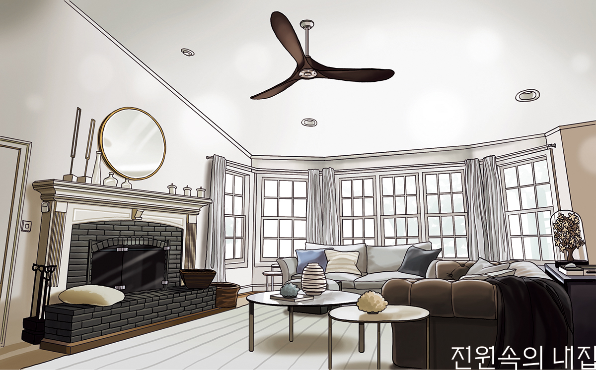 ▲ 조명의 위치를 고려해야 합니다. 최근에는 우물천장에 매립 간접조명을 시공 후 실링팬을 설치하는 경우가 많습니다. 실링팬이 돌아갈 때 조명이 깜빡여 보이거나 그림자가 생기지 않도록 적절히 위치 설정을 해야 합니다.