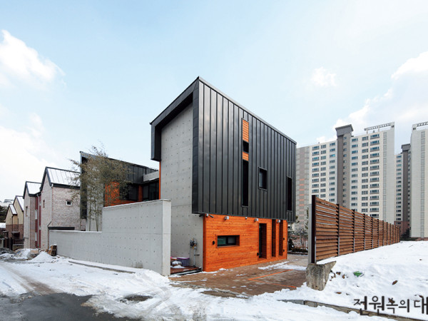 조용한 주택가 모서리 땅, 단정한 인상의 건물이 오롯이 섰다. 건축가의 고민과 건축주의 열의로 완성된 판교동 주택은, 지하 깊은 곳까지 빛을 머금은 따뜻하고 포근한 가족만의 공간이다.취재 김연정 사진 이남선 ▲ 삼면이 도로에 접한 코너에 삼각형의 조형성을 띤 주택 한 채가 들어섰다.▲ 외벽은 따뜻한 질감과 색상의 테라코타패널로 마감되었다.▲ 마당을 감싸 안은 집. 1층 내부는 안마당을 향해 개방된 시야를 갖는다. SECTION▲ 옥탑층과 연결된 외부공간은 가족만의 야외활동을 배려한 장소다.판교동 주택의 대지는 삼면이 도로에 접한 코너에 위치하여 건축가 입장에서는 건축물의 모습을 온전히 드러낼 수 있는 좋은 조건이었지만, 거주자의 입장에서는 사생활 노출의 우려가 있는 필지였다.설계에 있어서 우선적으로 고려한 사항은 건축물의 쇼윈도처럼 변해버린 판교 주택가에 또 하나의 색을 입히는 것이 아니라 무언의 존재감을 지닌 주택을 만드는 것이었다. 이를 실현하기 위해 최소한의 외장재를 사용하여 형태의 조형성을 강조하되, 이 조형성은 내부공간과 연계된 진정성을 지니도록 한다는 설계방향을 설정하였다. 외관디자인은 건물이 도로면에 나란히 배열되는 지루함을 탈피하고자 삼각형의 기하학적 조형을 도입하였다. 이는 반듯한 내부공간이 만들어질 뿐만 아니라, 2층에서는 삼각형의 재미있는 베란다 공간으로 변환된다. 주택의 외장재는 테라코타패널을 사용하였다. 이 패널은 다소 고가이지만 흙을 구워서 만든 친환경소재이고 따뜻한 질감과 색상을 지닌 자재이다. 특히 외관디자인 특성상 생긴 60°, 120° 등 일반적이지 않은 접합부위는 생산 공장에서 필요한 각도대로 자재를 커팅, 반입하여 깔끔하게 마무리했다. 조형적으로 하나의 덩어리처럼 보일 수 있게, 다락방 위 경사지붕 또한 테라코타패널로 디자인했었다. 그러나 국내에서는 이 패널로 지붕을 시공한 경험이 전무해 누수에 대한 염려를 하지 않을 수 없었고, 결국 시공과정에서 금속패널로 변경해야 하는 아쉬움을 남겼다.보통 주택의 가장 큰 매력이라 하면 대부분 ‘마당’을 꼽는다. 하지만 이 주택의 경우 볕이 잘 드는 남향이 도로면에 접한 데다 담장설치가 금지된 지역적 제약으로 건물을 최대한 도로면에 배치해야 했다. 따라서 건물은 마당을 감싸 안고 1층의 거실과 주방은 안마당을 향해 개방된 시야를 가진다. House Plan대지위치 : 경기도 성남시 분당구 판교로대지면적 : 228.1㎡(69평)건물규모 : 지하 1층, 지상 2층 + 다락 건축면적 : 112.57㎡(34.05평)연면적 :295.9㎡(89.50평)지상 - 202.4㎡ / 지하 - 93.5㎡건폐율 : 49.35%용적률 : 88.73%주차대수 : 2대최고높이: 9.85m공법 : 기초 - 철근콘크리트 매트기초 / 지상 - 철근콘크리트구조재 : 벽 – 철근콘크리트 / 지붕 - 철근콘크리트지붕마감재 : 금속패널단열재 : 벽 - T75 경질우레탄단열재 / 천장 - T200 압출법보온판특호외벽마감재 : Paneltek T18 테라코타패널창호재 : 커튼월 - 엘지창호 150㎜ AL 창호(로이1면, 3중유리) / 침실 - 엘지창호255㎜ PVC 이중창호(로이1면,복층유리) / 그외 - 엘지창호 70㎜AL 시스템창호(로이1면, 복층유리)설계 : ㈜스페이스목금토건축사사무소구조설계 : 모아구조시공 : ㈜모비덤▲ 긴 테이블과 펜던트 조명이 인상적인 주방과 식당 공간. 벽면 수납장은 주방용품의 깔끔한 정리·정돈을 돕는다.▲ 시선을 끄는 철골계단은 지하부터 옥탑까지 오픈된 4개 층의 연결고리가 되어준다.▲ 환한 햇살 덕분에 더욱 넓어 보이는 1층 거실 전경거실에는 2층까지 연결된 커튼월 창호를 설치하고 그 앞에 지하 1층부터 3층 옥탑까지 4개 층이 오픈된 보이드 공간이 위치한다. 이곳엔 철골계단을 놓아 내부공간의 연결고리가 됨과 동시에 주택으로서는 대담한 뷰포인트를 지니도록 하였다. 특히 ‘ㄷ’자 형태로 두 번 꺾인 철골계단은 구조계산에서부터 제작까지 쉽지 않은 과정이었다. 강성이 높은 토목용 스틸플레이트를 공장에서 레이저로 재단하고 조립을 마친 후 현장의 콘크리트골조에 매다는 방식으로 제작되었다. 이러한 시공법은 토목 관련 사업을 하는 건축주의 적극적인 도움으로 가능할 수 있었다. 빛을 가득 들인 철골계단은 지하층까지 연결되어 지하층 또한 음습하게 버려진 곳이 아닌 유용한 공간으로 활용하였다. 판교의 주택지는 대부분 필지가 크지 않은 관계로 지하층의 공간을 필요로 하는 경우가 많다. 따라서 터파기나 골조공사 등 만만치 않은 공사비를 생각하면 지하층에도 충분한 빛을 들이고 환기가 잘 되도록 하여 활용도 높은 공간으로 만들어야 했다. 이를 위해 남향의 도로면에 삼각형의 썬큰(Sunken)을 계획하였는데, 덕분에 안마당의 면적을 줄이지 않고도 썬큰을 통해 낮 동안 들어오는 온화한 빛이 지하공간을 더욱 풍요로운 모습으로 만들 수 있었다. Interior Source내벽 마감재 : 벤자민무어 페인트바닥재 : 가영세라믹스 욕실 및 주방 타일 : 가영세라믹스수전 등 욕실기기 : 아메리칸스탠다드, 동원 세라믹주방 가구 : 리첸조명 : 모노라이팅계단재 : 자체 제작현관문 및 방문 : 자체 제작붙박이장 : elfa, 이케아주택의 또 하나의 특징은 건축면