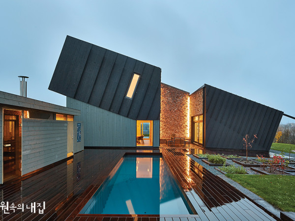 집의 외관이 결정되기까지 이유 없는 형태는 없다. 범상치 않은 모습으로 서있는 이 집 역시 기능을 우선시하고 지금의 모습을 갖췄다.취재 김연정 취재 사진 Bruce Damonte▲ 주택 정원에 배치된 수영장은 태양광으로 발생하는 여분의 열로 데워진다.▲ 남동쪽을 향해 적당히 기울어진 지붕에는 태양전지판과 집열판이 설치되어 있다.이 주택은 Snøhetta와 스칸디나비아의 최대 독립연구기관인 SINTEF(노르웨이 과학산업기술연구재단 : The Foundation for Scientific and Industrial Research), ZEB(The Research Center on Zero Emission Buildings)의 파트너 Brødrene Dahl 그리고 Optimera의 공동 협력 프로젝트다. 집의 볼륨은 하나의 단독주택의 모습을 하고 있지만, 이곳은 실제 거주를 위해서가 아닌 지속 가능함에 대한 해결책이 통합된 ‘에너지 플러스 하우스’를 짓기 위한 시범적 발판으로 계획된 것이다. 일단 ZEB-OM 분류기준에 들기 위해서는 최소한 이산화탄소를 100% 상쇄시키고 있음을 기록하고 증명해야 했다. 건물의 외피에 결합된 태양광 및 태양열 패널을 통한 재생에너지는, 발전소에서 화석연료의 연소로 발생되는 이산화탄소의 배출을 상쇄하도록 해준다. 이 방식은 다른 온실가스들의 배출 또한 동시에 줄일 수 있게 돕는다. 이처럼 건축 재료와 관련된 탄소배출에 집중하는 것은, 지속 가능한 건축을 향한 필수적인 요건에 있어 새로운 방향을 제시하기 때문이다. ▲ 집 한켠에는 채소 등을 가꿀 수 있는 소규모의 텃밭도 마련해 두었다. House Plan 대지위치 : Location Larvik, Norway 건물유형 : Zero Emission Demonstration Building대지면적 : 200㎡(60.5평)연면적 : 220㎡(61.10평)건축주 : Optimera and Brødrene Dahl(Saint Gobain) 설계 : Snøhetta http://snohetta.comSECTION▲ 벽돌과 목재로 마감한 내부 모습. 천창으로 자연광이 풍부하게 내려온다. ▲ 계단은 블랙 컬러의 철재로 통일하고 투명한 유리를 덧대어 깔끔한 인상을 준다.이 집은 남동쪽으로 기울어져 있고, 태양전지판과 집열판으로 덮인 경사지붕을 가지고 있다. 이러한 요소들은 땅속 지열 에너지와 함께 거주자가 집에서 사용할 에너지 필요량을 충족시키고, 일 년 내내 전기차의 동력을 공급할 충분한 여분의 에너지를 생산하게 된다. 채광, 조망 및 풍경 및 외부공간과의 접촉은 벽과 창문의 균형에 의해 조절된다. 냉난방은 방향, 집의 기하학적 모양과 부피, 역학적인 특성을 가진 재료 선택 등으로 수동적으로 해결할 수 있다. 내부에 사용된 재료들은 미적인 특성뿐 아니라 실내 온도와 공기의 질에 도움을 줄 수 있는 것을 기반으로 선택되었다. 난방 설비를 갖춘 안마당은 이른 봄부터 늦은 가을까지 야외에서의 식사를 위해 개방된다. 장작과 벽돌이 쌓인 외벽 덕분에 오두막집에 온 듯한 기분이 들기도 한다.정원에는 태양광으로 발생되는 열의 여분으로 데워지는 수영장 및 샤워장과 땔감으로 가열하는 사우나 그리고 이웃으로부터의 방어막 역할을 하는 저장고를 가지고 있다. 농장들과 마주하는 동편은 재생된 목재블록으로 마감해 매력적인 입면을 만들어낸다. 이 집은 비정량적인 부분에도 초점을 맞췄다. 즉, 감성적인 안락 및 행복의 요소들을 에너지 수요 못지않게 중요하게 다루고 있다. 과일나무와 채소 등을 가꿀 수 있는 소규모의 텃밭을 마련하여 언제나 수확의 기쁨을 만끽하며 즐길 수 있도록 한 것도 그런 이유다. ◀ 장작과 벽돌로 둘러싼 외벽 덕분에 오두막집에 온 듯한 기분이 드는 외부 공간 ▶ 2층에 위치한 침실은 높은 천장고로 인해 시원스런 개방감이 느껴진다.▲ 거실, 안마당, 주방이 모두 연결되어 있어, 거주자의 동선을 효율적으로 확보했다.PLAN – 1F / PLAN - 2FSnøhetta 건축집단노르웨이의 수도 오슬로에 기반을 두고 있는 국제적인 건축사무소로, 미국 뉴욕에도 사무실을 두고 운영 중이다. 노르웨이 특유의 자연을 담아내는 거대한 스케일과 모티브를 중심으로 건축과 환경, 인테리어 등에 다양한 시도를 적용하며 업계의 관심을 받고 있다. 내년에 완공 예정인 ‘부산오페라하우스’ 국제 설계공모전에 당선되어 국내에서도 곧 그들의 작품을 만나볼 수 있게 되었다.※ 월간 <전원속의 내집> www.uujj.co.kr 본 콘텐츠의 저작권은 (주)주택문화사에 있으며, 이를 무단 이용하는 경우 저작권법 등에 따라 법적책임을 질 수 있습니다.