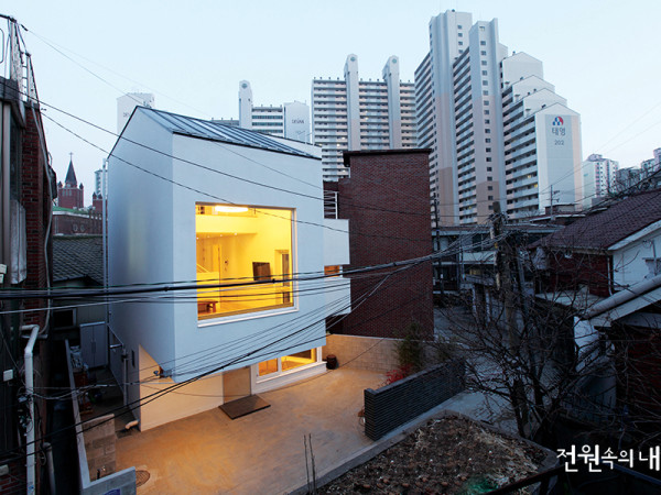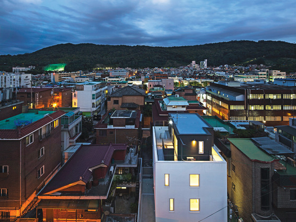 익숙한 동네, 늘 가던 재래시장, 함께 어울리는 친구들이 있는 곳. 건축주는 오래되고 불편한 옛집을 떠나는 대신 정든 동네와 새집을 택했다. 취재 정사은 사진 임준영▲ 서울의 가장 동쪽에 위치한 곳, 아름다운 망우산이 보이는 동네에 지어진 집이다.▲ 설비관과 우수관까지 건물 안으로 정리한 말끔한 외관의 화이트 큐브House Plan 대지위치 : 서울시 중랑구대지면적 : 122.20㎡(36.97평) 건물규모 : 4층 건축면적 : 73.22㎡(22.15평) 연면적 : 187.71㎡(56.78평) 건폐율 : 59.9% 용적률 : 158.5% 주차대수 : 자주식 3대 최고높이 : 11.5m 공법 : 기초 - 철근콘크리트 매트기초 / 지상 - 철근콘크리트 구조재 : 철근콘크리트 지붕마감재 : 방수마감 단열재 : 상부천장 - 비드법발포단열재 180㎜, 외벽 - 비드법발포단열재 90㎜, 내벽 - 스카이비바 30㎜ + 반사형단열재 6㎜, 하부바닥 - 비드법발포단열재 180㎜ 외벽마감재 : 스터코플렉스 외단열시스템 창호재 : 이건창호 72㎜ 화이트 PVC 3중 창호(35㎜, 일면 로이유리) 설계 : 건축공방 02-2038-3948 www.archiworkshop.kr 시공 : 공정건설㈜(아틀리에 기노채)▲ 옥상층은 아들 내외의 공간으로, 부모 세대와 분리된 동선과 그들만의 마당을 갖는다. ▲ 집의 이전과 현재 모습재개발 열풍으로 두어 차례 들썩였던 망우동. 이제는 주민들 자체적으로 재개발을 저지하는 분위기로 바뀌고 있다. 서울 시내에서 이런 지역은 지속해서 느는 추세이고, ‘팔고 나갈 사람은 이미 다 빠져나갔다’고 할 정도로 정리된 동네도 많다. 건축주가 30년 넘게 뿌리내리고 살아온 집을 허물고 자녀와 함께 살 집을 지으려 마음먹은 것도 재개발 지구에서 해제된 그즈음이다. “집을 짓기로 하고는 건축업자가 이틀 만에 그려준 도면을 받아봤는데 1층부터 4층까지 꽉꽉 채운, 임대만을 목적으로 한 집이더라고요. 아들 내외와 함께 살기로 하고 짓는 집인데 이건 아니다 싶었어요.” 사실 다가구·다세대 주택의 지상 과제는 최대한 빨리 짓고 잘게 쪼개 높은 임대 수익을 올리는 것이다. 그런 분위기에서 기천만원의 설계비를 지출하면서도 건축가를 찾을 생각을 한 건축주의 속마음이 궁금했다. 자신은 전문가가 아니니 한 번 시작하면 믿고 맡기는 것이 맞고, 기왕 지을 거 재량을 갖춘 사람에게 일임하자 결심했다는 건축주다. 마침 근처에 면적 욕심을 내다가 불법건축물로 판정돼 사용승인을 못 받고 있는, 소위 집장사가 지은 집이 있어 간접 경험을 한 차례 한 뒤였다. 그렇게 온 가족이 머리를 맞대 의견을 모으고 ‘건축공방’ 사무실 문을 두드렸다. “세 번을 여쭤봤죠. 어떤 집을 원하시는지. 첫째도 둘째도 셋째도 ‘따뜻한 집’이라 답하시더라고요” 심희준·박수정 건축가는 건축주와의 첫 미팅을 이렇게 기억한다. 얼마나 춥길래 그런가 싶어 허물기 전 옛집에 가봤더니, 연탄난로를 집 안에 들여놓는 위험천만한 일도 마다치 않을 정도로 단열이 안 되는 집이었다. 한겨울에는 실내 주방의 수도관이 얼 정도였다고 하니, 70년대 지어진 옛 조적조 주택의 열악한 거주환경을 가히 짐작할 만하다. 한 달에 25만원 난방비를 내면서도 내복에 조끼를 껴입고 버선까지 신고 살던 집이었기에, 건축주의 ‘따뜻한 집’에 대한 요구가 결코 과하게 느껴지지 않는다. 건축가의 고민은 사용하는 사람들이 불편하지 않으면서도 세대가 어우러져 사는 집, 여기에 건축비 일부를 충당해야 하니 임대세대도 함께 구성해야 하는 데서 시작했다. 이 복잡한 조건을 37평 작은 땅, 22평 협소한 건축면적에 풀어내는 건 더 큰 숙제였다. 옆 건물과의 좁은 간격으로 창문도 제대로 열 수 없는 조건, 주차면적의 확보, 일조권 사선 제한. 이런 모든 조건과 제약들을 버무려 삶의 질을 높일 수 있는 공간을 만들어야 했다. Interior Source내벽 마감재 : 친환경 벽지 바닥재 : 동화 강마루 욕실 및 주방 타일 : 논현동 유로세라믹수전 등 욕실기기: 논현동 유로세라믹주방 가구 : 세한싱크조명 : 논현동 계단재 : 고흥석 20㎜ 잔다듬현관문 : 단열도어방문 : 영림 슬라이딩 및 여닫이문붙박이장 : 세한싱크▲ 민원과 프라이버시 문제로 창을 낼 수 없는 측벽에 하늘 발코니를 만들어 채광과 통풍을 돕는다.▲ 요리를 즐기는 건축주를 위해 주방 찬장에 간접 조명을 설치하고, 냉장고와 각종 집기가 들어갈 공간을 넉넉히 확보했다.▲ 하늘 발코니와 면한 안방. 안방에서 발코니로 나갈 수 있도록 문을 냈다.1층은 주차장과 작은 창고로, 2층은 두 개의 임대 세대로 꾸리고 3층은 건축주 세대, 4층은 신혼부부인 아들 세대로 구분했다. 층별로 세대를 나누는 보편적인 방식과 함께, 전문가로서의 특수한 상황을 고려한 아이디어로 건물은 구성되어 있다.건축가는 집을 박스 형태로 만들어 패딩처럼 단열재로 따뜻하게 감싸고, 밖으로 난 창이 크지 않지만 늘 햇살이 드는 실내를 만드는 아이디어로 문제점을 하나씩 풀어나갔다. 우선, 정북방향 일조 사선제한으로 생기는 최대 면적을 기본 골격으로, 건물 틈으로 드는 햇볕을 최대한 실내로 들이기 위해 벽의 일부를 위로 뚫기도 하고 옆으로 밀어내기도 해 독특한 모양의 공간을 만들어냈다. 이렇게 만들어진 하늘 발코니