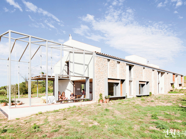 옛 시골집을 닮은 이곳의 시간은, 자연과 함께 천천히 흐른다. 건물 앞으로 주변과 열린 공간을 둔 것은 담담히 자연에 어울리고픈 가족의 마음이 반영된 결과다.취재 김연정 사진 Eugeni Bach▲ 대지를 가로지르는 긴 형태의 돌집은 그 모습 자체로 자연과 한데 어우러진다.▲ 창을 통해 주변 풍광이 한눈에 들어오는 높은 층고의 1층 내부주택은 최근 개발된 스페인 카마예라(Camallera) 외곽에 위치한다. 대지가 마을에 면하고 있어, 그 모습은 마을 내에서도 훤히 드러난다. 이 지역의 건축법규는 그렇게 까다로운 편은 아니었다. 신축 주택에는 그저 일반적인 특징만을 규정하는데, 예를 들어 석재로 외장마감을 한다거나 경사지붕을 ‘아랍(arab)’ 타일로 덮으라는 식이었다. 이러한 조례는 카탈로니아에서 신축 건물을 소위 ‘농가주택(masia)’이라 불리는 옛 시골집처럼 보이게 하려는 것이 주된 목적이다.이 프로젝트는 농가주택을 고립된 건물로 보지 않고, 전원적인 풍경을 배경 삼아 농지에 지어진 가치 있는 건축물로 생각하고자 했다. 진정한 농업적 맥락이 없는 전통 카탈로니아 주택이라면 의미가 없을 것이며, 단 10만 평방미터의 면적에 비슷한 주택만 스무 채 있다면 그 특별함도 훨씬 덜할 것이다. 따라서 전통적인 농가주택을 똑같이 따라 하기보다, 주변의 농장 창고들과 연계를 만들어내는 등의 또 다른 유형으로 촌락과 관계를 맺도록 설계 방향을 잡아나갔다.이 집의 공간구성은 창고의 논리를 따르는데, 커다란 입체를 만들고 그 속에 더 작은 유닛들을 밀접하게 배치하는 식이다. ‘창고’ 내 ‘상자’ 안에 침실과 주방 및 욕실을 배치하고, 그 사이를 가로지르는 시야와 동선은 집 주변의 풍경과 직접적인 관계를 만들어낸다.▲ 벽으로 가리지 않은, 외부로부터 열린 공간은 가족과 그들을 찾아온 지인들이 공유하는 쉼터가 된다.▲ 외벽의 프레임이 푸른 자연을 액자 속 그림처럼 담아낸다.House Plan 대지위치 : Camallera, Girona, Catalonia, Spain대지면적 : 300㎡(90.75평)견적사(QS) : Eulalia Cudola설계협력 : Carina Silva, Sara Matias, Albert Cabrer구조설계 : Masala consultors시공 : Calam-Tapias Construccions설계 : Anna & Eugeni Bach http://annaeugenibach.comSECTIONPLAN - 1F▲ 캐노피는 1층에서는 시원한 그늘을, 2층에서는 탁 트인 시야를 제공한다.▲ 늘 따사로운 햇살이 집 안 깊숙이 들어오고, 열린 창은 내·외부 경계를 허물었다. ▲ 깔끔한 인테리어와 벽을 활용한 공간 아이디어가 돋보인다.집 내부의 동선은 늘 외부 공간에 밀접하게 연결된다. 공용 공간은 높이도 높거니와 외부와 직접 관계함으로써 마치 항상 열린 공간에 있는 듯한 느낌을 주며, 주변의 풍경과 자연을 만끽하게 해준다. 이러한 아이디어에 따라, 이 집은 한쪽 끝에 빈 공간을 두었다. 이 외부 공간을 덮는 캐노피는 그늘과 시야를 제공할 뿐만 아니라, 외부에서 다시 집의 중심 공간이 된다. 아울러 집은 저에너지 건물로 설계되었다. 여름철 입면의 작은 개구부들과 북향 천창들로 맞통풍(Crossed Ventilation)을 유도하여 에어컨 없이도 집 안 온도를 쾌적하게 유지시켜 줄 시스템을 계획했다. 겨울철에 대비하여 벽두께와 단열을 더했고, 태양전지판과 연결된 고성능 우드칩 히터는 난방과 온수 기능을 모두 제공한다. 빗물은 지하저수조에 집수되었다가 정원과 화장실에 ‘재활용수’로 쓰인다. 시공을 위한 재료들은 모두 지역의 생산업자와 공급업자로부터 수급하였다.PLAN - 2F▲ 나무 바닥과 흰색 천장, 붉은 벽돌을 쌓아올린 벽면이 조화를 이뤘다.▲ 미닫이문을 여닫음으로써 내부는 언제든 공간변형이 가능하다.▲ 깔끔하게 타일로 마감된 욕실Anna & Eugeni Bach 건축가핀란드 출신의 Anna Bach와 스페인 출신의 Eugeni Bach가 운영하는 건축사무소로, 현재 스페인 바르셀로나에 기반을 두고 있다. 인테리어와 산업디자인을 비롯하여, 도시 계획에 이르기까지 건축과 관련한 다방면에서 활약 중이다. 그 능력을 인정받아 유럽의 여러 매체에 작품이 소개되었고, 다수의 건축상도 수상했다.※ 월간 <전원속의 내집> www.uujj.co.kr 본 콘텐츠의 저작권은 (주)주택문화사에 있으며, 이를 무단 이용하는 경우 저작권법 등에 따라 법적책임을 질 수 있습니다.