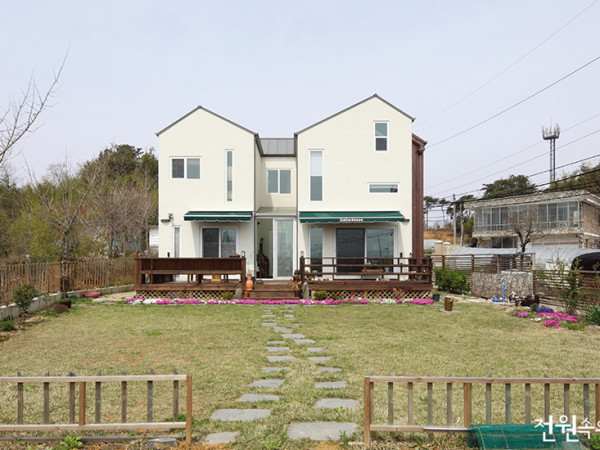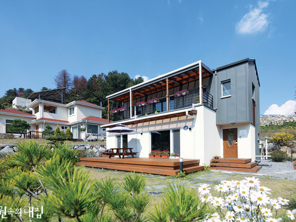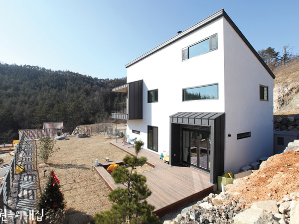 다다(DaDa)는 딸 다영이의 애칭이다. 어린 시절 주택살이를 좋은 기억으로 간직했던 부부가 아이에게도 특별한 추억을 심어주고자 지은, 가족의 첫 집을 만났다.취재 김연정 사진 변종석▲ 마치 두 집이 사이좋게 붙어 있는 듯 깔끔하게 시공된 외관이 눈길을 끈다. ▲ 노란색으로 포인트를 준 현관문. 북쪽으로 주출입구를 둔 것이 이 집의 특징이다. ELEVATION아직도 그때를 잊지 못한다. 그동안 아파트에서만 지내온 가족이 처음 주택으로 이사 온 날, 모두의 얼굴엔 웃음꽃이 활짝 피었다. 이곳에 온지 벌써 2년이 흘렀지만 매순간 바뀌는 창밖 풍경은 아직도 여전히 새롭기만 한 가족이다.건축주 김태주 씨가 집을 짓기로 결심한 건 다른 무엇보다 하나뿐인 딸을 위해서였다. 어린 시절 좋은 추억이 가득했던 주택 생활을 더 늦기 전에 딸에게도 고스란히 전해주고 싶었다. 마음을 정한 후에는 지을 집에 대한 공부도 게을리 하지 않았다고 한다. 인터넷을 뒤지고 본지를 정기구독하며 꿈의 실현에 한 발짝 더 다가서기 위해 애썼다.마음을 정하고 나니 모든 일은 순조롭게 진행되었다. 직장에서 멀지 않은 작은 시골마을에 적당한 터를 발견하곤 바로 계약을 감행했고, 그동안 눈여겨보았던 시공업체인 코에코하우징을 찾아가 시공을 맡겼다. “사실 처음 본 대지는 이곳이 아니었어요. 저 아래 땅이었는데, 주인이 갑자기 팔지 않겠다고 통보했죠. 당황하고 있을 때, 마침 이 땅이 눈에 딱 들어온 거예요. 위치도 정말 좋았죠. 지금 생각하면 처음 땅을 못산 게 천만다행이 아닐 수 없어요(하하).”건축주가 구입한 대지는 남북으로 길고 동쪽에 도로가 있는 150평이 조금 넘는 터였다. 대지레벨은 도로보다 높았지만 북쪽 끝이 도로와 같은 레벨로 평평했다. 동쪽 도로에서 집으로 진입하기엔 너무 협소하다는 제약이 있어, 설계를 맡은 권태신 건축사는 과감히 북쪽에 주차공간과 주출입구를 배치하는 아이디어를 냈다. ▲ 2년 차에 접어든 주택살이다보니 정원도 어느 정도 구색을 갖추게 되었다. 데크 아래 올망졸망 핀 꽃들이 정원을 더욱 돋보이게 한다. ▲ 주방에서 바라본 거실. 높은 층고 덕분에 아파트와는 차별되는 공간감이 느껴진다.집은 두 개의 분리된 매스로 이루어져 있다. 때문에 아직도 두 세대가 함께 사는 집이냐는 오해를 받기도 한다고. 이는 땅콩집의 형태를 염두에 두고 있던 건축주가 외관에 그 모습이 반영되길 원한 결과이기도 했지만, 공간의 배치를 고려했을 때도 적절한 선택이었다. 아담한 형태로 나뉜 주택은 여러 가지 크기의 창 덕분에 다양한 표정을 갖는다. 백색의 외벽과 차분한 색상의 컬러강판 지붕은 태양 아래서 더욱 선명히 그 형태를 드러낸다. 외부 디자인이 그대로 투영된 내부는 자연소재를 섞어 약간의 변화를 주었다. 일단 현관문을 열면 아담한 온실과 남쪽 풍경이 중첩되면서 방문자를 맞이한다. 현관은 매스와 매스 사이에 배치되어 전이공간으로의 역할을 부여받았다. 온실을 중심으로 거실 등 공적인 공간과 안방 및 이동 공간으로 실을 크게 분리하였고, 이는 2층 공간까지 나눠주는 기준이 되었다.“다육식물이 가득한 이 온실은 딸과 함께할 수 있는 저의 취미공간이에요. 작은 베란다를 벗어나 이렇게 좋아하는 식물을 키울 공간이 생겨 얼마나 기쁜지 몰라요. 온실 덕분에 집이 더욱 밝고 포근해 보이죠.” House Plan대지위치 : 전라북도 완주군 삼례읍대지면적 : 519㎡(156.99평)건물규모 : 지상 2층건축면적 : 90.18㎡(27.27평)연면적 : 148.28㎡(44.85평)건폐율 : 17.38%용적률 : 28.57%주차대수 : 1대최고높이 : 7.60m공법 : 기초 - 철근콘크리트 매트, 줄기초 / 지상 - 경량목구조구조재 : 벽 - 외벽 2×6 구조목 + 내벽 / 지붕 - 2×8, 2×10 구조목지붕마감재 : 컬러강판외벽마감재 : 스터코플렉스, 컬러강판단열재 : 이소바 그라스울, 50㎜ EPS창호재 : 미국산 시스템 창호설계 : ㈜예일건축사사무소시공 : 코에코하우징 1599-4169 www.coeco.co.krPLAN – 1F / PLAN - 2F▲ 주인의 애정어린 손길이 묻어나는, 다육식물이 가득한 온실◀ 현관에 들어서면 가족이 가장 좋아하는 공간인 온실과 마주하게 된다. ▶ 주방 한편에 마련된 다용도실은 안주인의 편의를 고려해 배치되었다.처음 계획할 때만해도 온실은 단지 안주인을 위한 공간이었지만 이제는 가족 모두가 가장 좋아하는 곳이 되었고, 집을 방문하는 지인들도 하나같이 부러움을 전한다.천장까지 오픈된 탁 트인 거실과 주방, 다용도실을 서로 통합하고 온실을 기준으로 반대편에 부부공간을 둔 것이 1층의 배치라면, 2층에는 건축주가 원했던 AV룸과 딸의 침실, 그리고 딸을 위해 마련한 아늑한 다락방이 위치한다. 거실 상부의 오픈된 공간을 통해 다락방으로 발걸음을 옮기다 보면 눈높이에 맞춘 창들이 언제나 가족에게 창밖의 그림 같은 풍경을 보여준다.▲ 거실 상부에 마련된 다락공간은 딸의 공부방으로 활용된다. ▲ 기능에 충실하여 깔끔하게 꾸며진 AV룸은 건축주가 늘 바라왔던 공간이다.▲ 2층에 위치한 딸아이의 방. 한쪽 벽면을 그린 컬러의 벽지로 마감해 산뜻하다.▲ 건축주 부부와 이 집을 설계한 권태신 소장이 담소를 나누는 모습Interior Sourc
