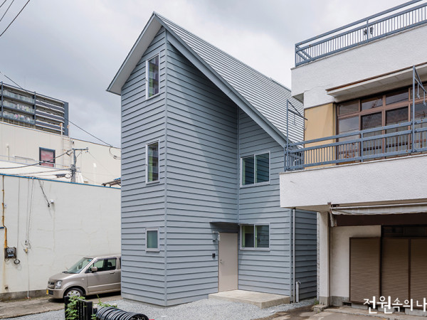 “두 세대는 서로 다른 라이프스타일을 가지고 있습니다. 하지만 소통이 가능한 한 건물 안에 있음으로 인해 집안 전체 분위기를 서로 공유하고, 그들의 관계를 더 소중하게 여기게 될 것입니다.”취재 김연정 사진 Shinzawa Ippei주택은 도쿄에서 신칸센으로 한 시간 거리인 군마현 다카사키市에 위치한다. 집이 지어진 대지는 전면이 6m, 깊이가 13m인 길고 좁은 땅의 모양을 하고 있었다. 남측에는 폭 4m의 도로가 있고, 북동쪽으로는 추모공원과 접해 있으며 그밖에 주변은 3층 높이의 주택들로 둘러싸여 있다. 건축주는 부모님과 함께 거주할, 채광과 환기 모두 잘 되는 두 세대용 주택을 짓길 원했다. 1층은 계단을 오르내리기 힘든 연로하신 부모님의 공간으로, 2층과 3층은 건축주 부부와 그들의 자녀 공간으로 설계했다. 주거 지역과 인접한 곳에 공공장소(열린 공간)인 추모공원이 자리하고 있다는 점을 감안하여, 가족들의 프라이버시를 확실하게 확보하는 것과 함께 이전보다 더 나은 생활 환경을 조성하고자 하였다. 창은 채광과 환기가 일정하게 유지되는 북측에 세 층의 계단통(Stairwell)쪽으로 내었다. 디자인 측면에서 이 주택의 포인트는 집 전체를 덮고 있는 ‘지붕’이다. 두 세대의 동거를 상징하는 이 지붕은 처마를 남쪽으로 확장하여 차양의 역할까지 겸할 수 있도록 했다. 또한 직사각형 평면 구조와는 달리, 비스듬하게 가로질러 설치된 슬래브 빔(Slab Beam)을 가지고 있다. 빔의 내부에는 기둥을 설치하지 않았고, 이는 콤팩트한 내부공간에 배치된 각 실들이 기둥에 의해 단절되지 않고 서로 소통하도록 하기 위함이다. 덕분에 집은 개방적인 열린 공간을 제공받았다.개방형의 계단, 열을 맞추지 않은 자유로운 빔, 그리고 이 모두를 덮는 지붕으로 건물 전체를 연결함으로써 주택은 완성되었다.SECTION▲ 어머니가 사용할 소박한 주방 공간▲ 현관으로 들어서면 2층으로 올라갈 계단이 바로 연결된다.◀ 작은 창을 곳곳에 내어 답답함을 최대한 덜었다. ▶ 실용적인 1층 드레스룸. 쓸모없는 공간을 활용한 아이디어가 엿보인다. 1층 부모님 세대 - 계단을 오르내리기 힘든 부모님을 배려하여 1층에 노부부의 공간을 배치하였다. 현관을 함께 사용하기 때문에 두 세대가 불편함을 느낄 수 없도록 각 실을 구성했다. 현관문을 열고 들어서면 바로 아들 부부가 거주하는 2층과 연결된 계단이 위치한다. 그 안쪽으로 욕실과 드레스룸 등 사적인 공간을 두었고, 계단 우측에 침실, 거실, 부모님 두 분이 사용하기 적당한 작은 주방을 일렬로 놓아, 움직임이 편리한 동선을 구축했다.PLAN – 1F / PLAN – 2F / PLAN - 3F▲ 3층에 마련된 발코니는 집의 채광을 돕는 장치로 사용된다.▲ 아들 부부의 프라이버시를 고려해 침실은 주방을 지나 안쪽으로 배치했다. ▲ 오픈된 평면 구조를 가지는 내부 전경House Plan대지위치: Takasaki city, Gunma, Japan대지면적: 83.17㎡(25.15평)건물규모: 지상 3층건축면적: 44.99㎡(13.60평)연면적: 108.59㎡(32.84평)공법: 목구조구조설계: Shin Yokoo / OUVI설계: SNARK(Sunao Koase, Naoki Mashiyama)+OUVI(Shin Yokoo) www.snark.cc시공: Miyasitakougyou2, 3층 아들 부부와 자녀 세대 - 감각 있는 젊은 부부의 라이프스타일에 맞춘 동선과 분명한 취향을 반영해 채운 인테리어가 눈길을 끈다. 아이들과 함께 생활하는 만큼 기능적인 부분에 초점을 맞췄다. 1층에서 올라오면 거실과 주방이 한눈에 들어온다. 넓지 않은 면적이지만 높은 층고 덕분에 탁 트인 공간감을 선사한다. 부부의 침실은 1층 전실 위로 배치하여 공적인 공간과 따로 분리된 느낌을 주었고, 이로 인해 그들의 프라이버시도 존중할 수 있었다. 3층에는 아이 방과 가족의 야외활동을 배려한 발코니를 두어 햇빛이 잘 들어오게 했다.※ 월간 <전원속의 내집> www.uujj.co.kr 본 콘텐츠의 저작권은 (주)주택문화사에 있으며, 이를 무단 이용하는 경우 저작권법 등에 따라 법적책임을 질 수 있습니다.