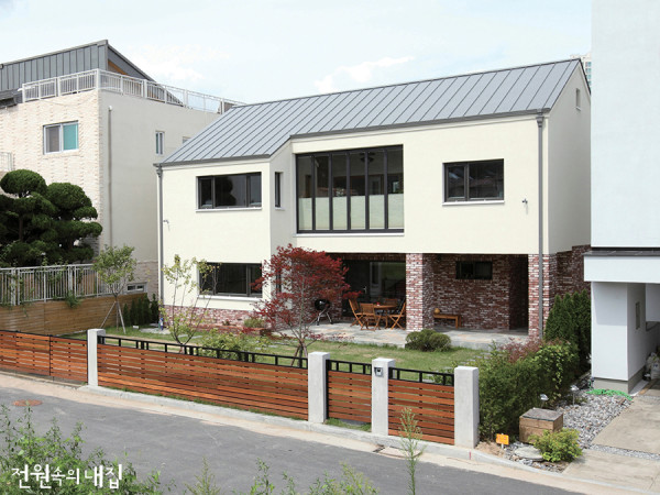젊은 건축주들이 전원주택에 눈을 돌리는 이유는 대개 어린 자녀를 위해서다. 타인에게 피해를 주지 않고 마음껏 뛰어놀 수 있는 실내공간은 물론, 마당에서 야외활동까지 가능하니 얼마나 매력적인가.취재 임수진 사진 변종석▲ 대지 양옆으로 큰 다가구주택들이 들어선 탓에, 다른 건물들과 조화를 이루는 동시에 사생활 보호가 되도록 계획해야 했다.▲ 잔디를 심어 꾸민 마당HOUSE PLAN대지위치 : 경기도 화성시 반송동대지면적 : 285.20㎡(86.27평)건물규모 : 지상 2층건축면적 : 104.40㎡(31.58평)연면적 : 168.00㎡(50.82평)건폐율 : 36.6% 용적률 : 60.7%주차대수 : 2대최고높이 : 8.9m공법 : 기초 - 철근콘크리트 줄기초, 지상 - 경량목구조구조재 : 벽 - 2×6 구조목, 지붕 - 2×10 구조목지붕마감재 : 컬러강판단열재 셀룰로오스외벽마감재 : 스터코, 고벽돌창호재 : 독일식 kommerling 시스템창호설계 : 홈플랜건축사사무소시공 : 브랜드하우징집짓기를 고민하는 많은 이들처럼 꿈나무집의 건축주도 ‘왜 집을 지으려 하는가’에 대한 근본적인 물음을 스스로에게 던졌다. 편의를 위해 아파트를 더 선호하는 생활방식을 뒤로 하고, 단독주택을 선택한 이유는 무엇일까. 단순한 호기심이나 막연히 꿈꿔왔던 집에 대한 욕심, 멋진 테라스와 마당 때문에 주택생활을 결심한 것은 아니었다. 집을 어떻게 짓느냐보다 왜 짓는지에 대해 곰곰이 생각하다 보니 결론은 ‘생활습관을 바꿀 수 있는 집’에 이르렀다. TV와 컴퓨터 게임에만 몰두하는 가족들의 평소 생활방식, 항상 바쁘다는 핑계로 아이와 놀아주지 못하는 아빠의 행동패턴을 바꾸어줄 공간이 필요했다. 가족 모두가 사용하는 거실 공간 외에 자녀들이 책을 보거나 마음껏 뛰어놀 수 있는 놀이 공간을 하나 더 두기로 했다. 마당 역시 현관 가까이에 모래놀이를 할 수 있는 자리를 마련하고 여름이면 간이 수영장을 펼칠 수 있도록 궁리했다. 또한 카페에서 커피를 마시거나, 유명한 음식점을 찾아가 외식을 하거나, 한 달에 한두 번 주말 캠핑을 하고 영화관 혹은 도서관에 가서 문화생활을 즐기는 일반적인 가족의 여가생활 패턴이 집 안에서 다 이루어질 수 있도록 계획하여 다양한 기능을 충족시키기로 했다.▲ 대지 특성상 초기에는 중정형 디자인으로 출발하였으나, 여러 제약으로 인해 외부공간을 끌어안는 중정형의 장점만을 살려 심플한 형태로 완성했다.▲ 옥외공간이지만 실내처럼 사용할 수 있는 데크◀ 현관의 한쪽 벽에 창과 벤치형 수납장을 두어 밝고 편안한 장소가 되었다. ▶ 계단 하부 역시 아이들을 위한 공간으로 활용되었다.▲ 거실과 주방이 연결되어 있지만 천장 마감을 달리하여 공간에 변화를 주었다.Interior Source내벽 마감재 : 에덴바이오 벽지, 친환경페인트바닥재: 센마루 라임 001욕실 및 주방 타일 : 세진타일 수전 등 욕실기기 : VOVO주방 가구 : 오벤조명 : 을지로 모던라이팅계단재 : 애쉬목현관문 : 코렐 단열현관문에스피 플레이트, MS24, 카마게 오크(색상)방문 : 예다지 기성도어 + 도장붙박이장 : 오벤데크재 : 철평석 슬레이트 타일간결한 매스의 건물은 대지의 후면으로 물러나 배치되어 있다. 뒤쪽 부지에는 주택이 아닌 어린이공원과 놀이터가 있어서 건물을 공원 쪽으로 최대한 붙일 수 있었고, 그만큼 넓은 마당을 얻게 되었다. 대문에서 현관까지는 디딤돌이 동선에 맞게 이어져 있는데, 현관 바로 앞쪽에는 모래놀이 공간을 두고 뚜껑도 만들어 덮었다. 건물 외관은 설계 과정에서 가장 아쉬움이 남는 부분 중 하나다. 본래 전체적으로 고벽돌을 사용하고자 했던 건축주의 바람을 살리지 못한 것이다. 대지가 속한 지역이 블록형 단독주택지여서 전체 단지 분위기에 적합하지 않은 외관의 색채는 받아들여지지 않았다. 결국 단지 기준에 맞춰 고벽돌과 스터코, 컬러강판을 적절히 적용했다. 다소 단순한 지붕선을 높게 올려 이웃한 건물 사이에서 왜소해 보일 수 있는 우려를 해결하였다. 1층 공간은 개방형 거실과 주방을 기본 구조로, 아이들의 놀이터로 쓰이는 응접실 겸 가족실을 현관 바로 앞에 계획하였다. 현관을 들어서기 전에 필로티로 된 휴식공간이 있는데, 가족실의 전면창과 연결되어 여유를 더한다. 자녀가 방과 후 테라스와 가족실에서 놀이시간을 보내고 나면 도서관 격인 거실에서 책을 읽을 동안 주방에서는 간식이 만들어지는 그림이다. 저녁시간 이후에는 2층의 야외 테라스에 올라 폴딩도어를 오픈하고 티타임을 즐긴다. 3개의 침실로 구성된 2층에 부족한 가족실 역할을 겸하는 공간으로, 굳은 날씨에는 텐트를 설치해 가족들의 임시 캠핑장으로도 변신하는 활용도 높은 반외부공간이다. “아이들이 즐거워하는 모습을 볼 때, 새집을 지은 보람을 가장 크게 느낍니다. 저 역시 아침에 일어나자마자 마당에 나와 찬찬히 둘러보는 것이 일과가 될 정도로 주택에서의 생활이 정말 좋네요.”지난해 여름 입주하여 새로운 단독주택에서 여름과 겨울을 보낸 건축주 가족. 친척 아이들까지 놀러 와 신나게 즐기는 사진을 보여주는 그의 모습에서 가족뿐 아니라 이웃과 함께하는 여유로운 집을 실현한 만족감이 담뿍 느껴진다.▲ 안과 밖의 접이